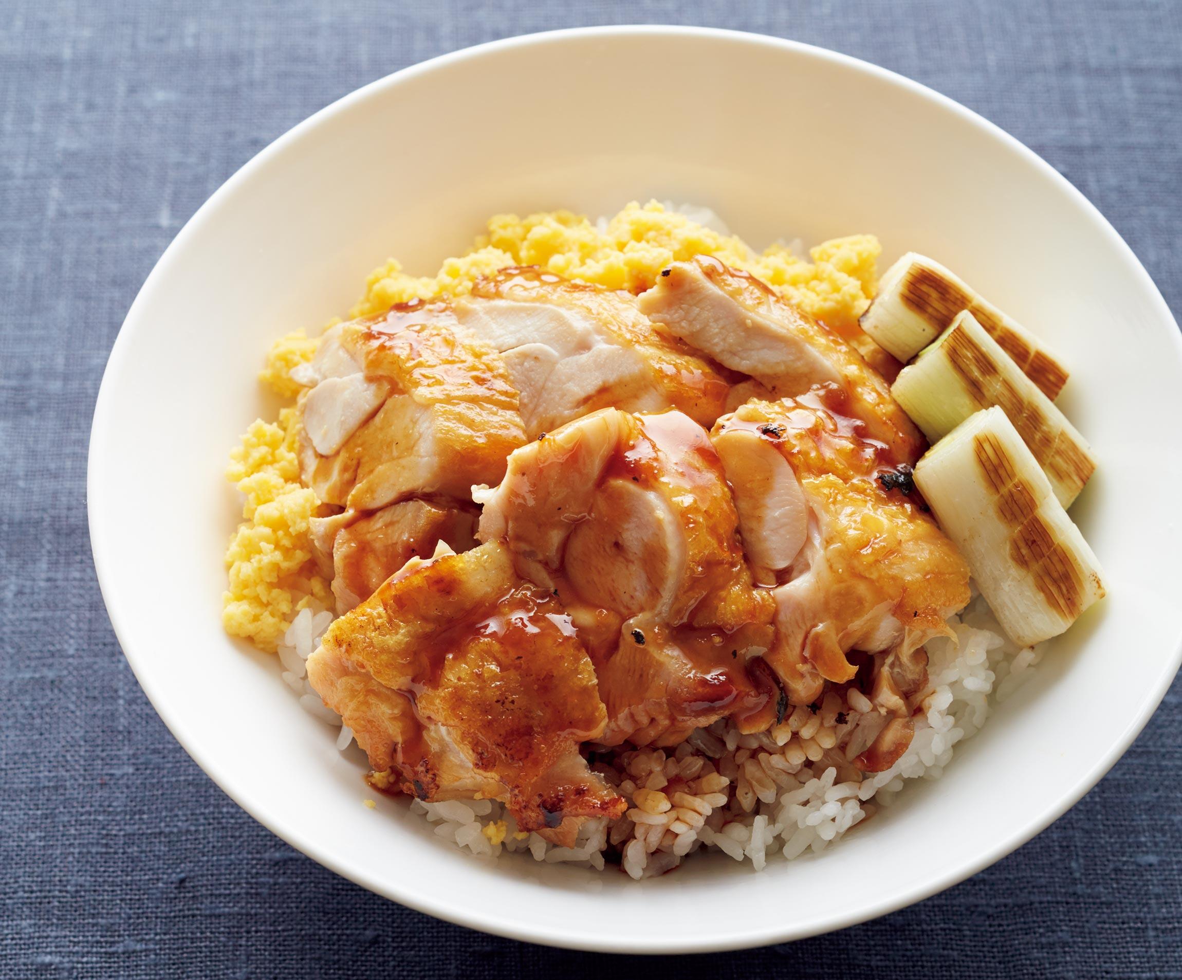調味料と生姜汁を加え、スプーンで汁をかけながら、汁が少し残るくらいまで味をからめる。鶏肉を取り出して縦半分に切り、幅1cmのそぎ切りにする。器に熱いご飯を盛って炒り卵、ねぎ、鶏肉をのせ、残った汁をかける。
