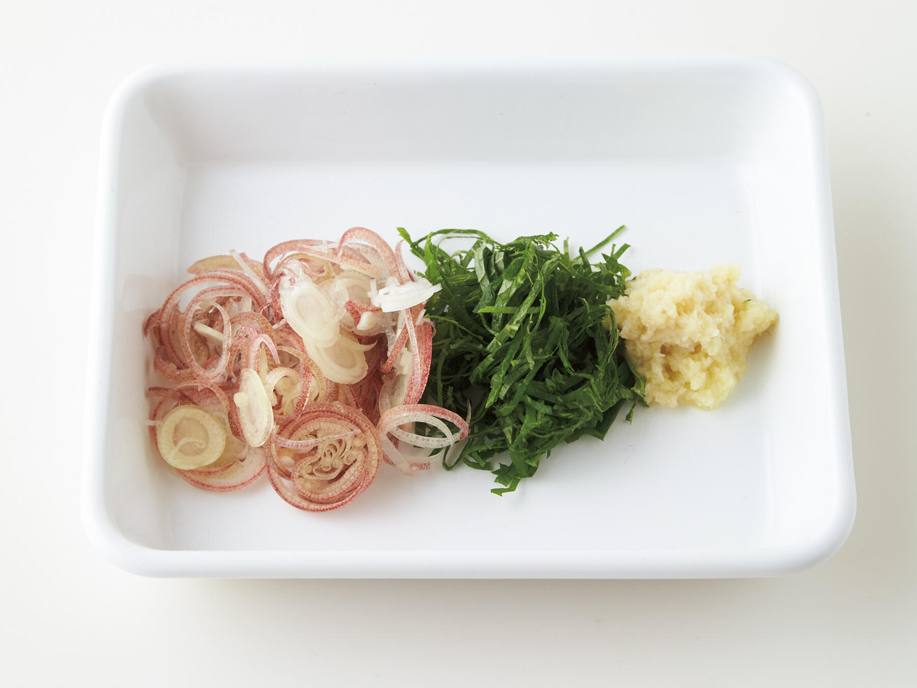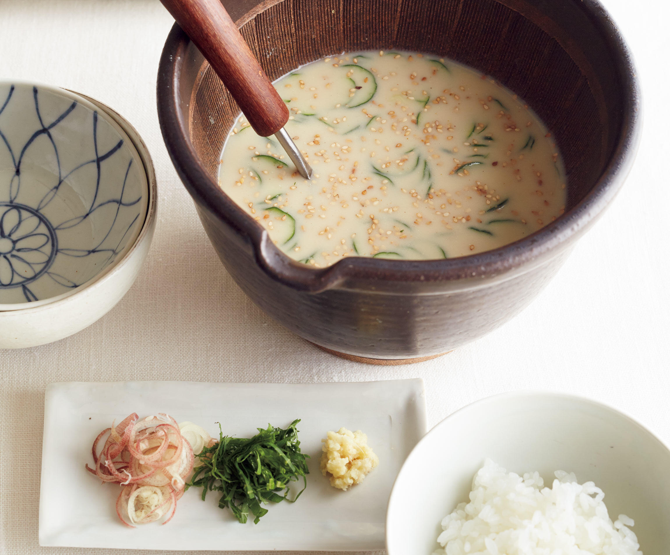 みょうがは薄い輪切りにして、冷水にさらしてぱりっとしたら 、ザルにあげて水気をきる。青じそは縦半分に切ってからせん切りにする。生姜は皮をむいてすりおろす。冷や汁に胡麻を加え、器に盛ったご飯にかけて薬味をのせる。