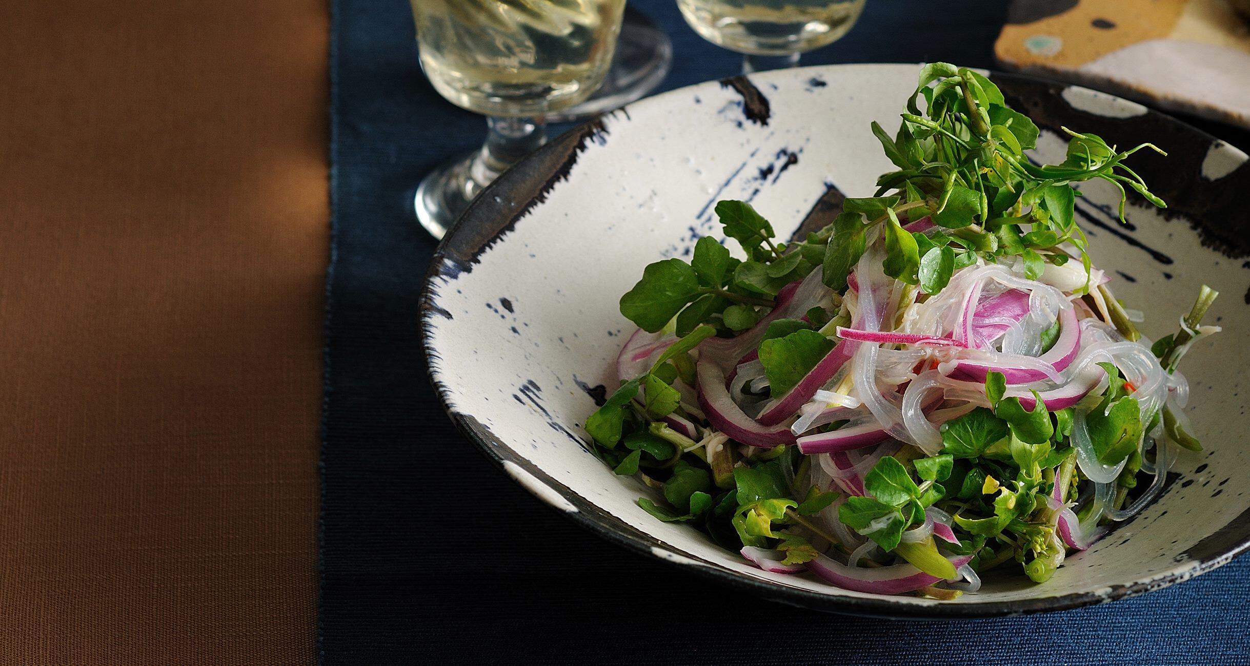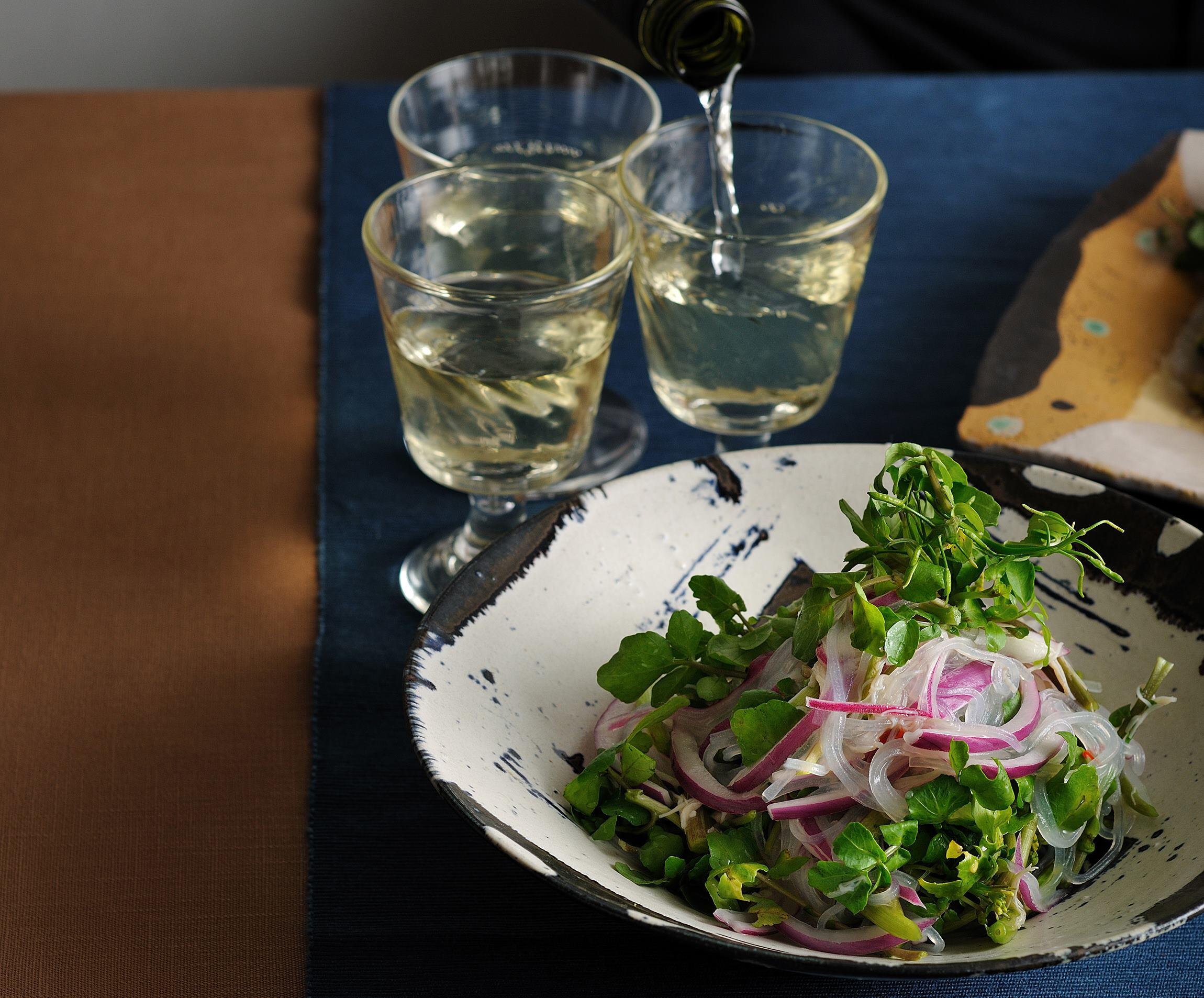 通常、ヤムウンセンの味つけは、ナムプラーとレモンが同率だが、今回は帆立缶の汁が入るので、ナムプラーはあくまでも風味つけ程度に。なければ淡口醤油でも。クレソンの代わりにセロリや春菊を入れるのもオツ。