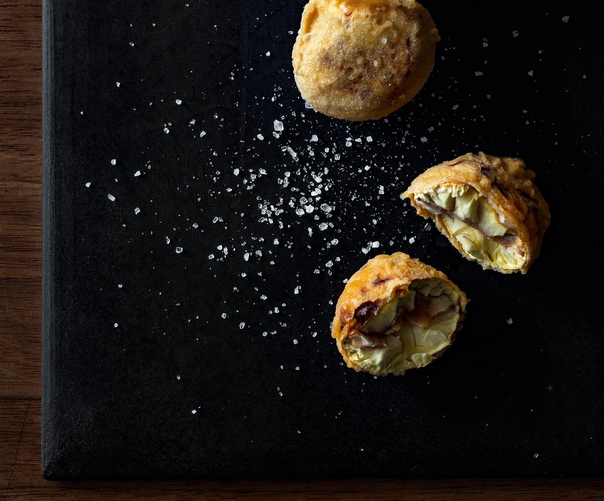 2の栗を3の衣にくぐらせ、170℃の油で15分ほどかけてじっくり揚げる。油からあげ、揚げ網で1~2分油をきると、さくっとした食感を楽しめる。岩塩をふる。