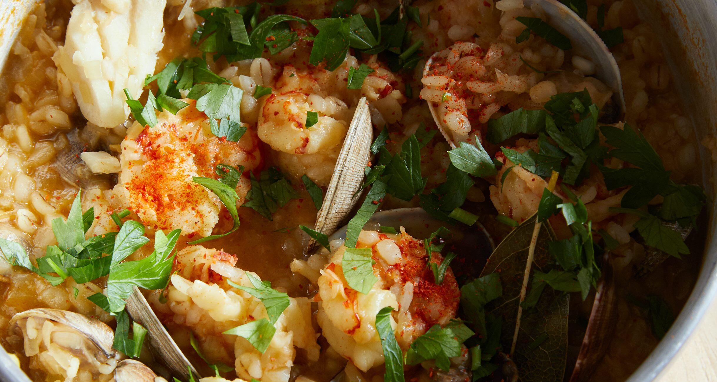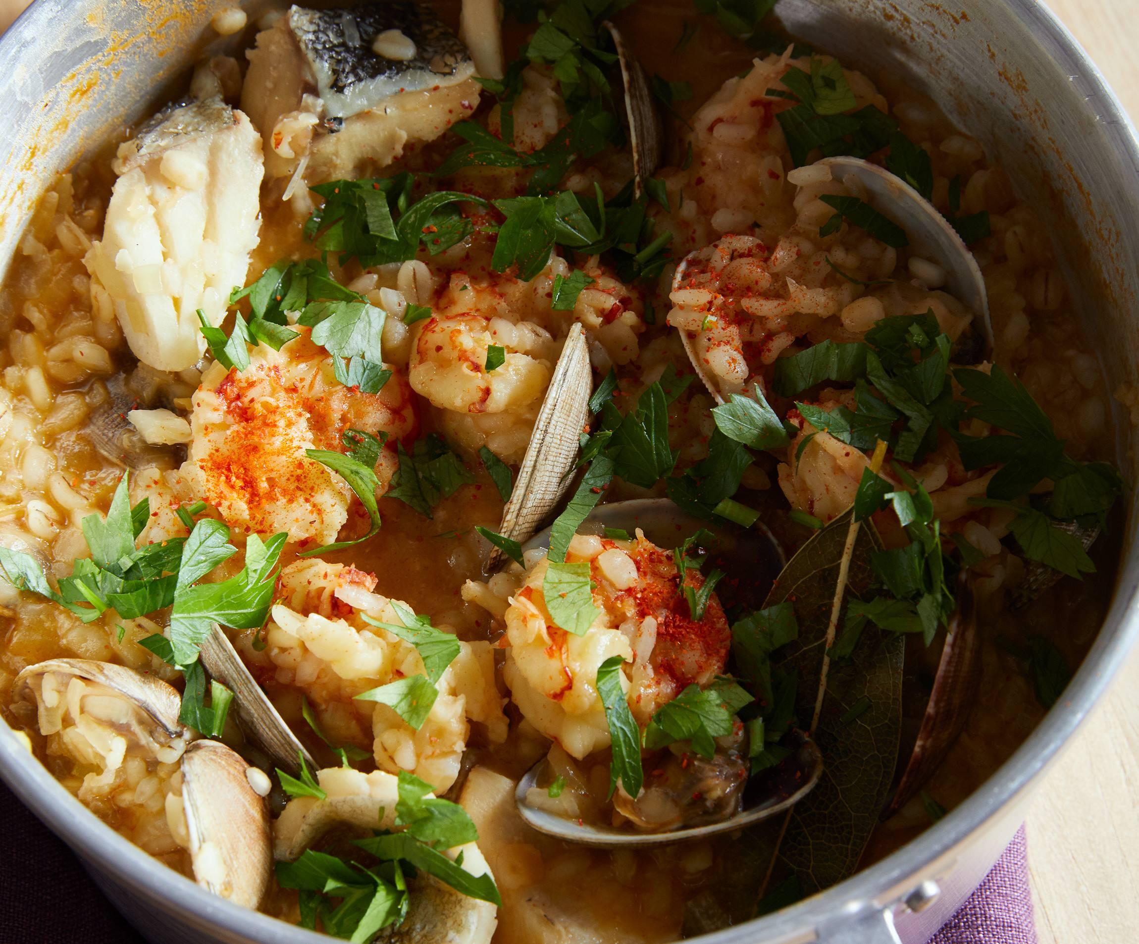 海老の色が変わったら米と押し麦を加えてさらに炒める。米がもったりと重たくなったら2のスープ500mlとローリエ、塩を加えてざっと混ぜ、あさり、白身魚をのせる。スープは多めにできるので、残りは味つけをしてそのままスープで楽しんでも。