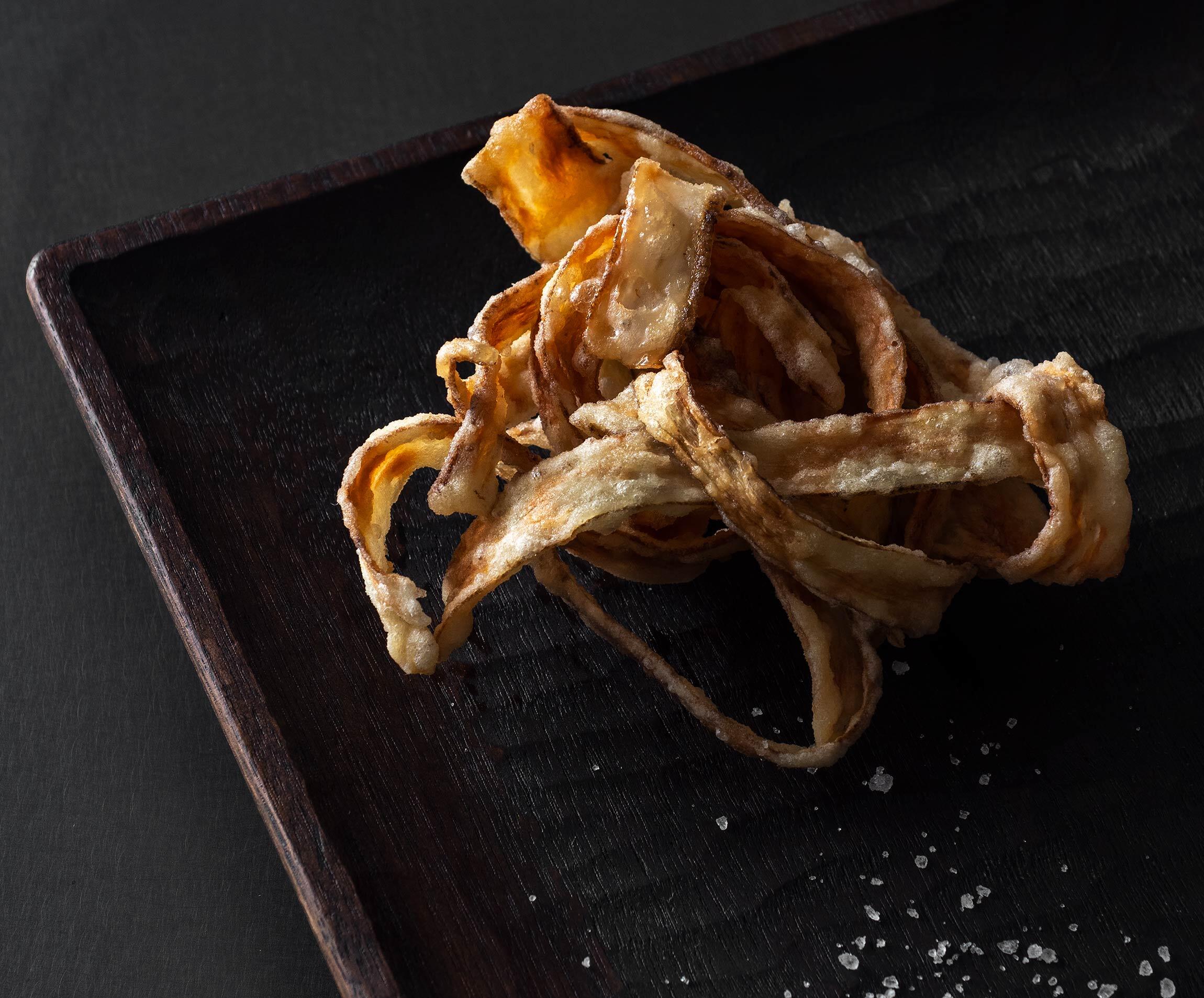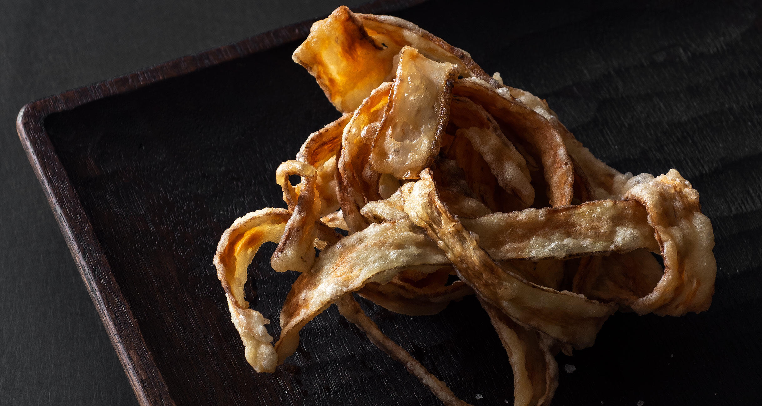 ごぼうを薄くスライスして揚げると、カリカリと止まらなくなるつまみが出来上がります!器と料理の組み合わせを提案する店「カモシカ」を主宰するオカズデザインさんに、器の紹介と、その器を引き立たせる、目にも舌にもおいしいレシピを教わりました。