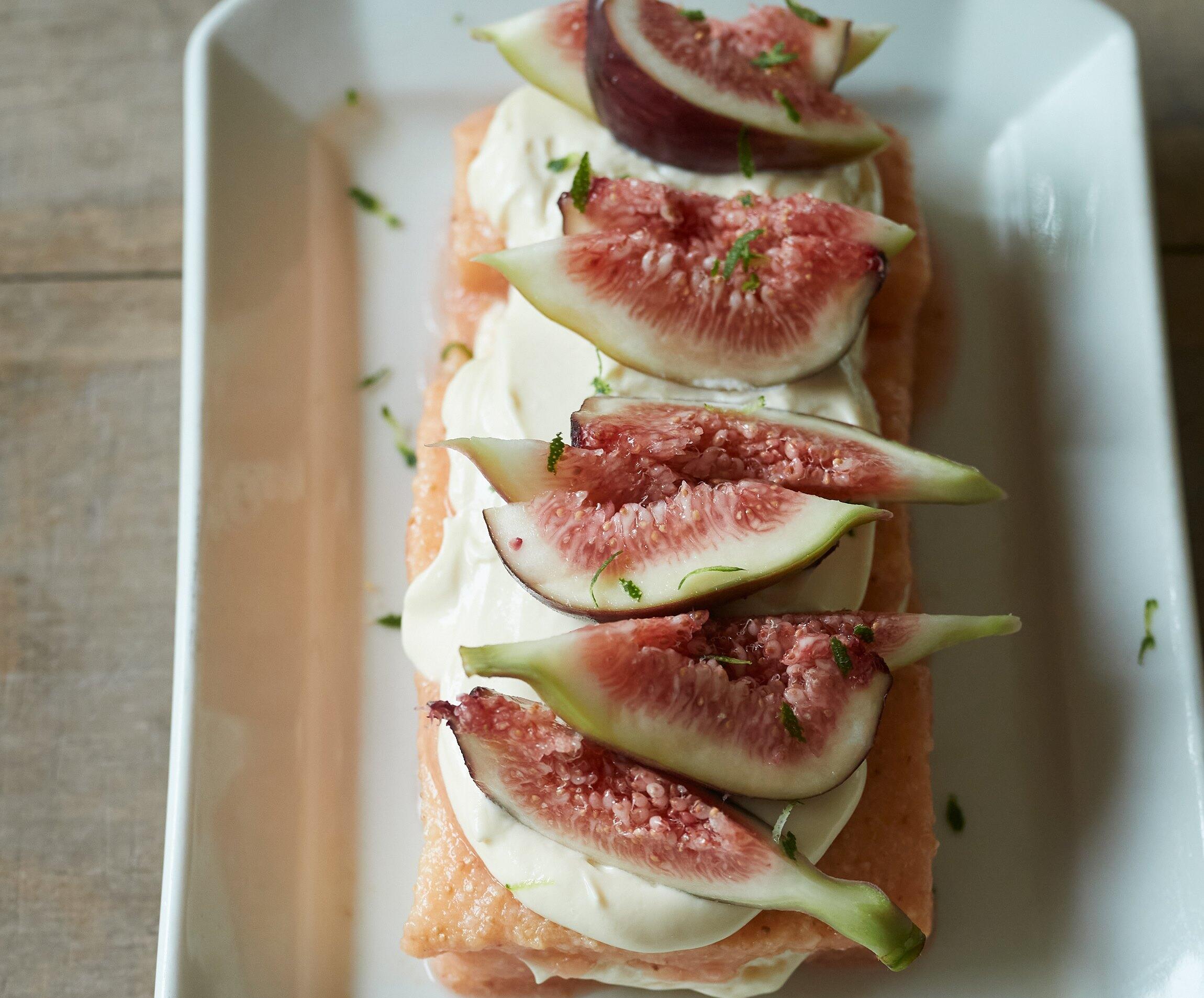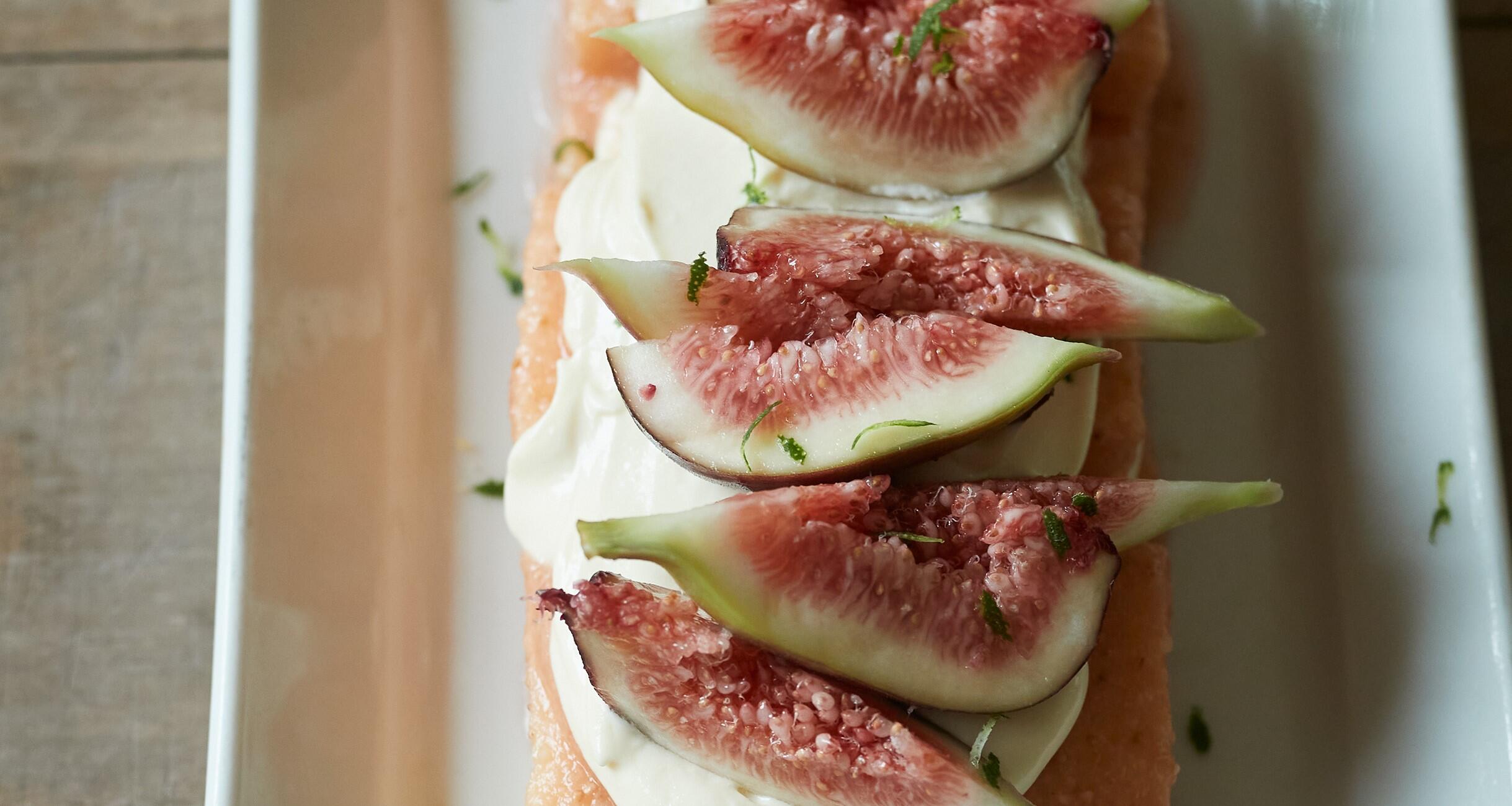 残りのチーズクリームをのせ、いちじくを縦に一口大に切ってのせる。すだちの皮をすりおろす。