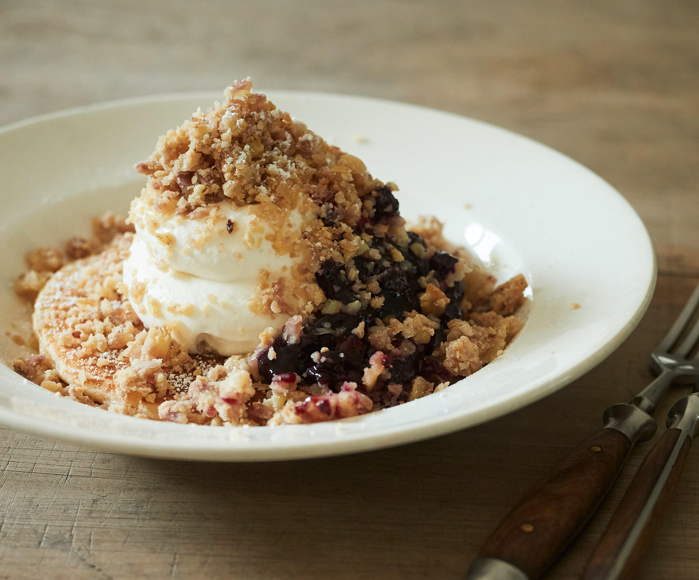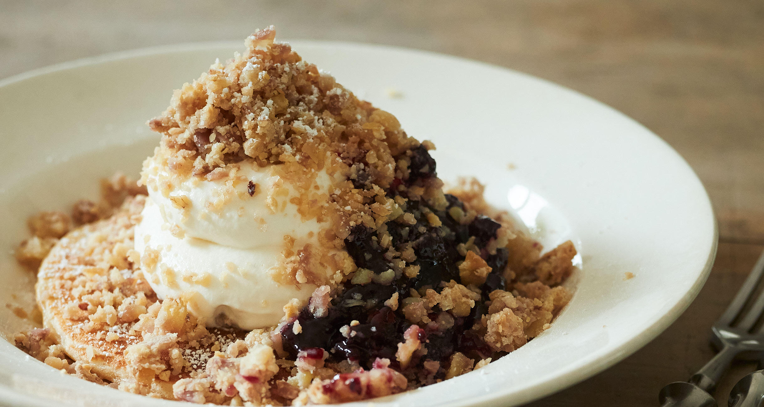 パンケーキを土台に、八分立てにした生クリームと細かくした栗をたっぷりとのせた気軽につくれるモンブランです。キッチンから甘い香りが漂って、出来上がりが待ち遠しい。そんな秋の実りを楽しむおやつを料理家の中川たまさんに教えてもらいました。