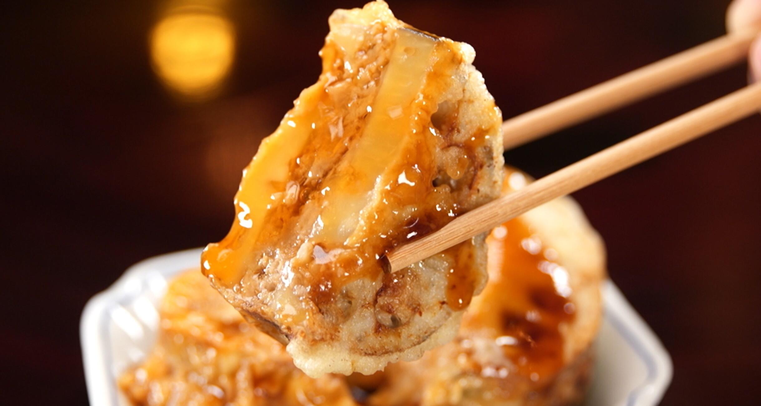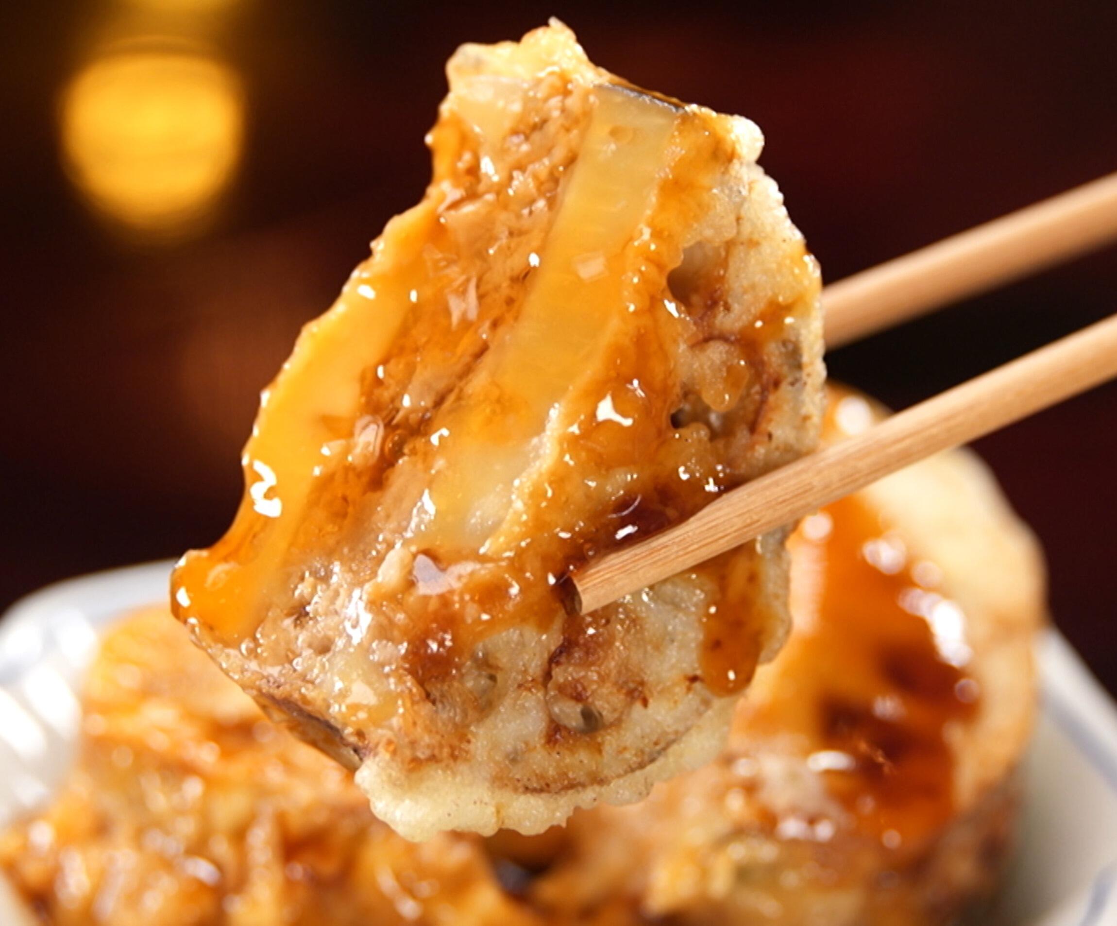小麦粉と水を混ぜた衣をつけ、170℃の油で約3分揚げる。