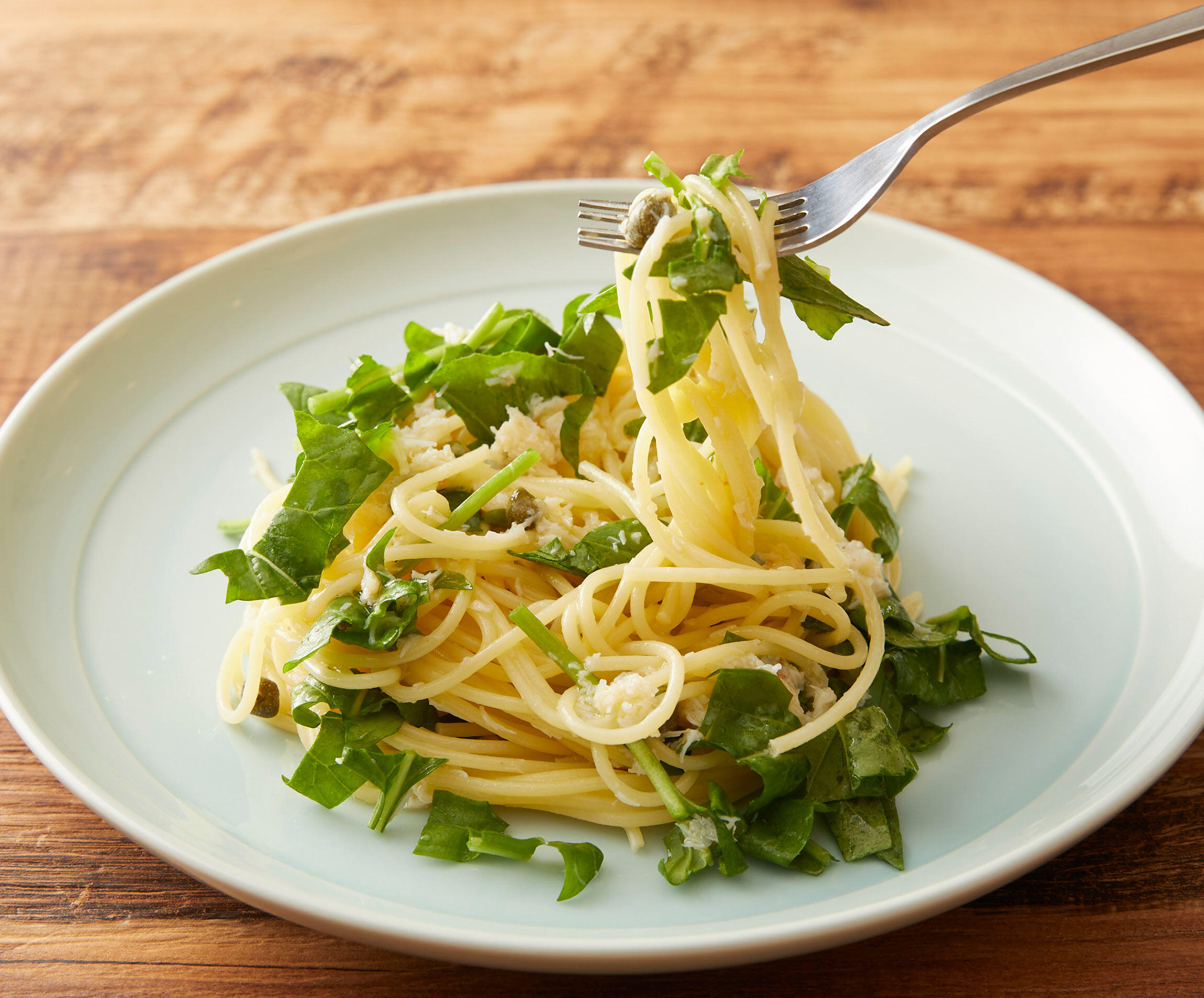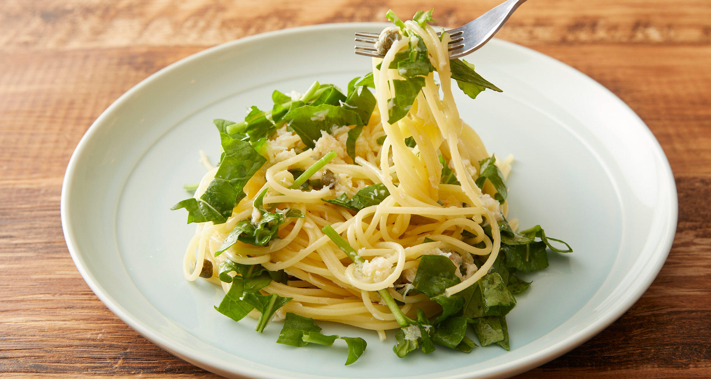 カニの身をホジホジしたりするのも大変なので、カニ缶を使っていますが、缶詰と言っても侮るなかれ、ワインヴィネガーをちょろっと加えるだけで、ぐんっとフレッシュな味わいになります。カニ缶ってなかなか使う機会がないなって方は、ぜひパスタで食べてみてください。ルッコラが苦手って方は、長ネギや大葉、ミョウガとかを代わりに使っても和風な感じで楽しいです。
