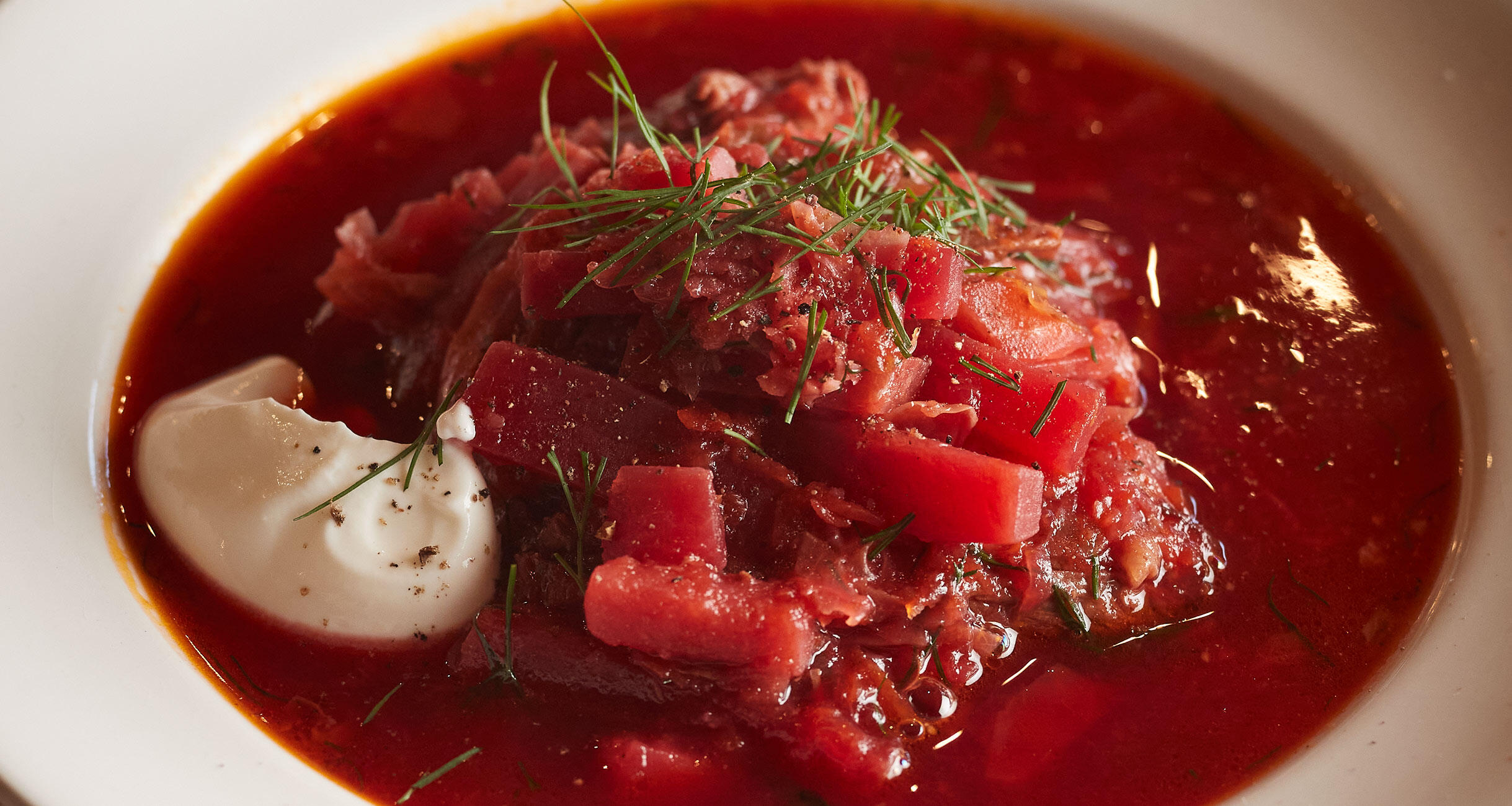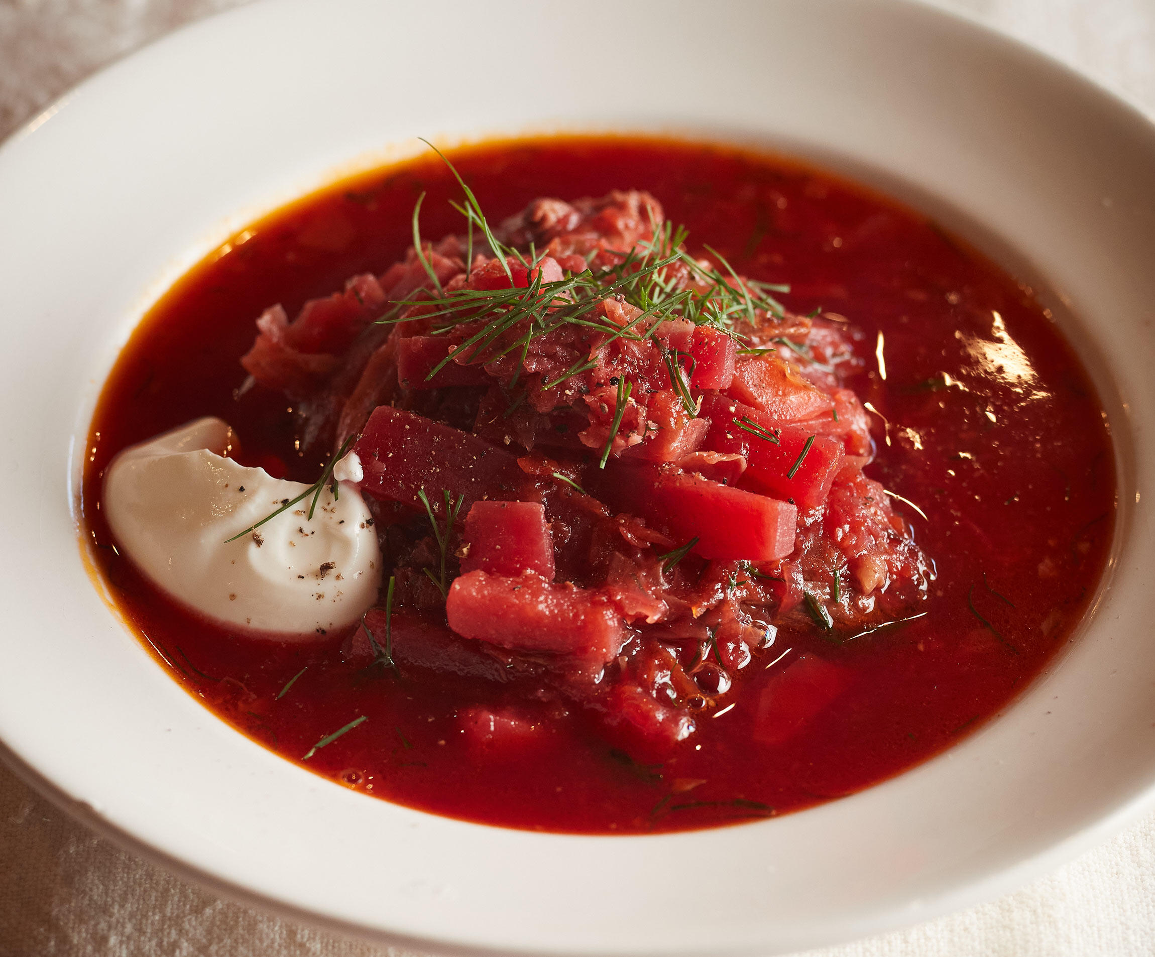 ここで紹介するのは、ロシアの家庭料理でもあるボルシチ。牛肉の旨味が溶け出たスープは、あっさりとしていながらも奥行きのある味わい。ビーツ、玉ねぎ、にんじん、じゃがいも、キャベツと野菜もたっぷり入るのが魅力です。