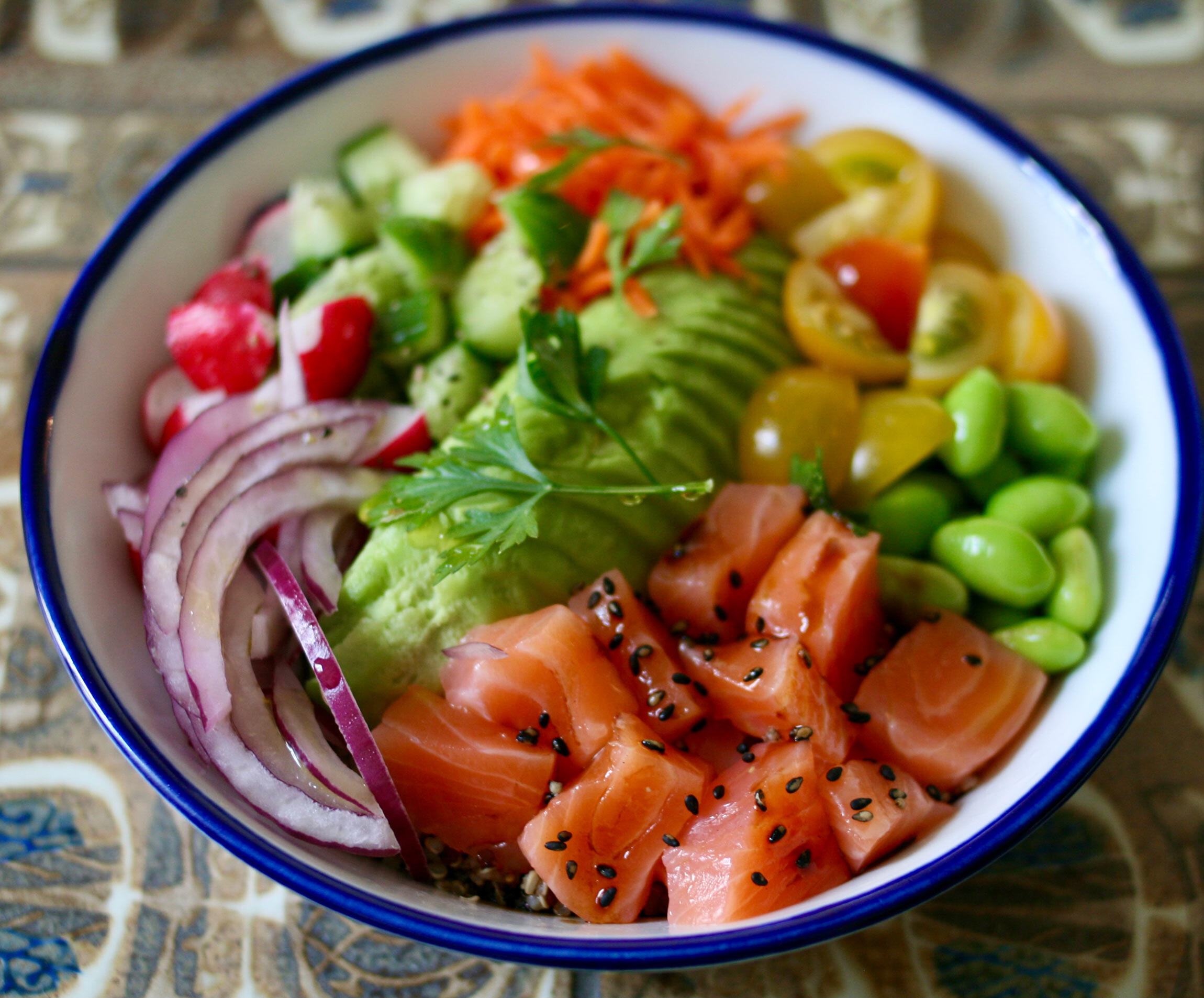 そこで今回は、切り身丼のようなポケ・ボウルではなく、野菜サラダとして食べることが出来る「ポケ・ボウル・サラダ」を一緒に創作してみたい。パリで流行りのキノア入りのポケ・ボウル・サラダは実に健康的な一皿と言えるだろう。一人暮らしのぼくのような人間には心強い栄養の味方でもある。しかも、めっちゃ美味いのだ。