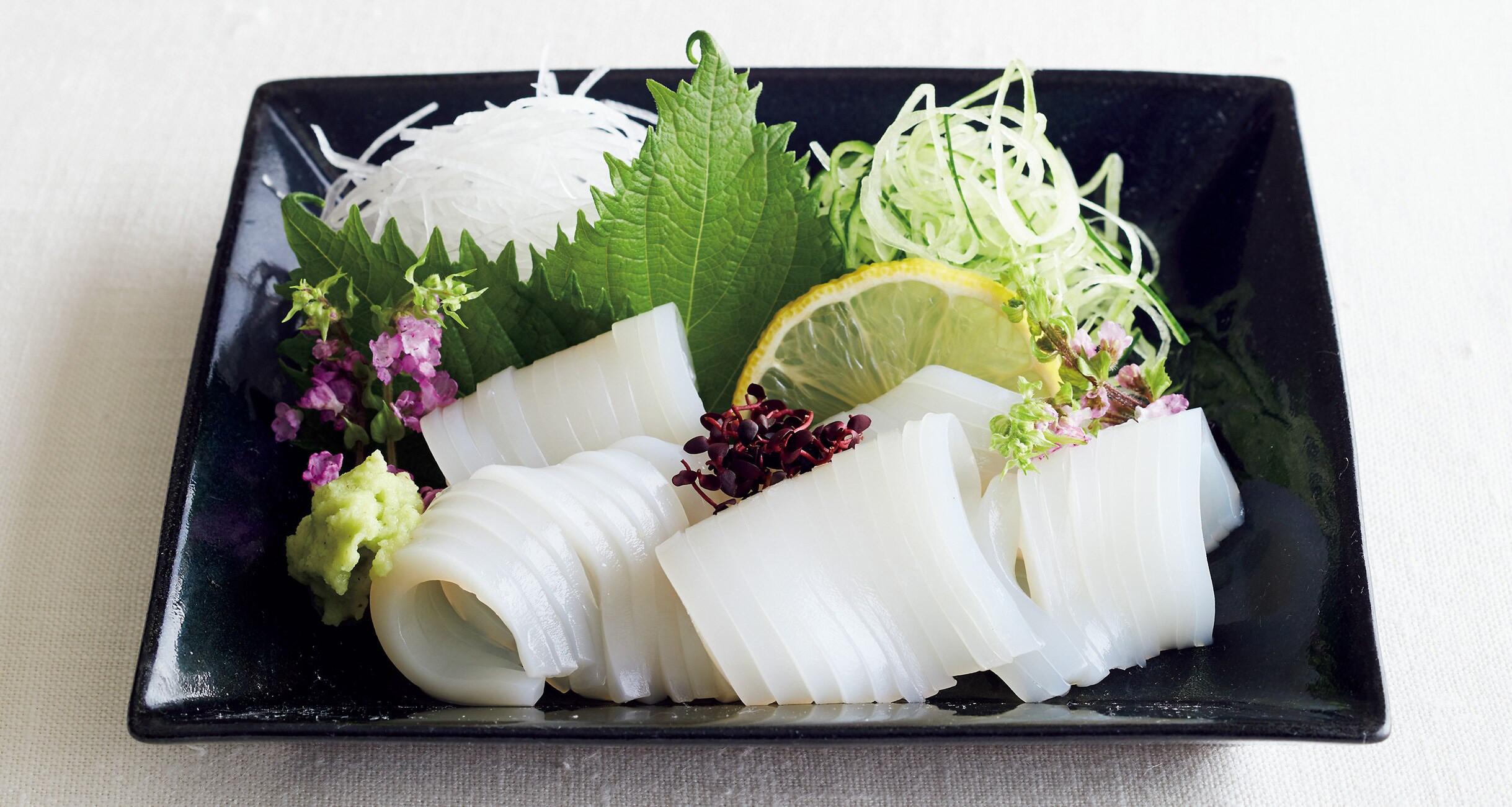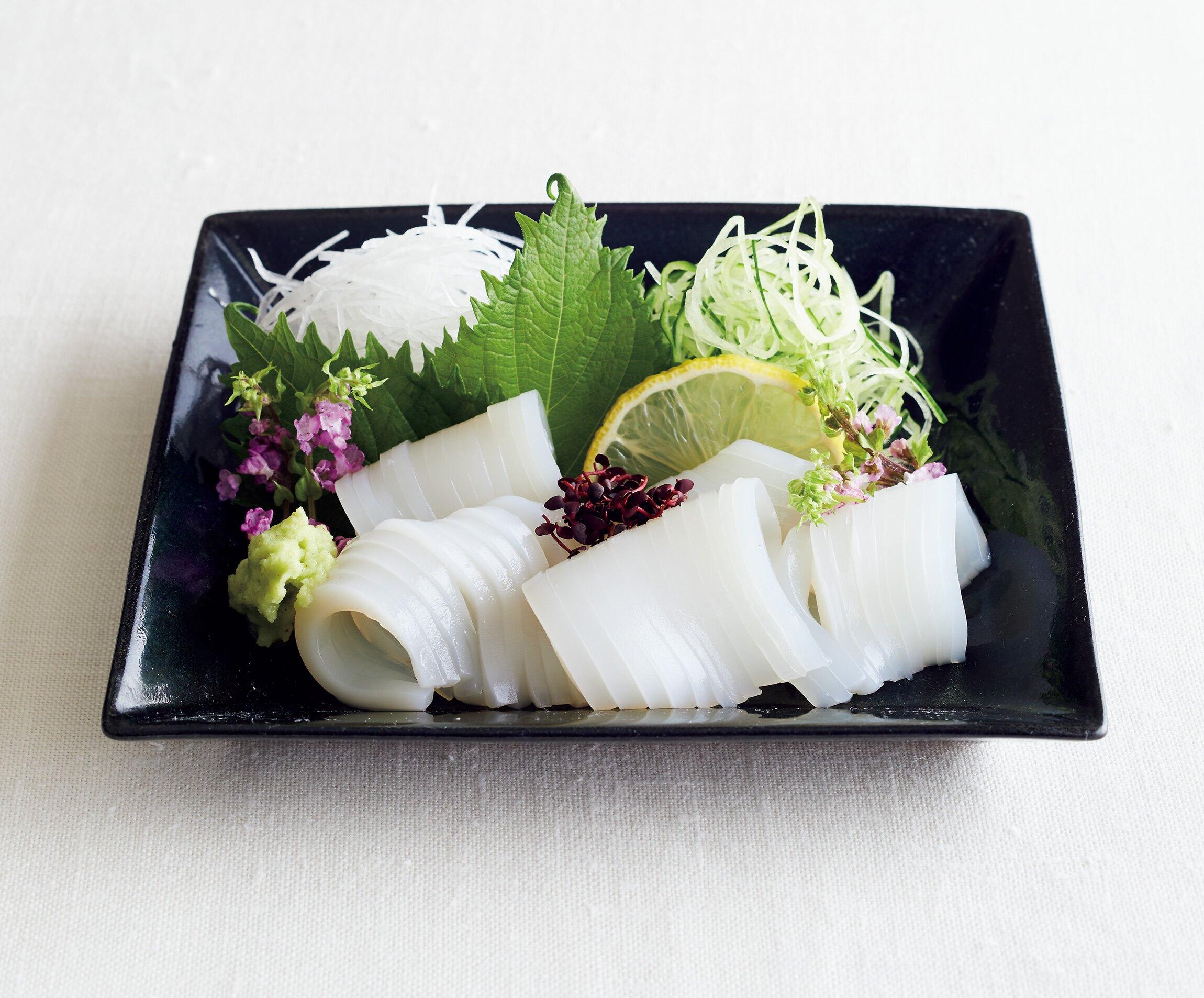 文字どおりそうめんのように細く切ったイカの刺し身。幅3~5mmを目安に切りますが、太さは好みでOK。わさびもいいし、生姜醤油もおすすめ。