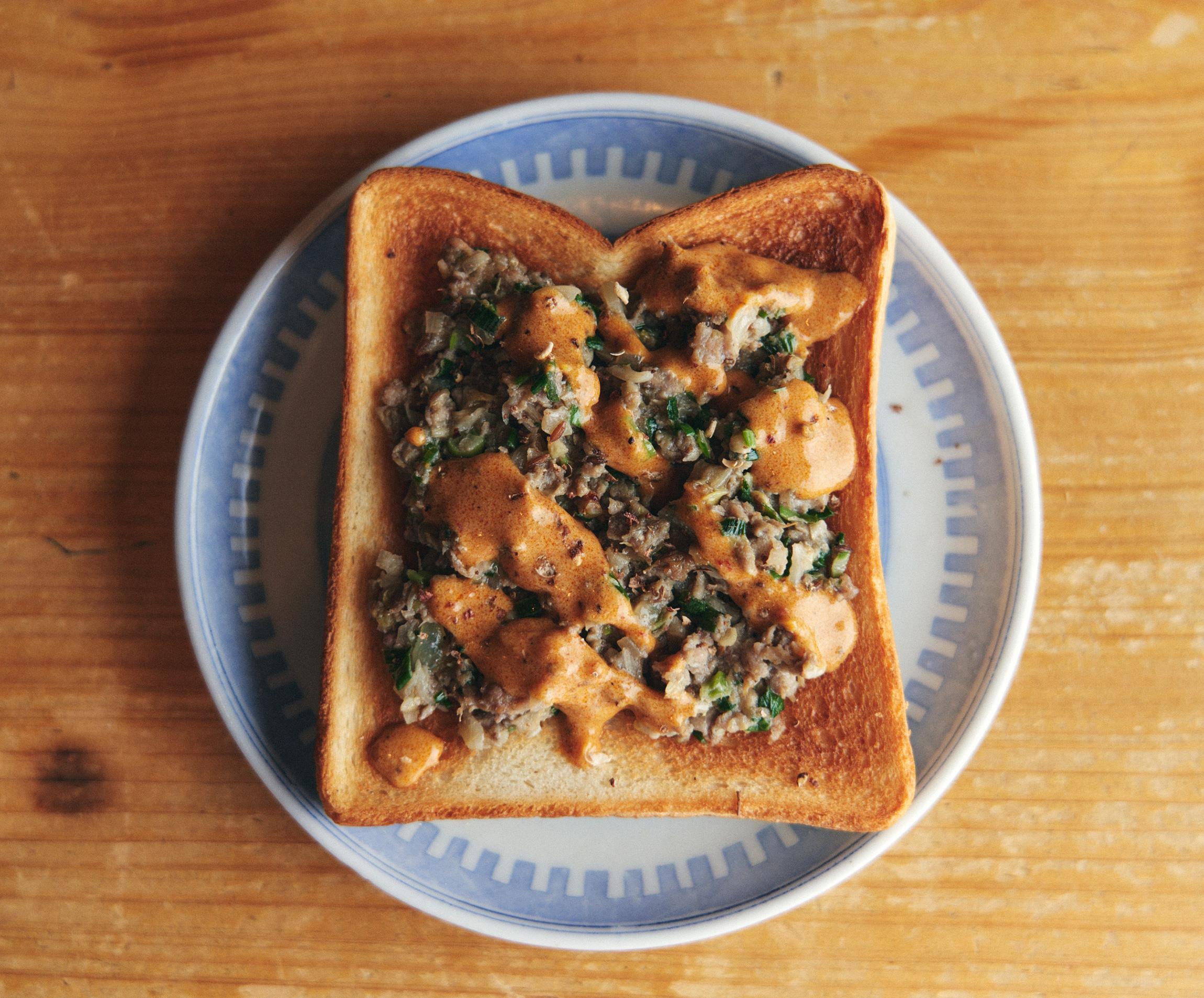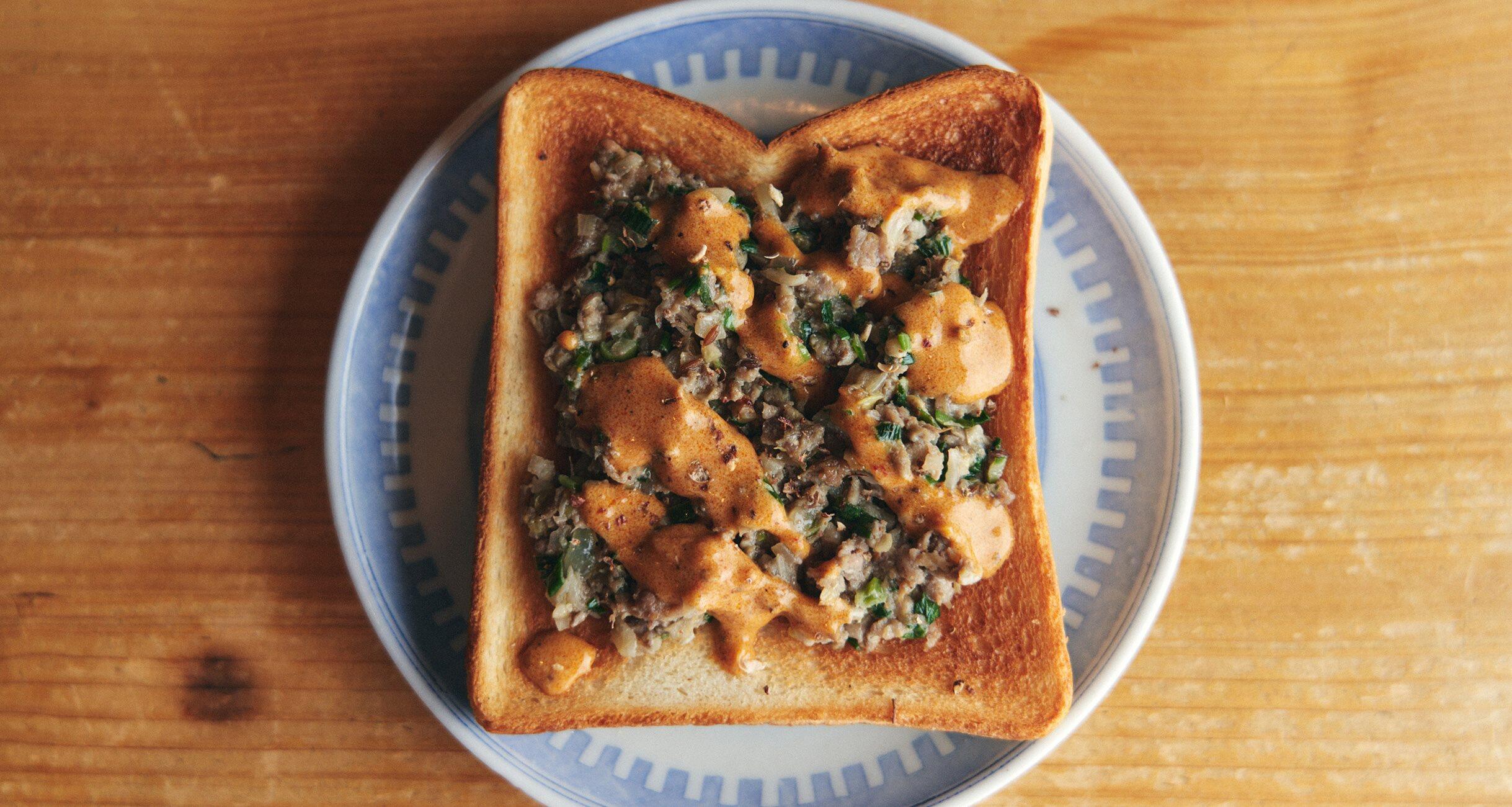 餃子をつくったときにタネが余ってしまったら……。という想定で編み出した、ラム餃子のタネをのせたトースト。自家製麻辣ダレをかけたコクのある味わいで、紹興酒ハイボールがぐいぐい進む!「パンはご飯や豆腐と一緒で、幅広い味を受け入れてくれるもの。酒場のメニューに上るようなものは、たいがいトーストの具になります」と「酒亭 沿露目」の店主大野尚人さん。その言葉通り、和あり、洋あり、中華風ありの、多種多様なおつまみトーストを16品習いました。さらに、大野さんお薦めの酒も合わせてご紹介。トーストの新境地がここに!