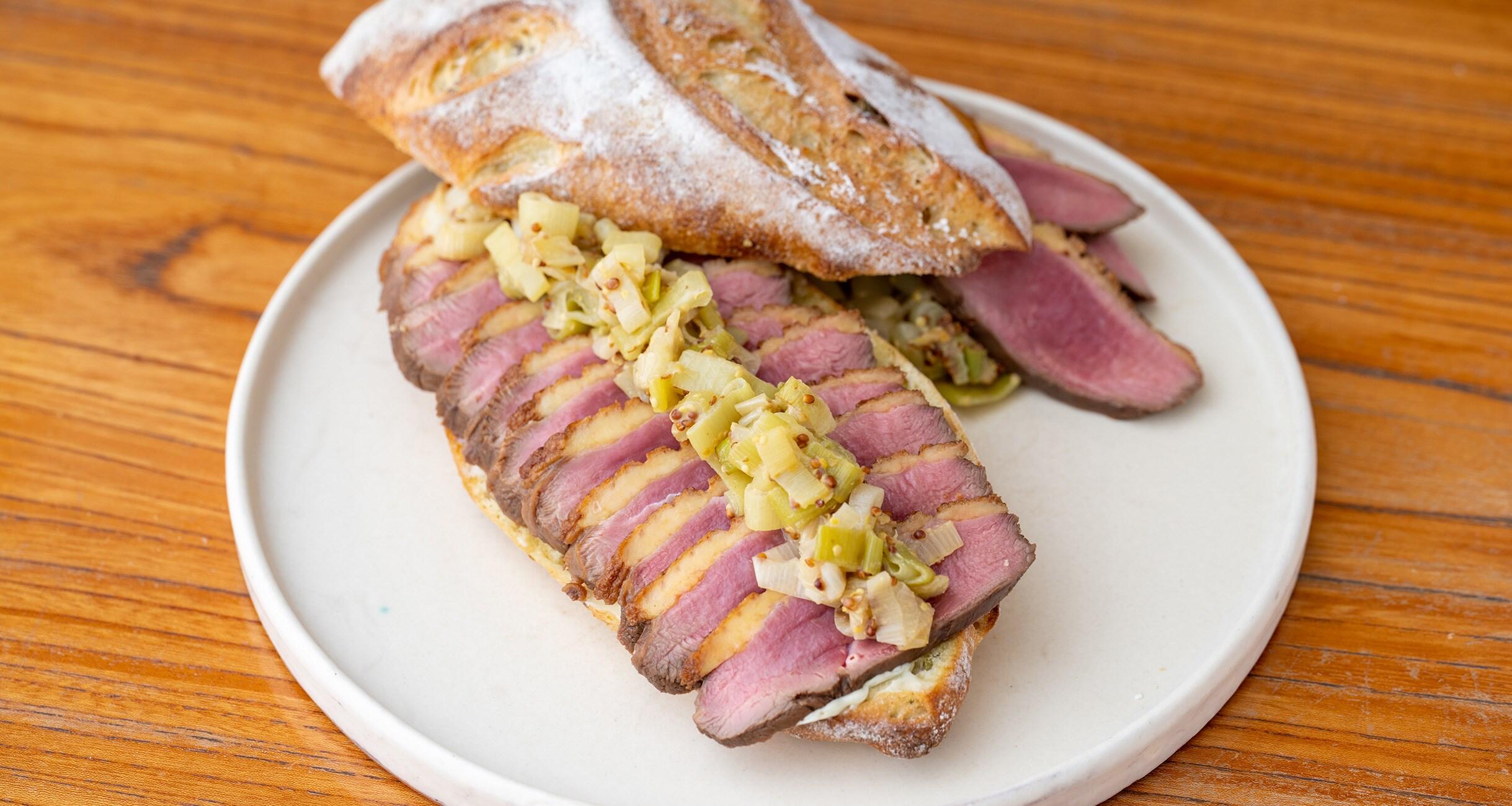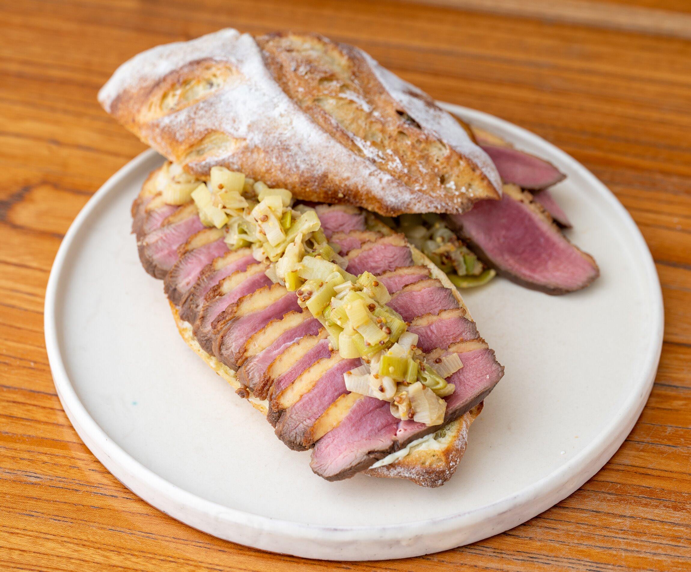 カンパーニュを上下2等分に切って軽くトーストし、切り口にバターを半量ずつ塗る。④の鴨を4~5mm厚さにスライスし、下半分のパンに並べ、⑤をのせて上半分のパンで挟む。鴨は好みの量をカットし、残った分は漬け地に戻して保存できる。冷蔵で2〜3日のうちに食べきること。