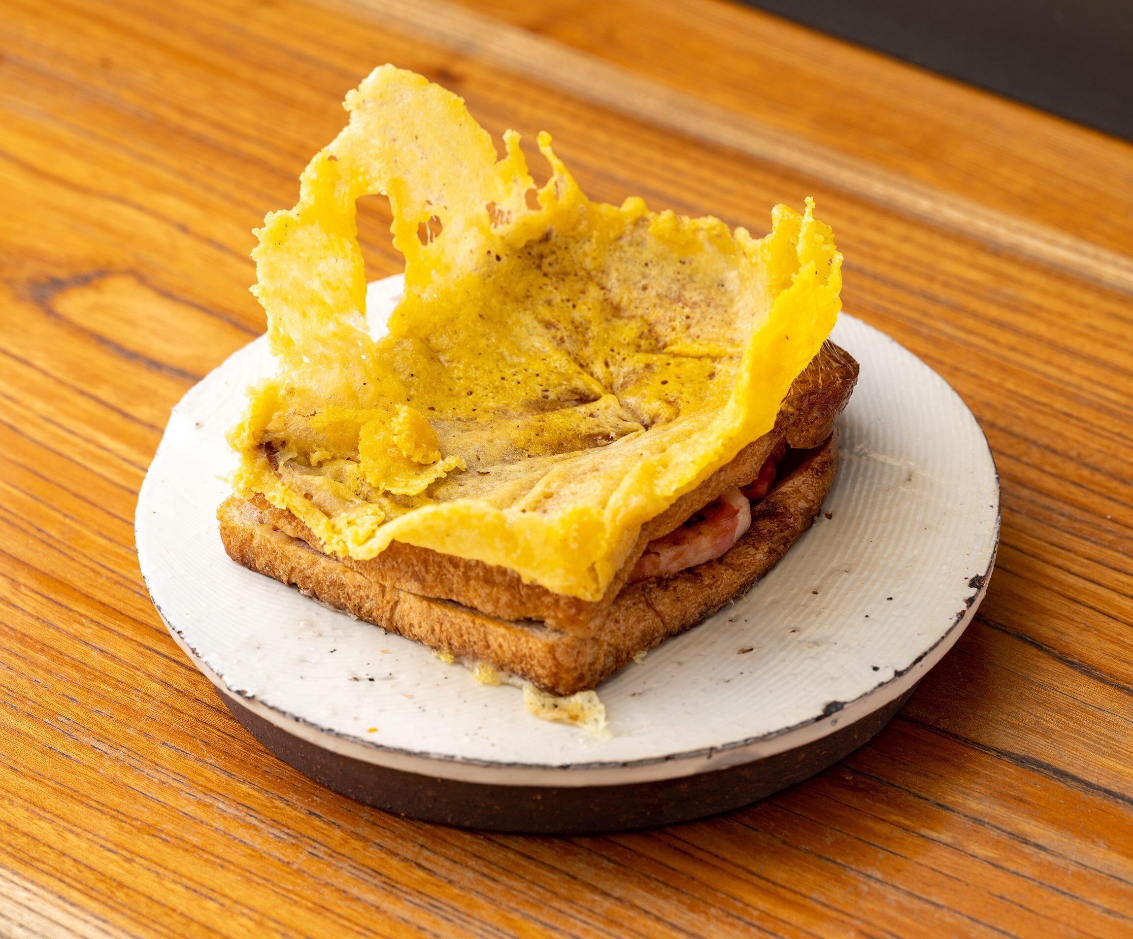 とろりと溶けたシュレッドチーズを垂れるままに固めると、ごらんのとおりの王冠型に。ベーコンとチーズとバター、3つの濃厚な旨味を吸い込ませ、焼き目の下に封じ込めたトーストのおいしさに頬が緩みっぱなし。濃いめに淹れたコーヒーの苦みがよく似合う。