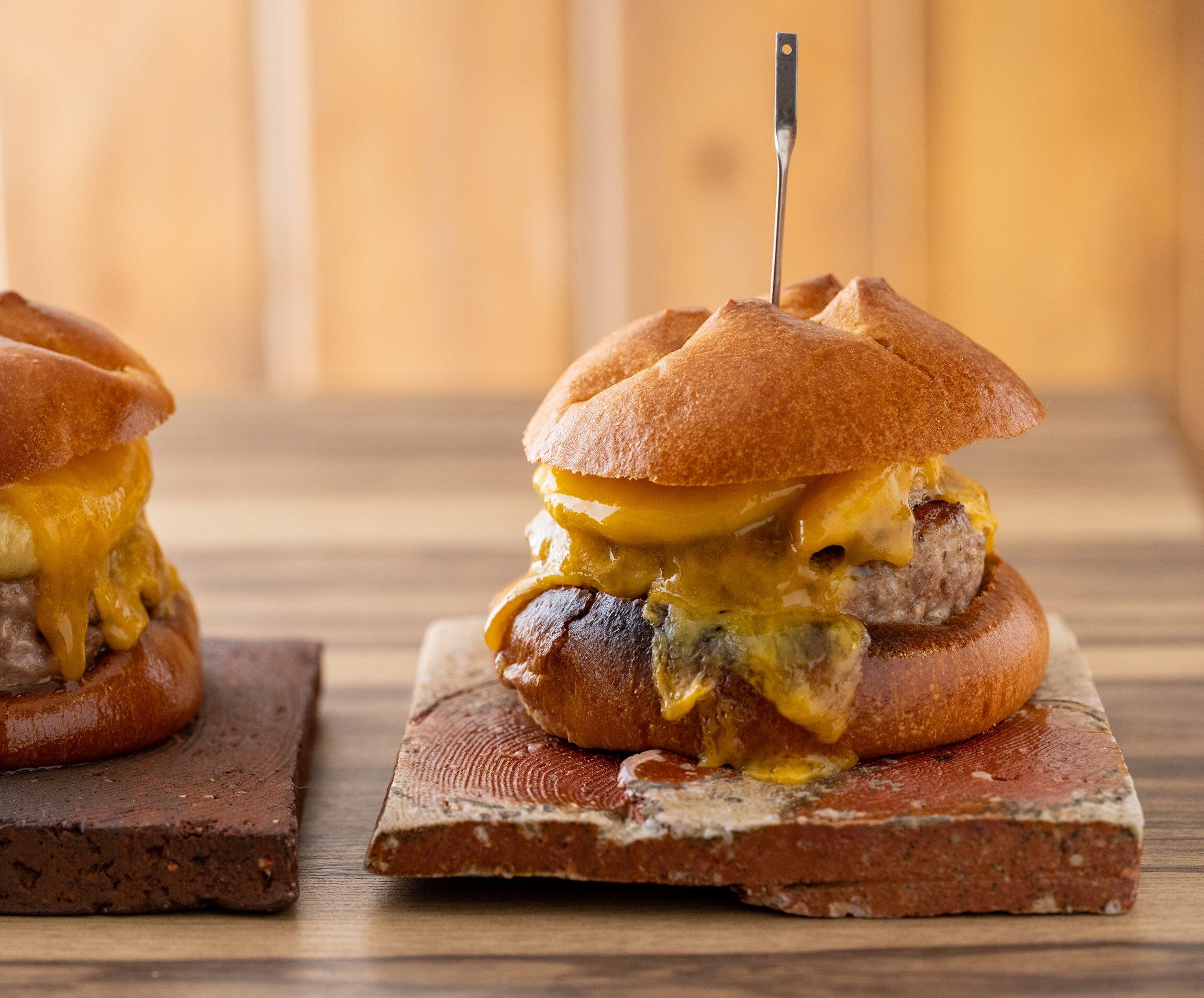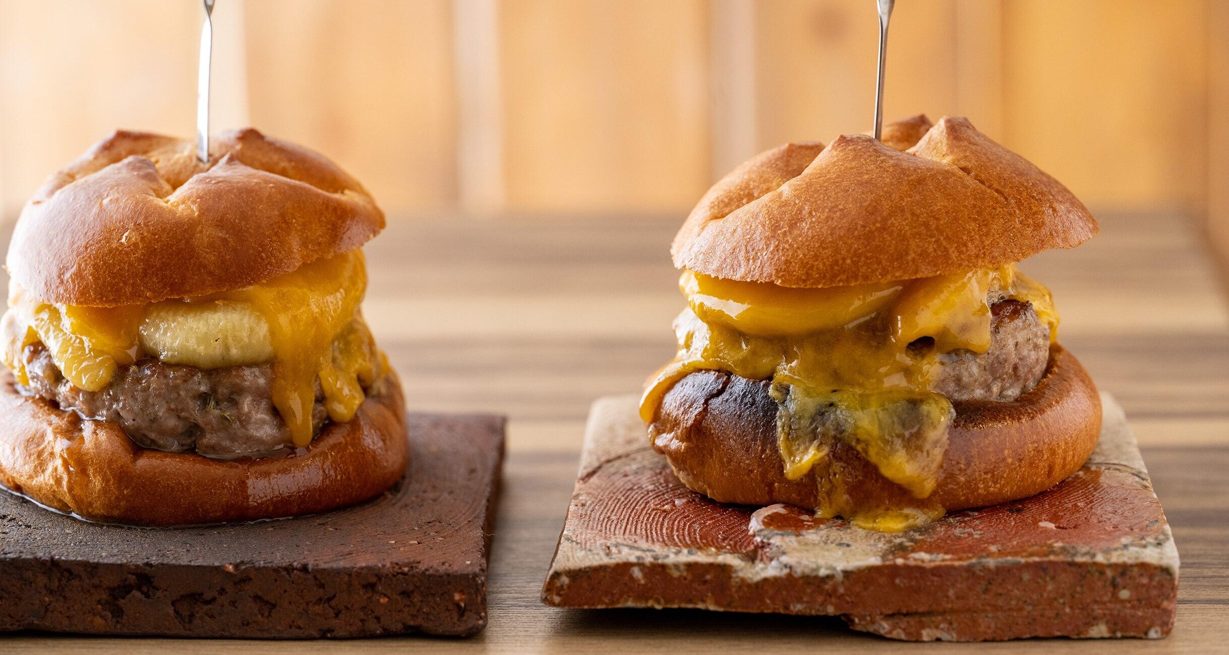 ④に②、③をのせ、チーズを重ねてのせ、バーナーで炙ってチーズを溶かす。バンズの上半分をのせて挟む。