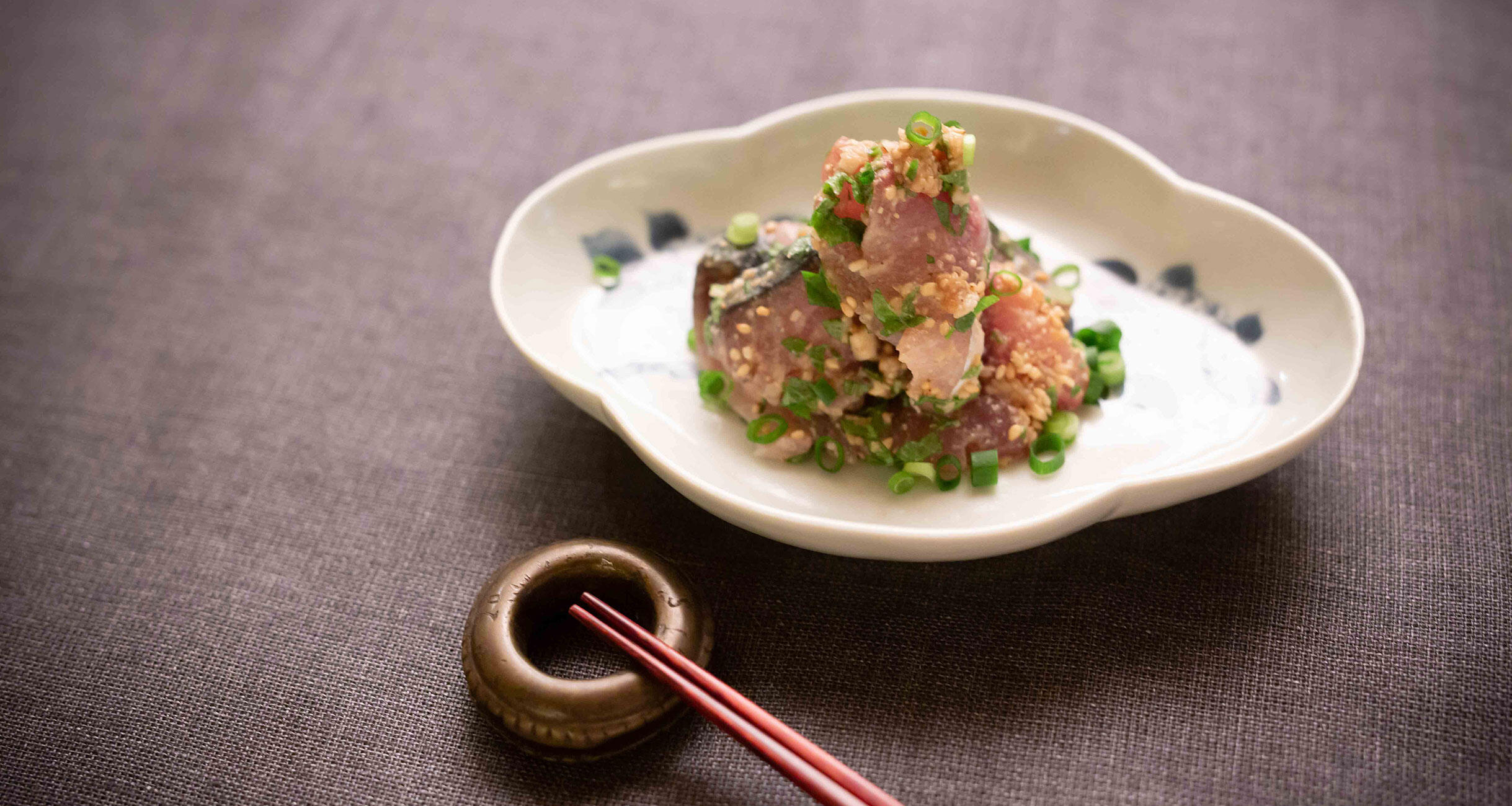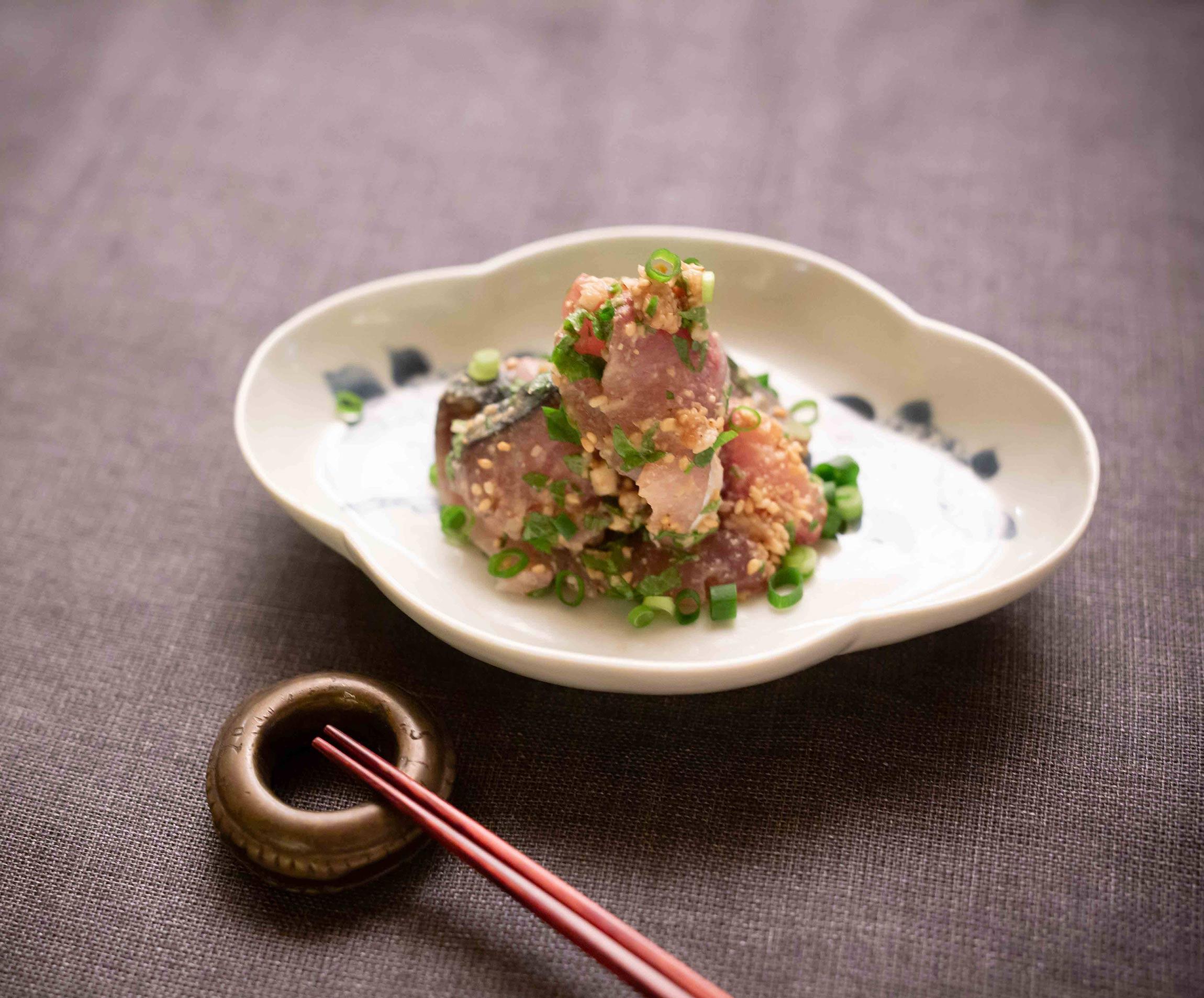 鮮度のよい、いいさばに出会ったときに、ぜひつくっていただきたい一品です。酢〆のきずしほど時間がかからず、なめろうのような味つけです。通常のなめろうは、魚の身を包丁でたたくように刻んでなめらかにしますが、これは切り身を使っているので、お刺身のアレンジ版で、和えもののような仕立てです。