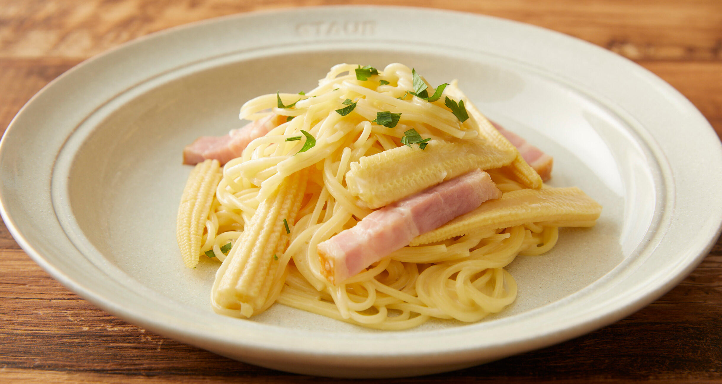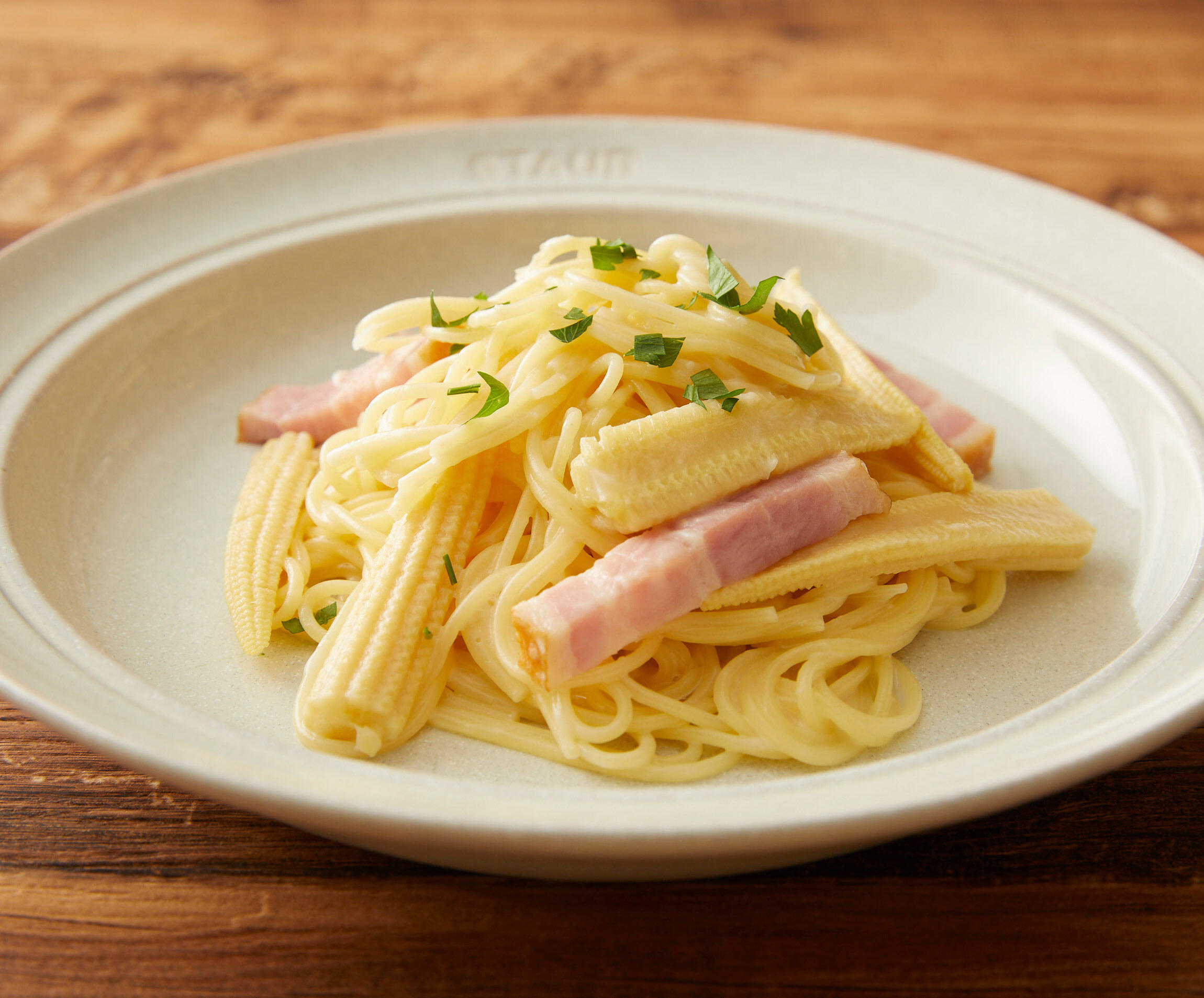 僕はベビーコーンやヤングコーンが大好き。大きく育ったコーンも良いけど、大きなものでは食べることの出来ない軸の部分の食感や、小さいコーンの控えめな甘さが気に入っています。そんなベビーコーンと、ベーコンの肉々しさが、ベシャメルソースの中で交互に味わえて楽しいパスタです。
