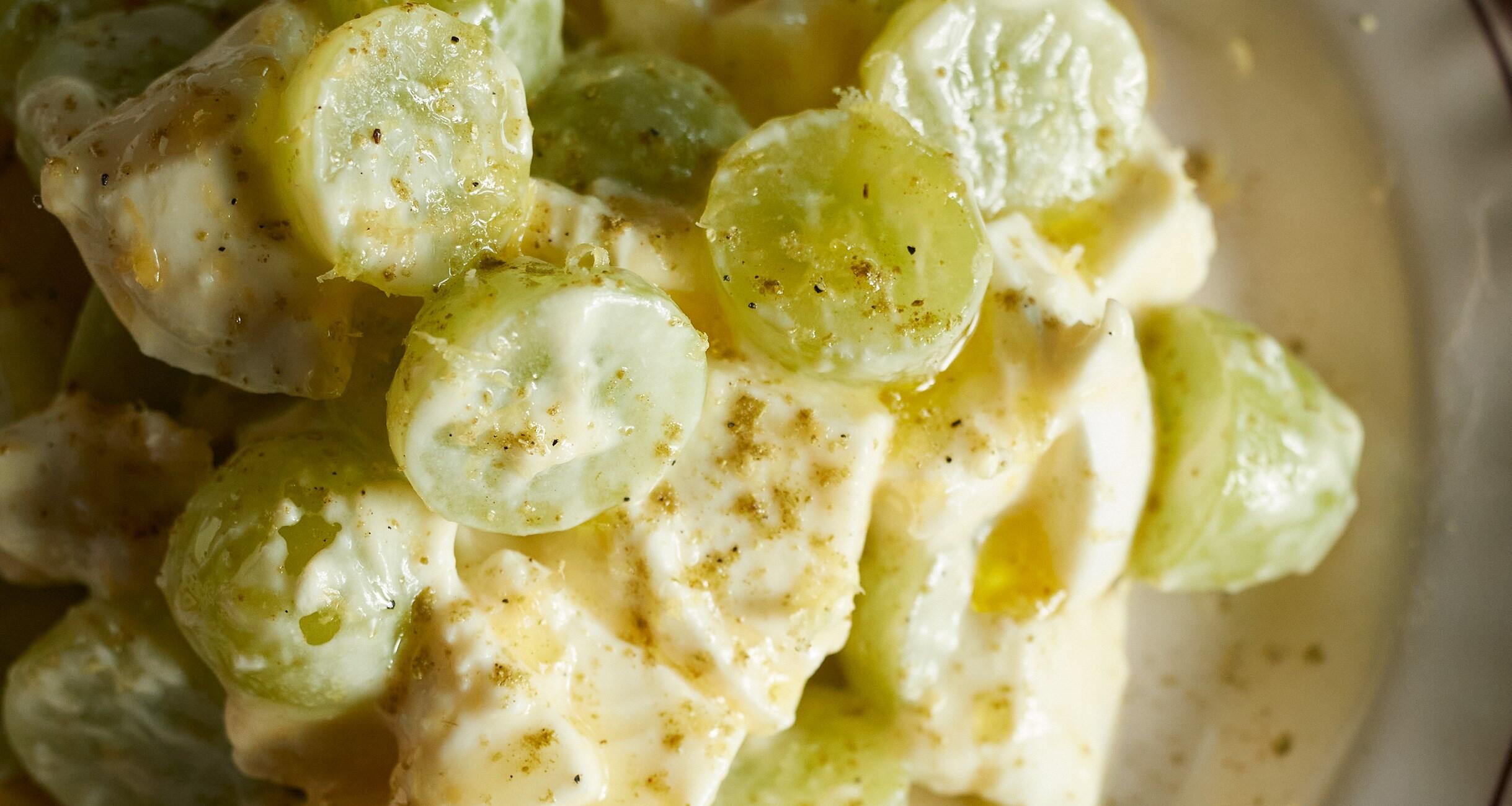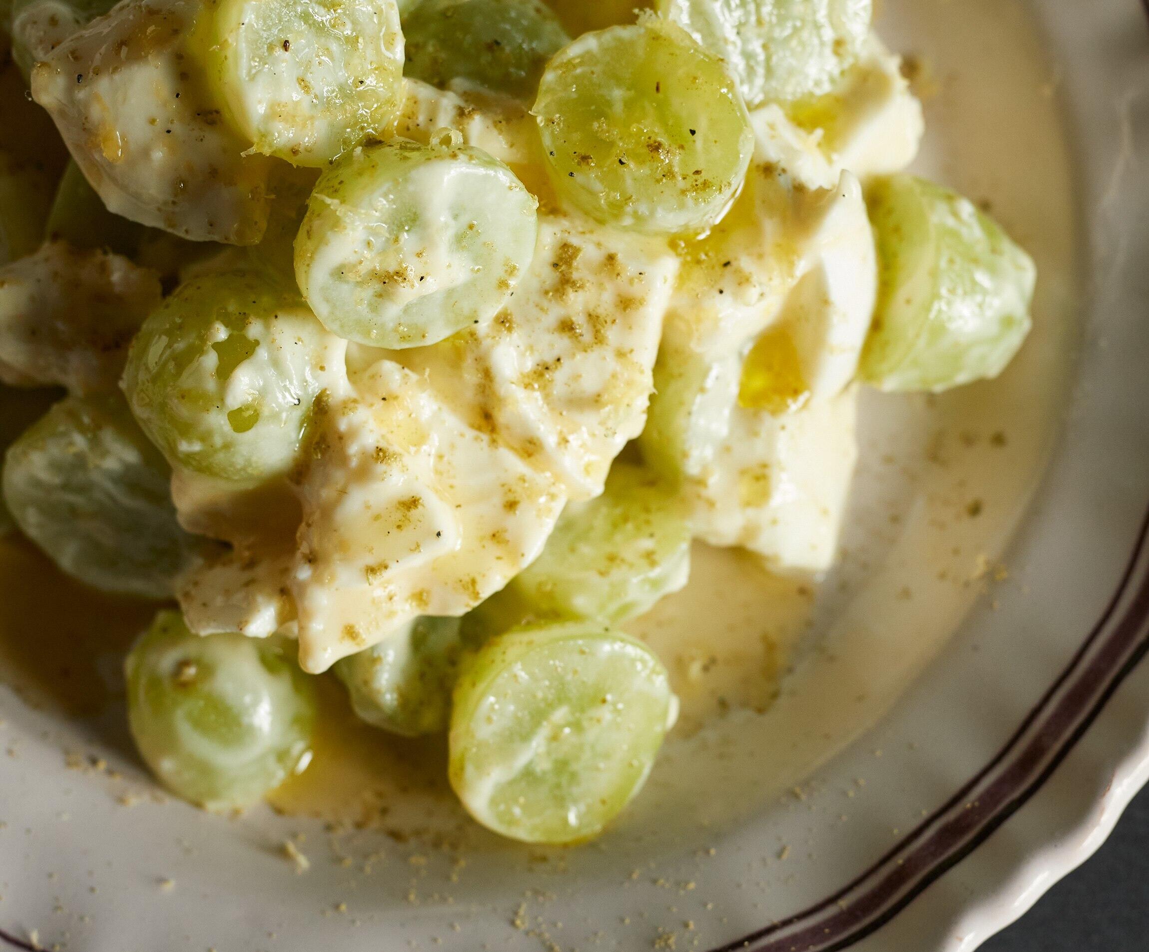 夏〜秋が旬のフルーティなマスカットと相性のよいモッツァレラチーズを取り合わせた、キーンと冷えたワインに合うひと皿。小堀さんの料理教室でも好評の白味噌ヨーグルトソースに粉山椒でアクセントをつけるのがポイントです。