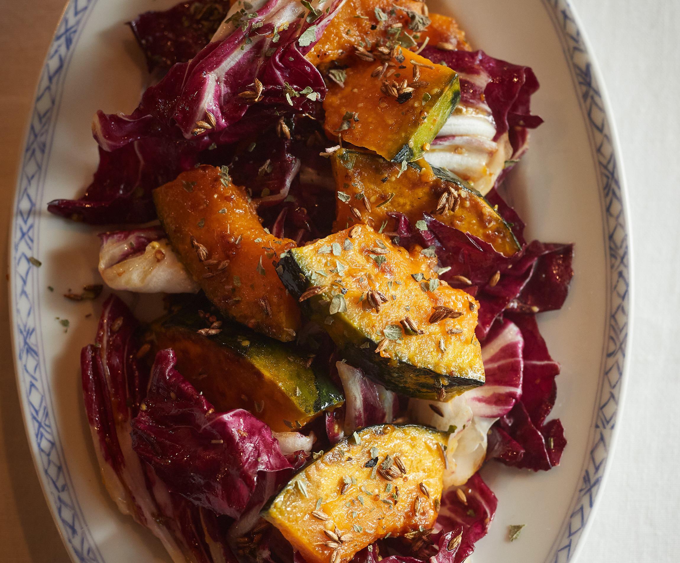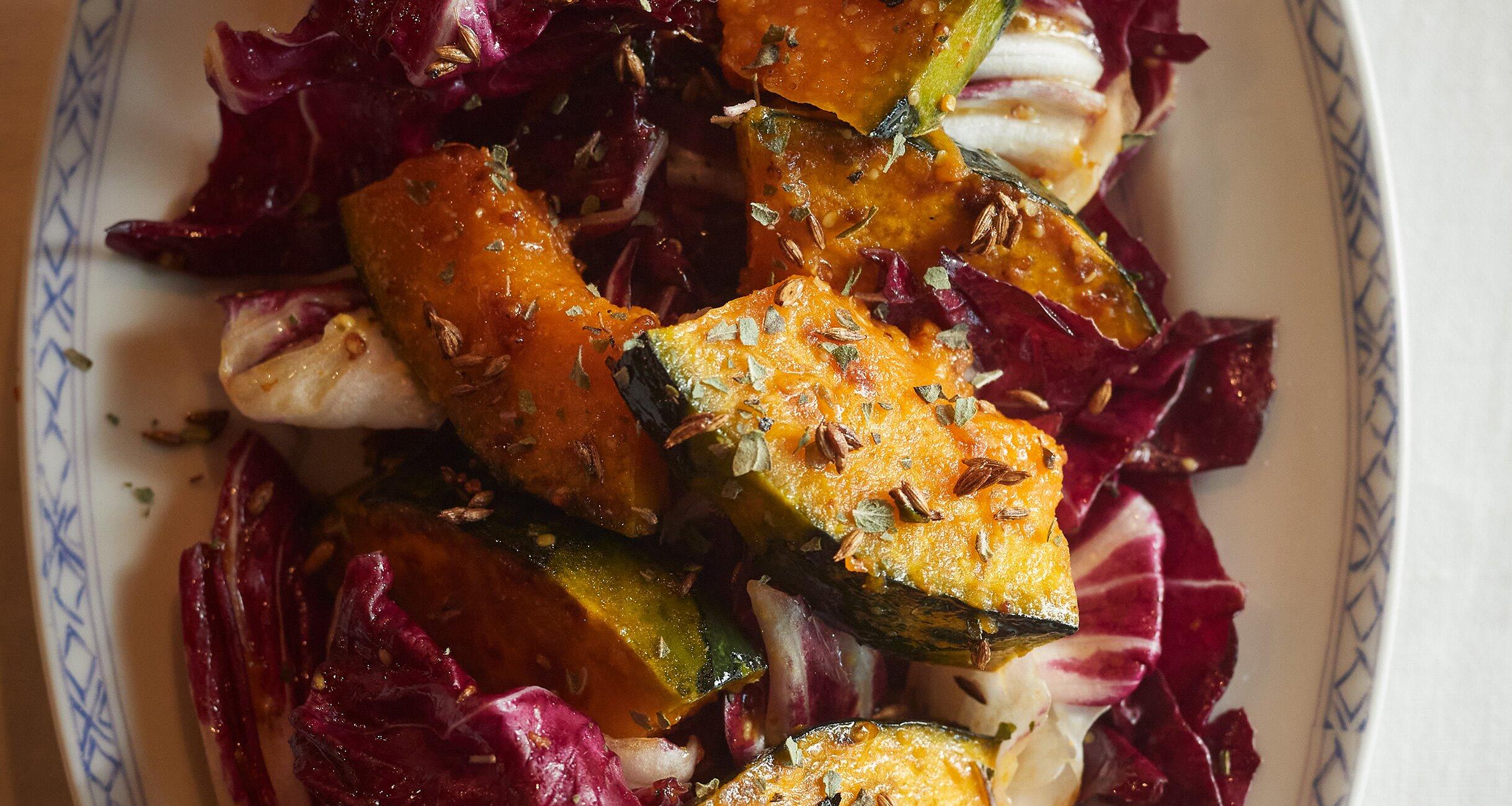 クミンシードの香りをまとったかぼちゃを、オレンジとオレガノのドレッシングで和えます。かぼちゃの甘さとトレビスのほろ苦さ、この組み合わせが、クセになるおいしさです。秋のおかずをおいしくするスパイスとハーブ使いをスパイスの達人・小堀紀代美さんに教えてもらいました。