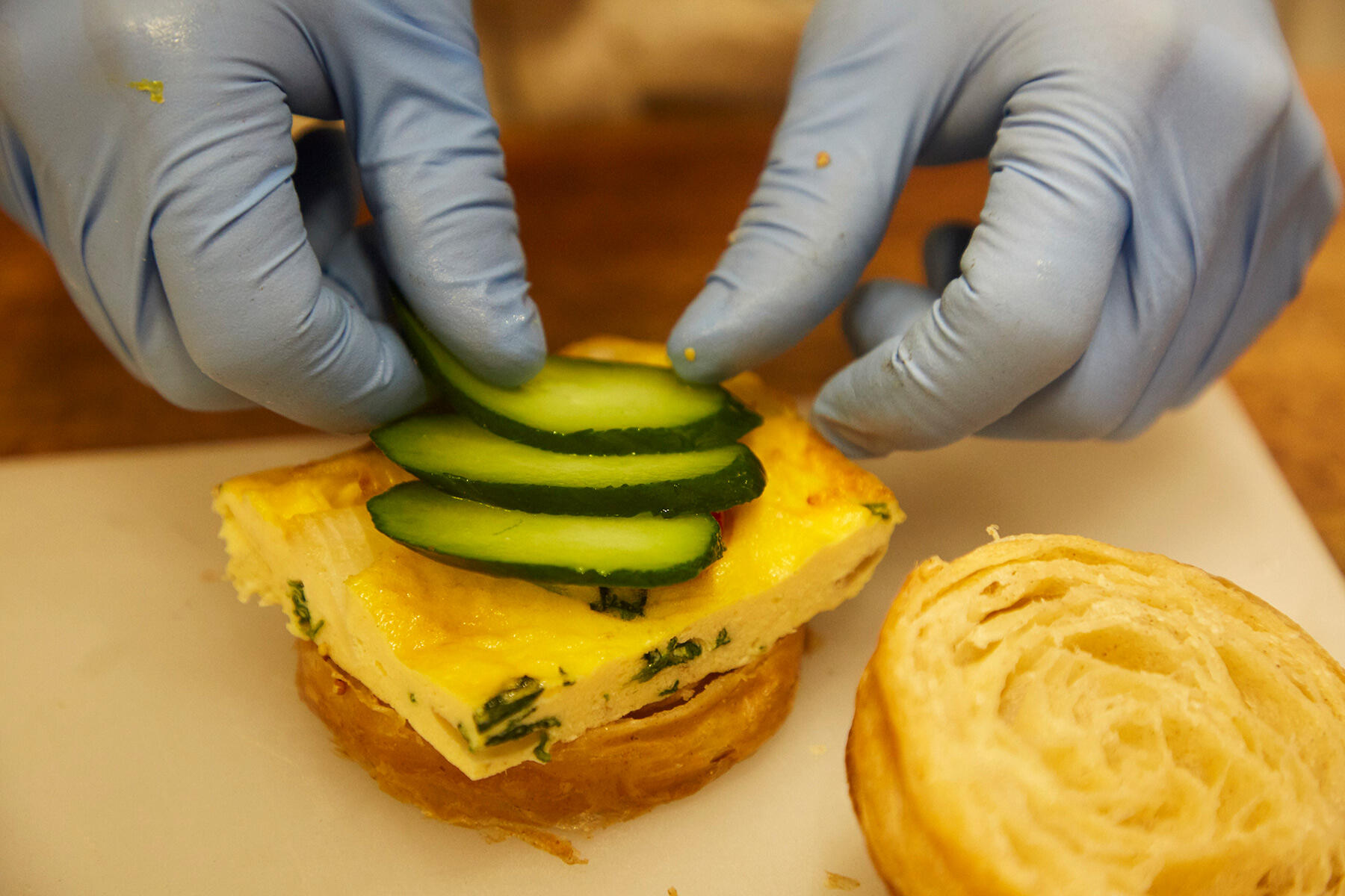 ⑥のオムレツをのせ、きゅうりをのせたら完成。