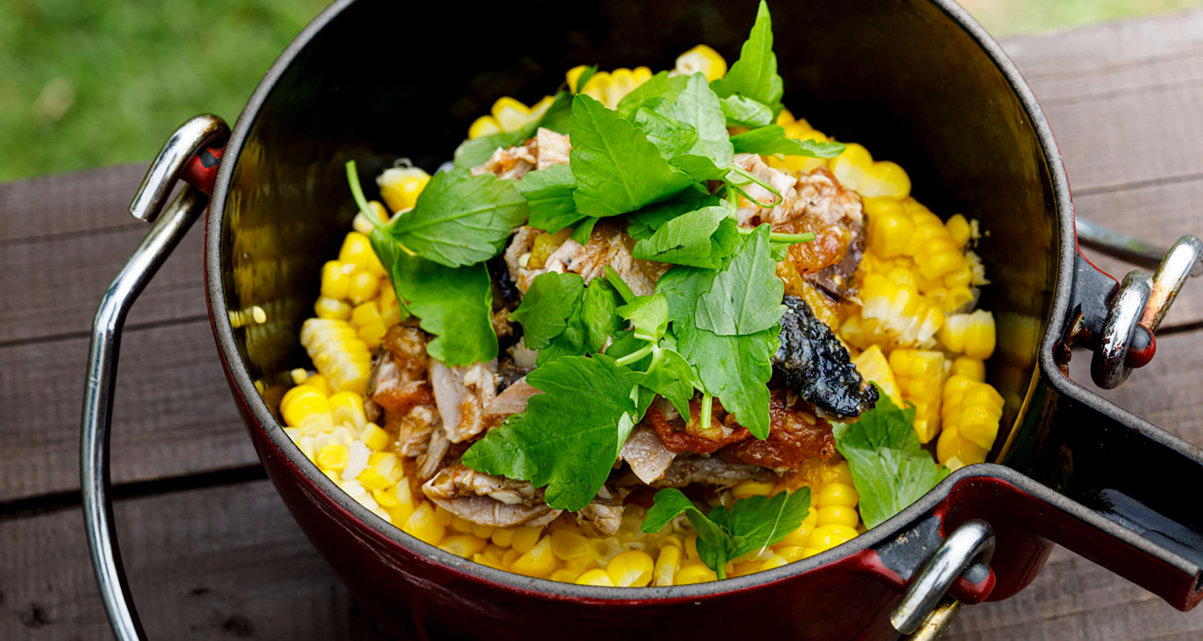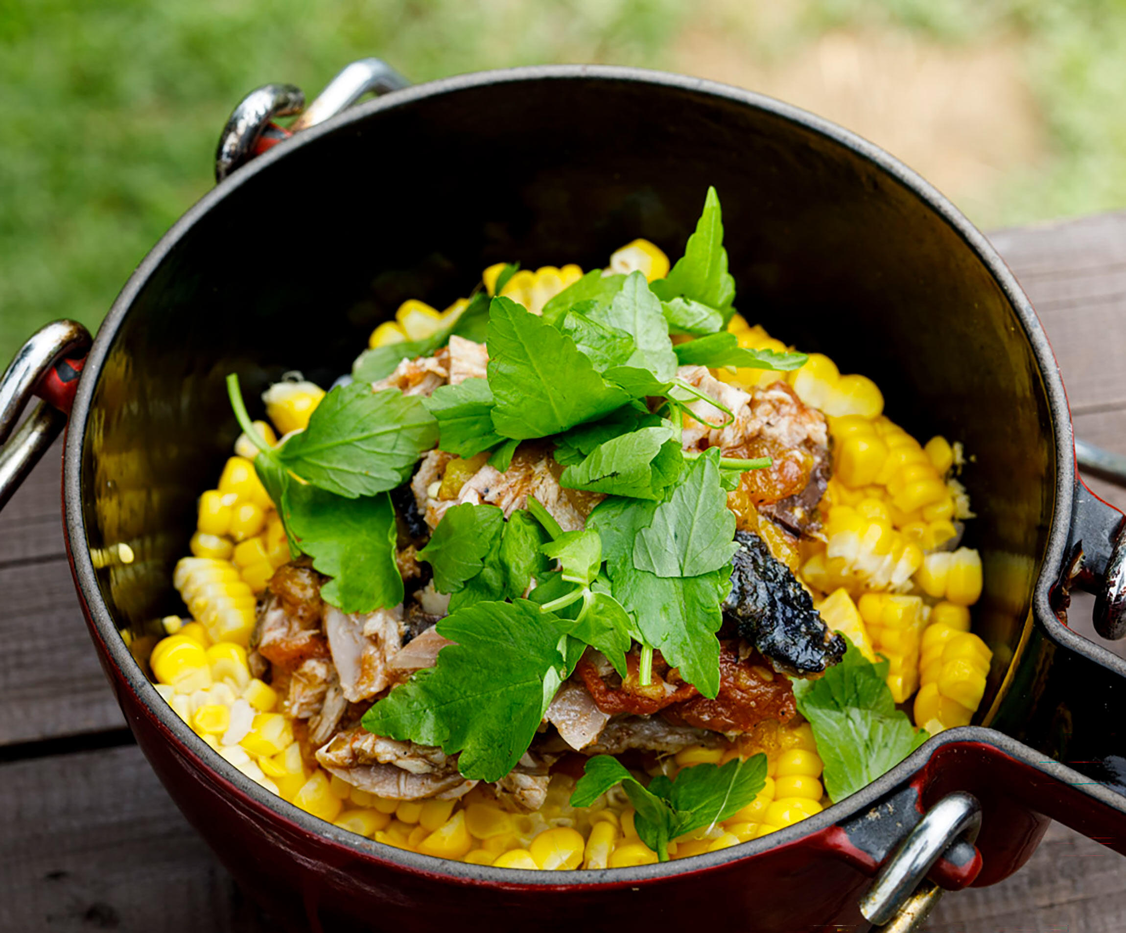 よく焼けたカツオをほぐして、万能パプリカソースと和える。とうもろこしは包丁で実を切り落とす。温かい白飯の上にとうもろこしを敷き詰め、パプリカソースで和えたカツオを盛る。パクチーの葉をあしらい完成。