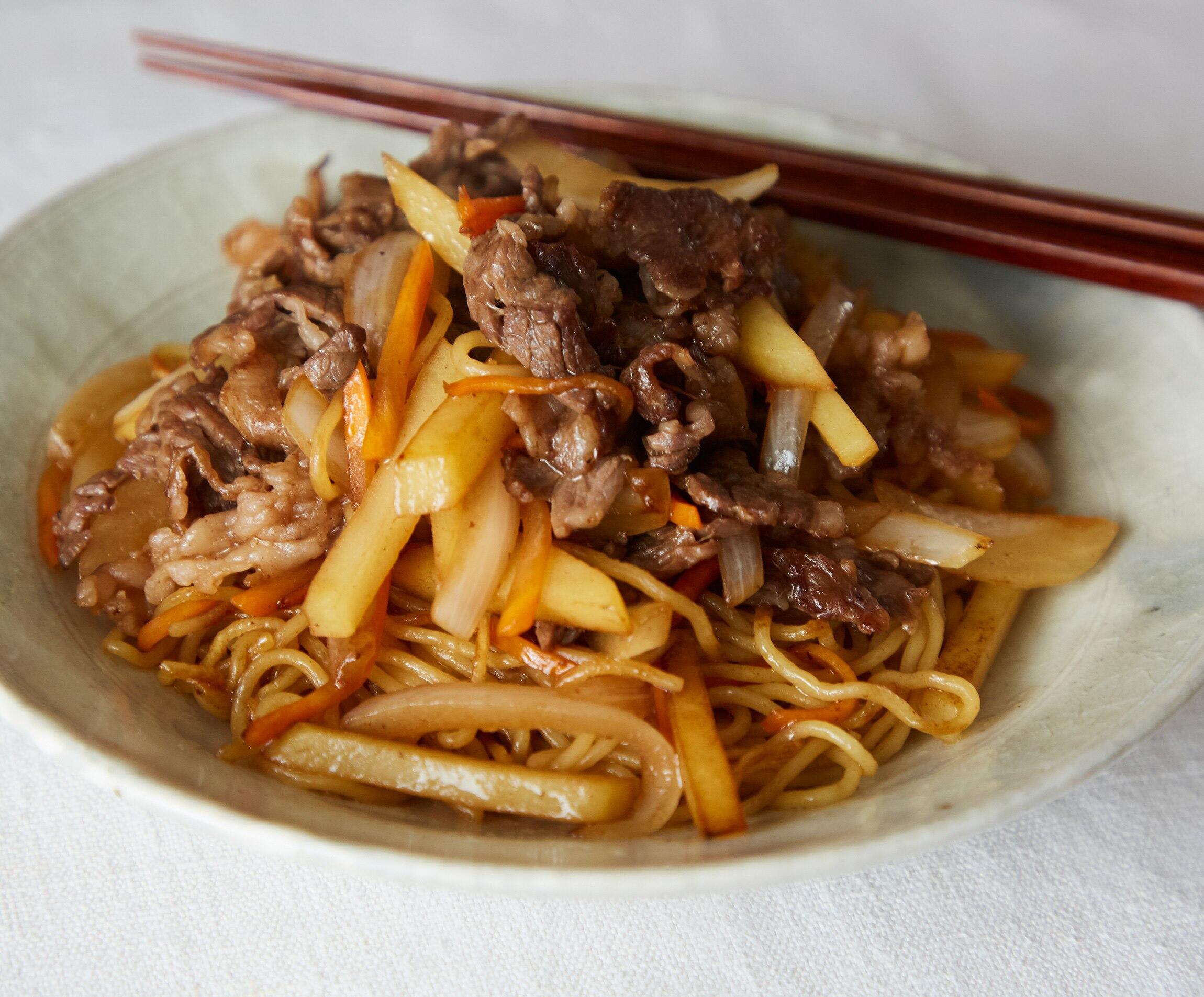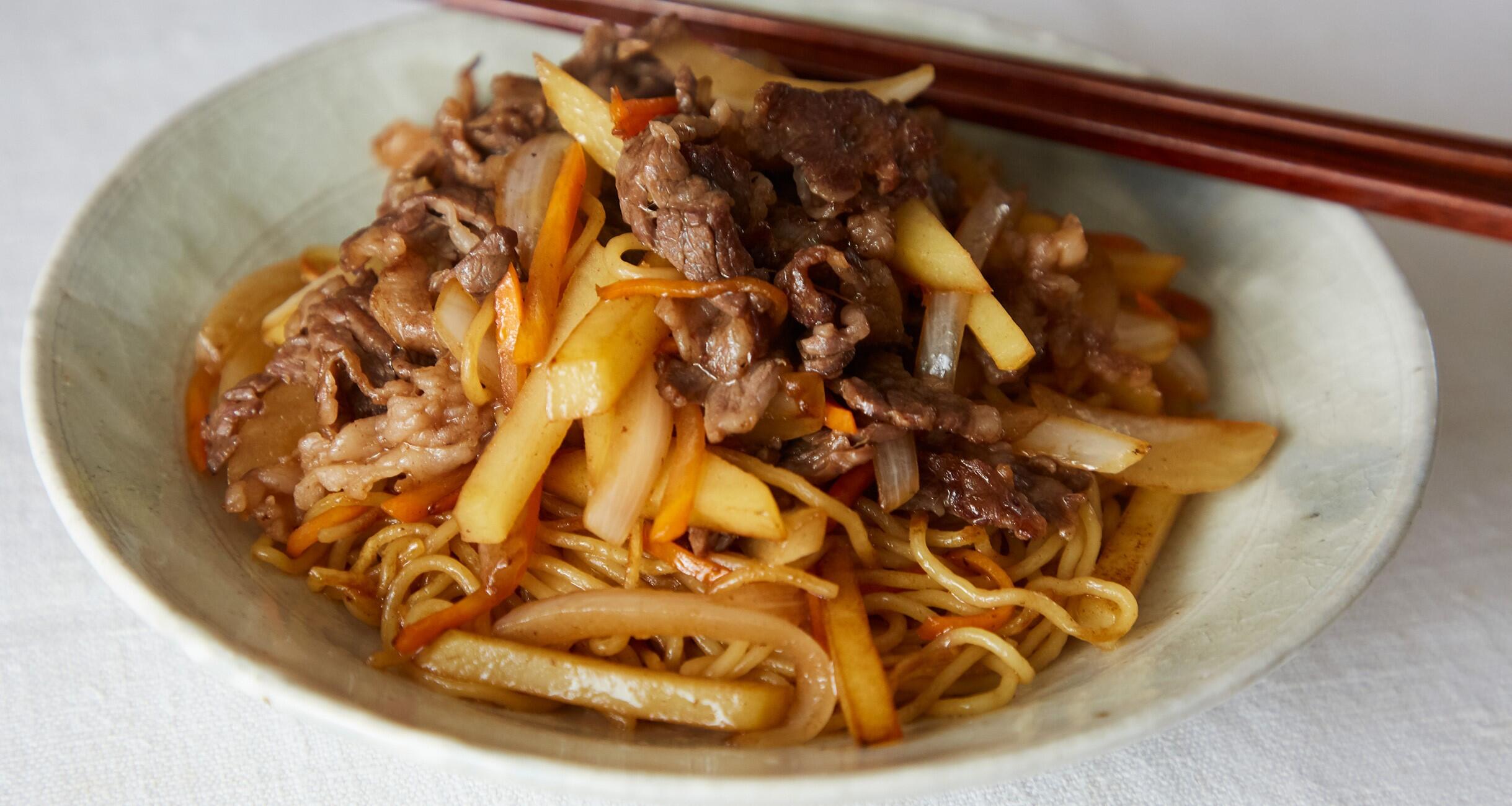 おふくろの味No.1の人気を誇る肉じゃがと焼きそばを合体!子供も大人も大好きな味に仕上げました。枠を決めることなく、アイデアに満ち溢れた味わい広がる家焼きそばを、料理家の今井 亮さんに教えてもらいました。