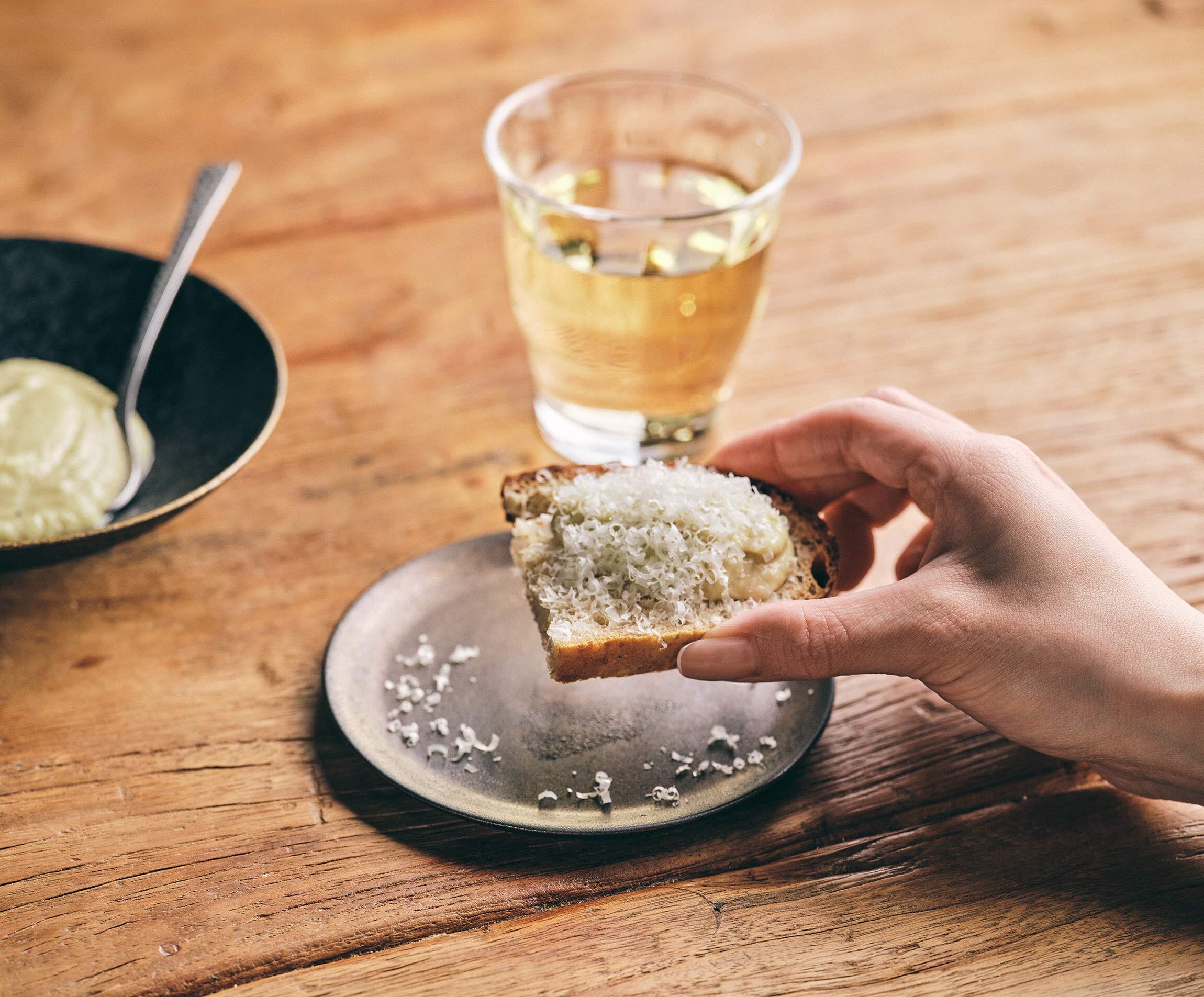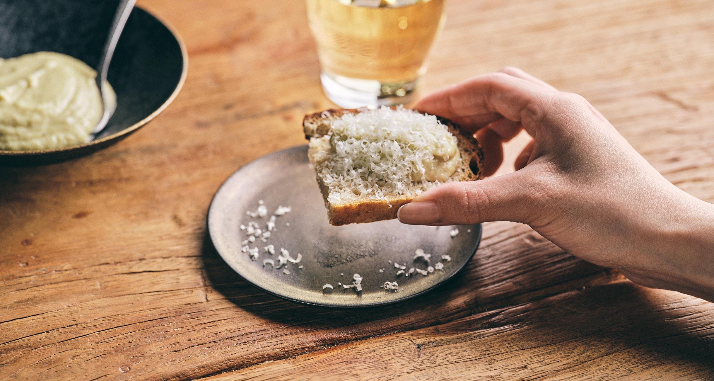 焼けたパンの上に焼きなすのペーストをのせ、ペコリーノチーズを削りながらかける。