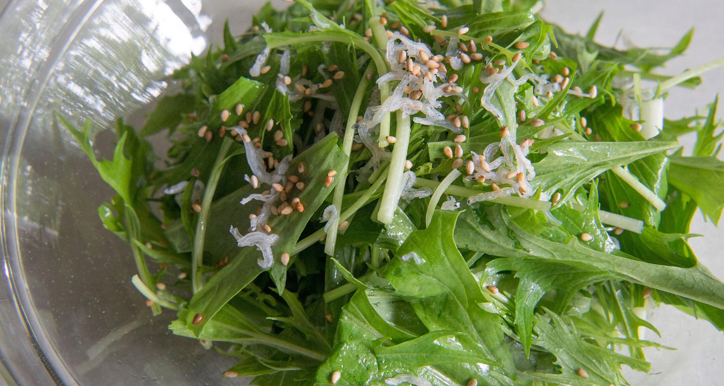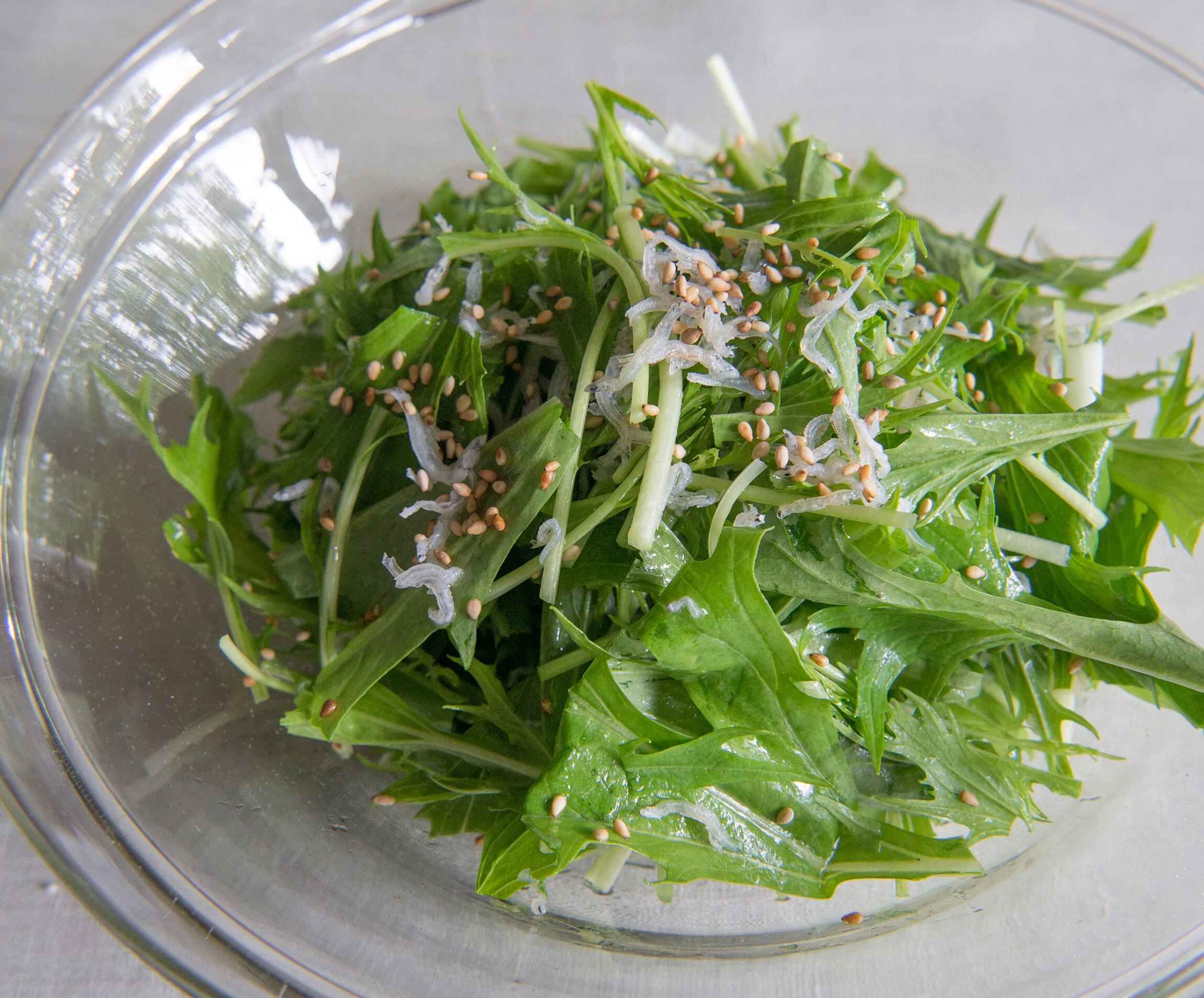 水菜のシャキッとした食感と、酢の程よい酸味がさっぱり爽やかなひと皿です。じゃこと胡麻油は最強の組み合わせ。副菜だけど、ずっと食べ続けられるほどの美味しさです。手軽でライトなボリュームながら、存在感際立つ副菜のレシピを料理研究家の大庭英子さんに教わりました。