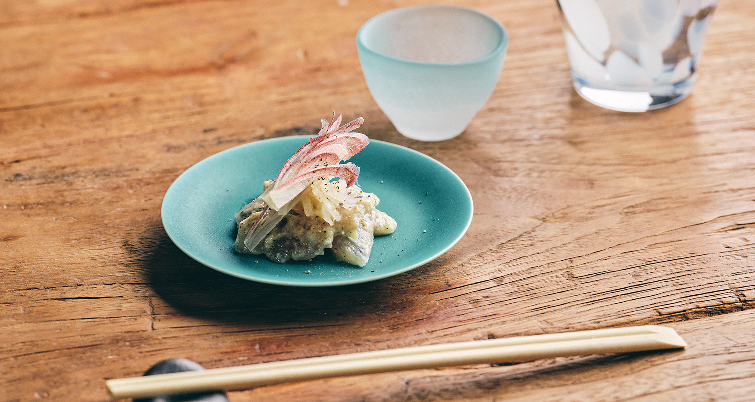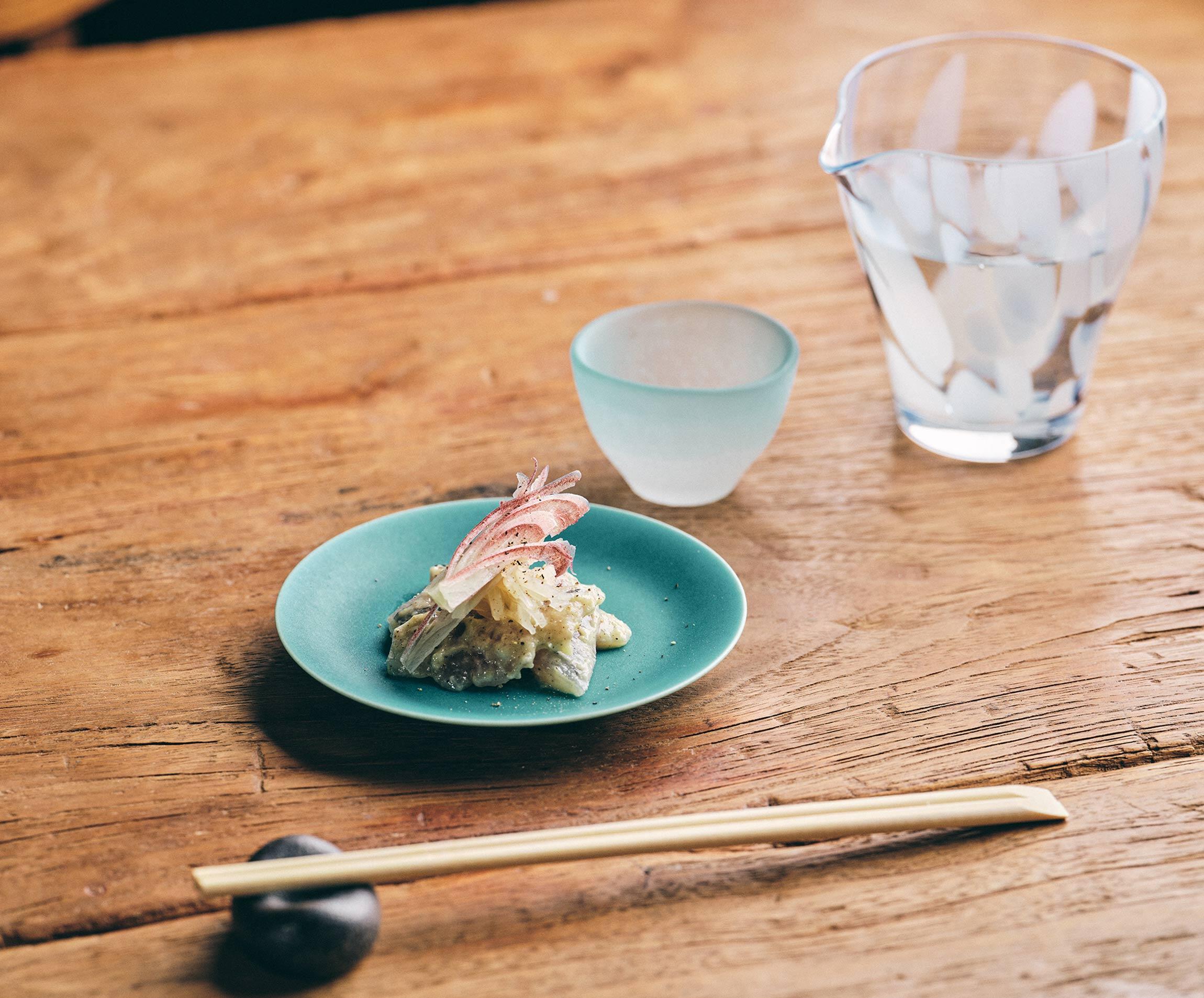 甘酸っぱいガリとシャキシャキしたみょうがいいアクセントに。まるでお寿司屋さんのつまみを食べているような気分に!柔軟な発想を持った東京・飯田橋にある酒場「ル ジャングレ」の有澤貴司シェフらしい、ユニークな組み合わせの豆皿つまみレシピです。
