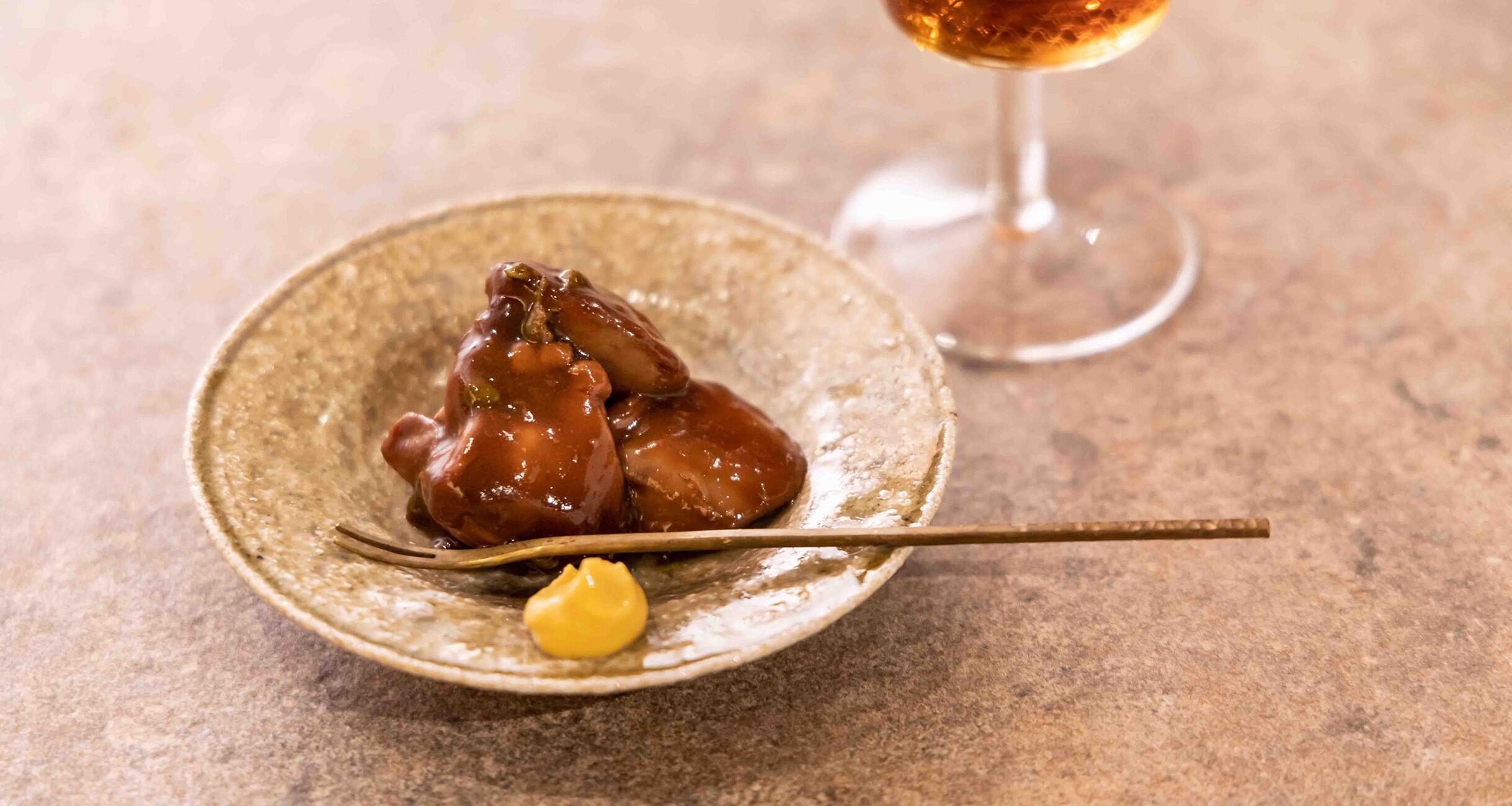 この山椒煮は中まで火が通っているのにふんわりとして、トロッとしたたれをからめながらいただくと本当に美味しいんです。新鮮な鶏肝を使い、洗って血を取り除き、合わせだれの中で煮ていきます。ポイントは火入れの仕方。混ぜながらゆっくり火を通し、九割方火が通ったところで火を止め、あとは、蓋をして余熱で5分。これで完成です。こうするとふっくらと仕上がり、たれは程よくとろとろで、しっかりレバーにからみます。