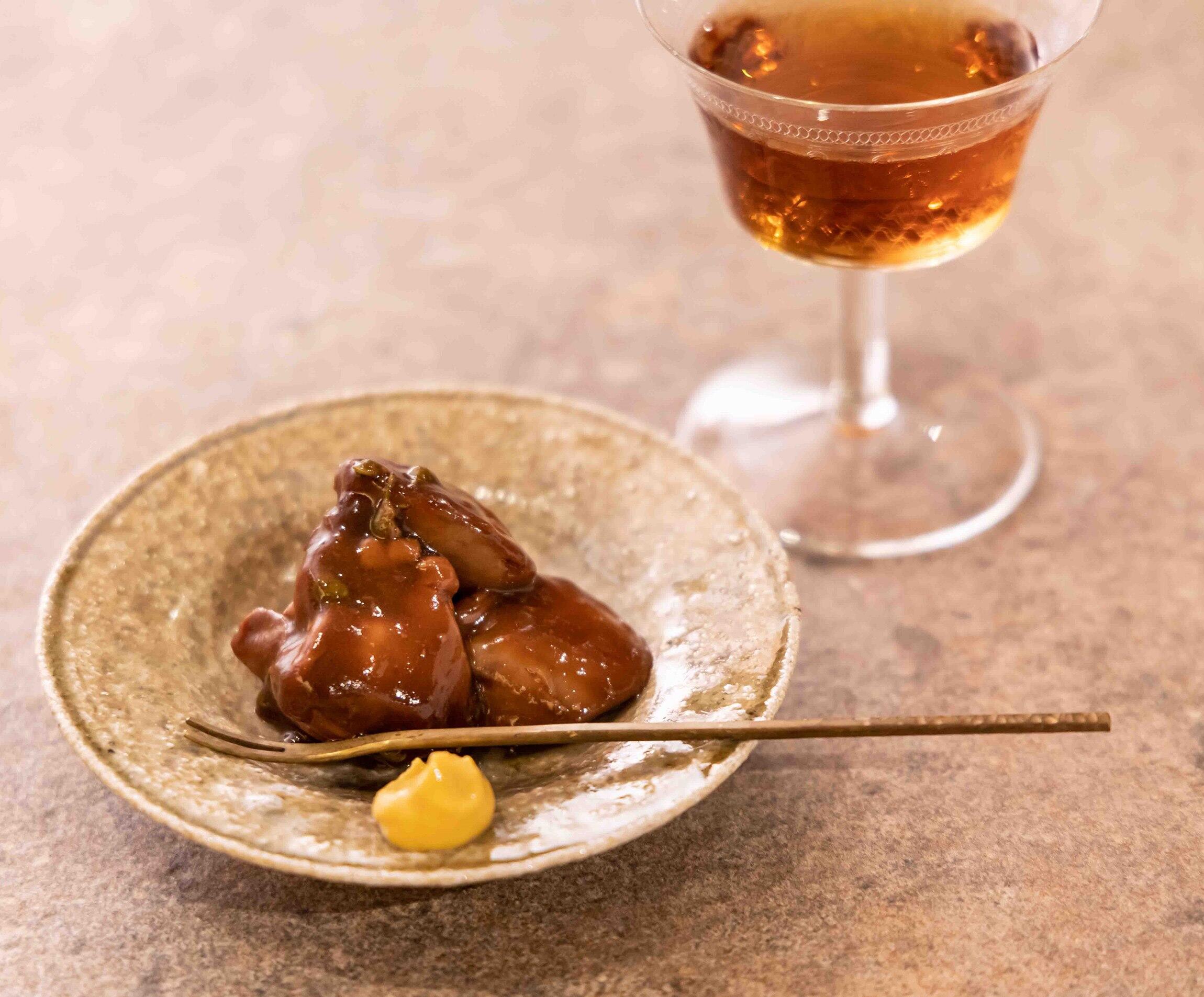 お酒はシェリーのアモンティリャードを選びました。私はシェリーはワインというより紹興酒の感覚で楽しんでいて、醤油を効かせた山椒だれとシェリーのコクがとてもよく合うんです。