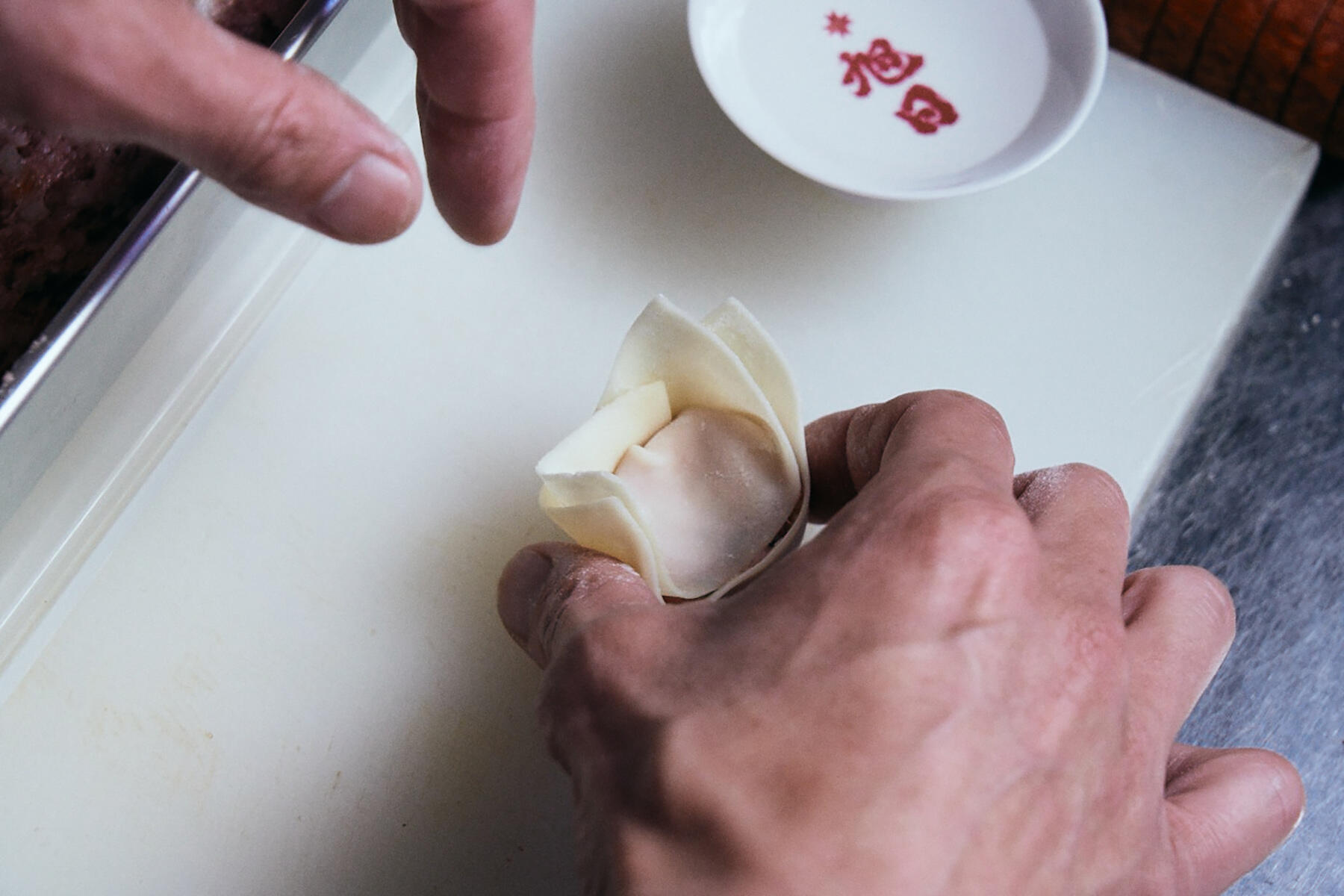 ワンタンの皮に2をのせ、端を2mmほどずらして2つに折る。折り目を下にして持ち、餡を中央に寄せて空気を抜き、皮の左下に水少々(材料外)をつけて、右下を内側に巻き込み、水をつけた部分に重ねて留める。平らな面にのせて餡を落ち着かせると、形が安定する。
