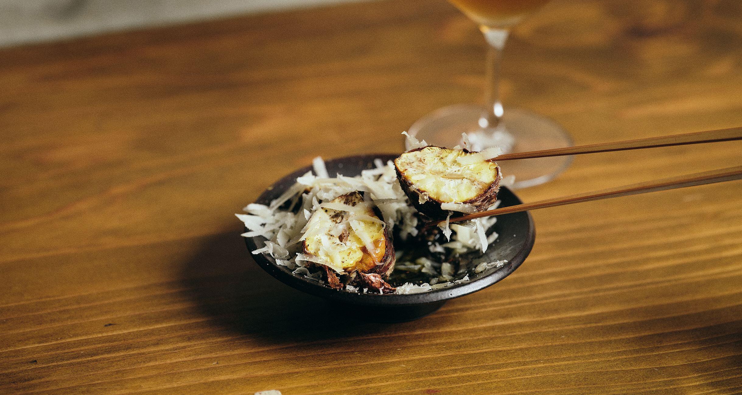 2を半分に切り、器に盛って塩、クミン、花椒をふる。オリーブオイルを回しかけ、ペコリーノロマーノを削ってかけて、完成。
