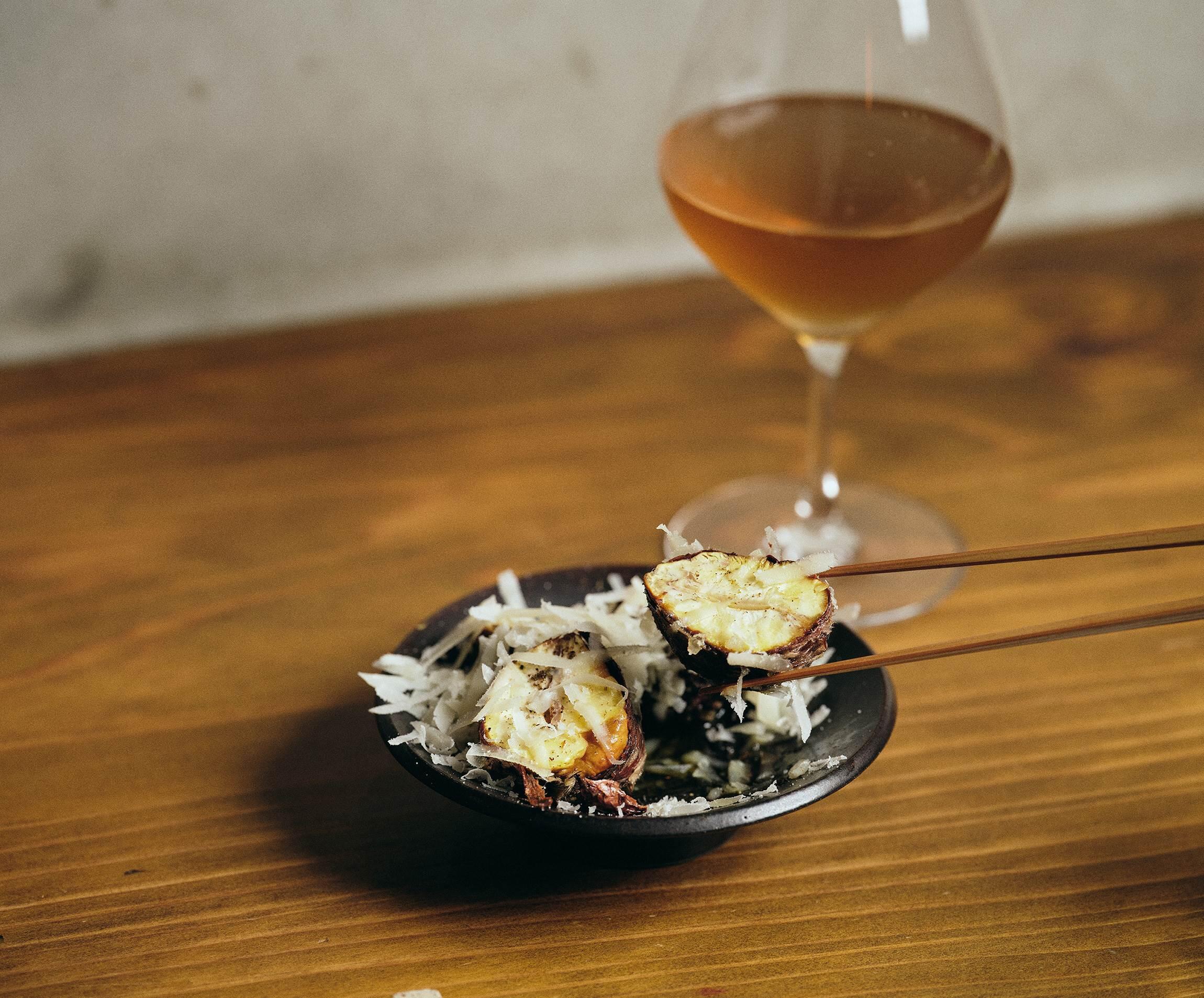 衣のようにパリッと揚がった渋皮の香ばしさ、クミンの香りと羊のチーズのコク味との驚きの相乗効果。こんな栗の使い方があったのか!と目からウロコがぼろぼろ。合わせるお酒の妄想が膨らんで止まらない。