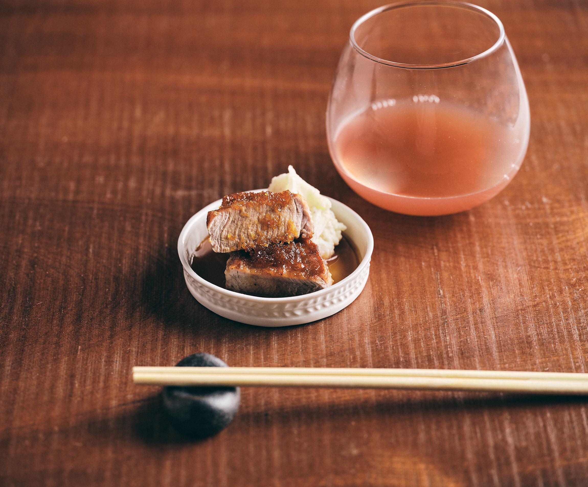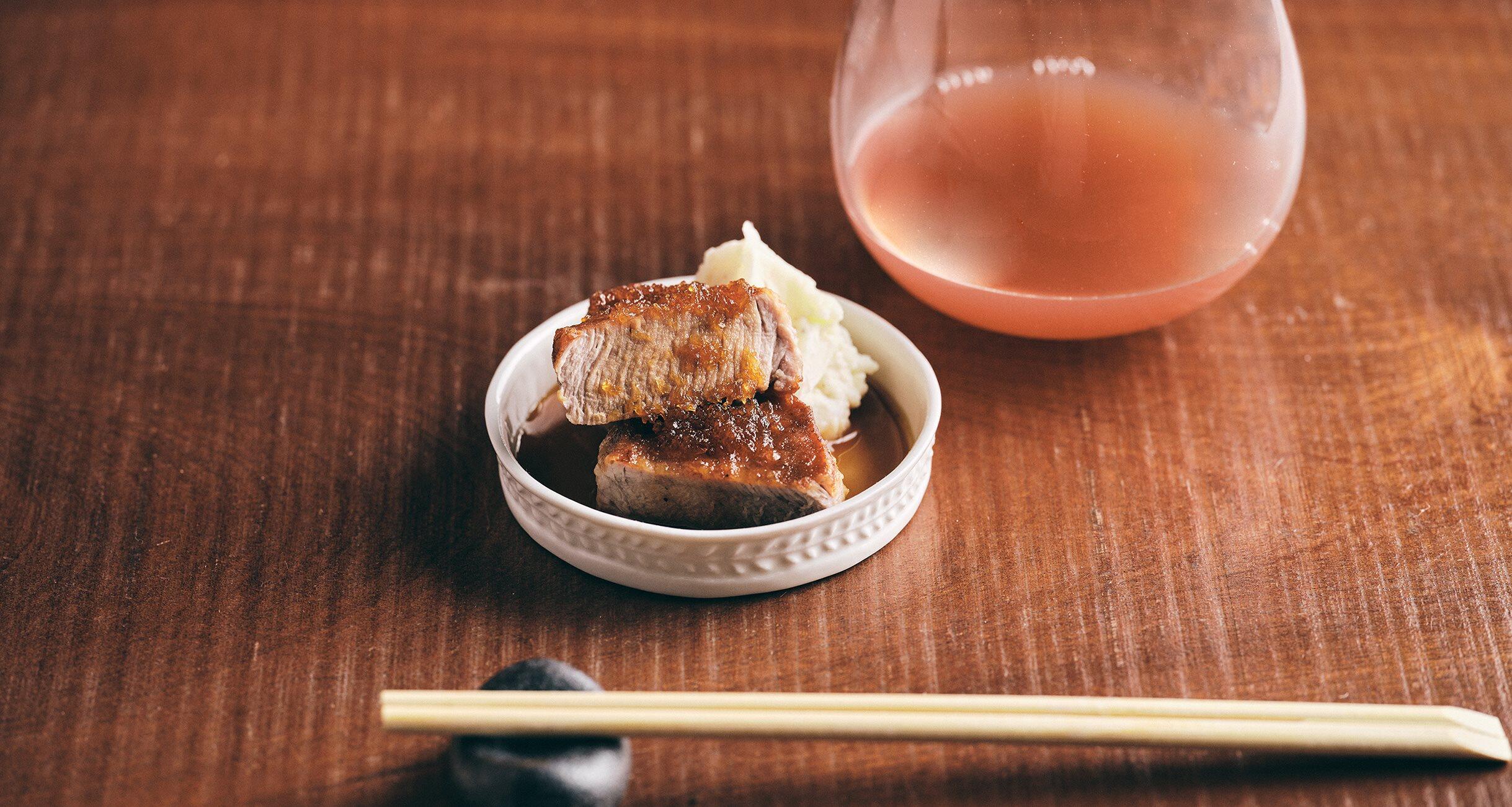 厚い豚肉をじっくり焼く。“焼きすぎ”くらいまでしっかり中まで火を通すことで、肉の断面に繊維が浮かび上がり、魔法のたれがよくからむ!柔軟な発想を持った東京・飯田橋にある酒場「ル ジャングレ」の有澤貴司シェフらしい、ユニークな組み合わせの豆皿つまみレシピです。