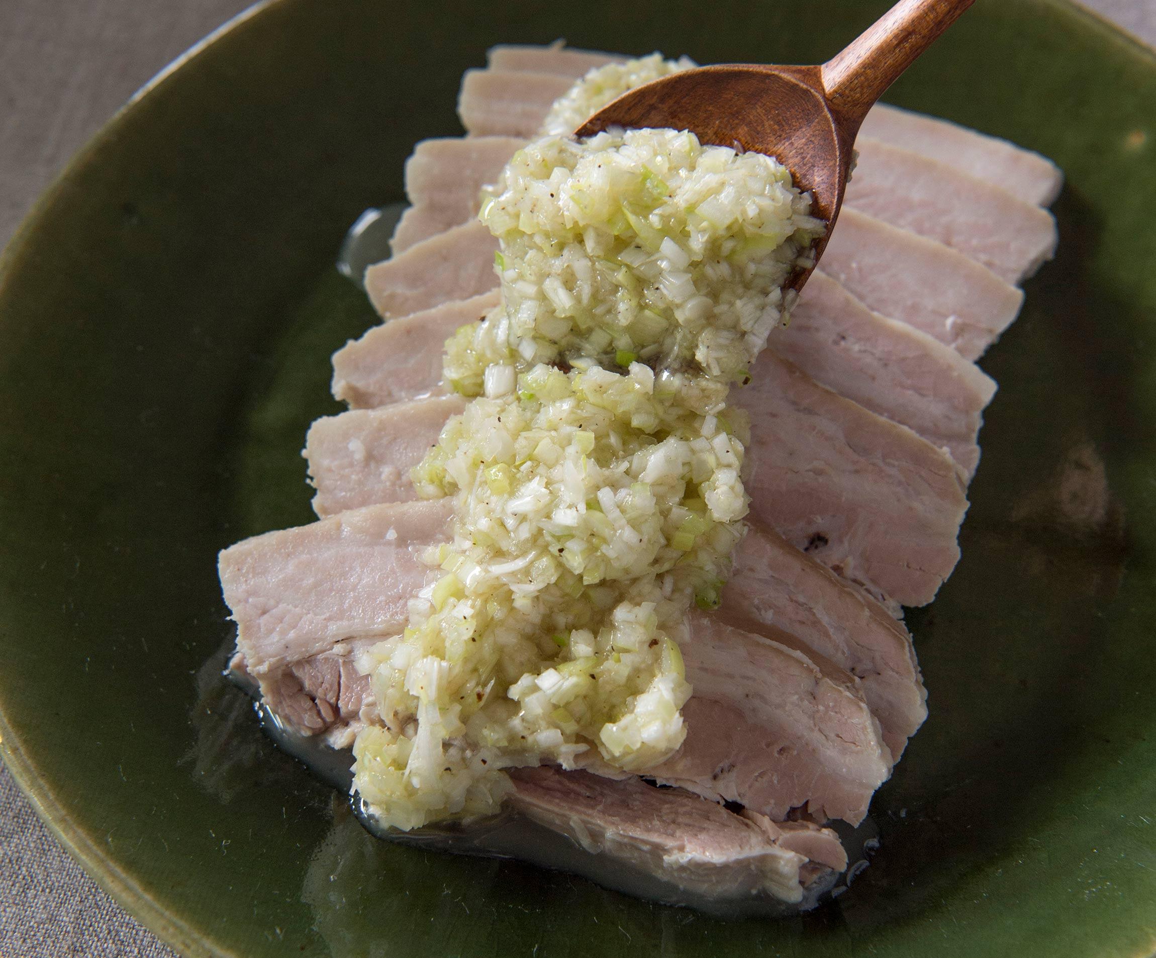 豚肉を取り出して厚さ1cmに切り、器に盛って、ねぎソースをかける。