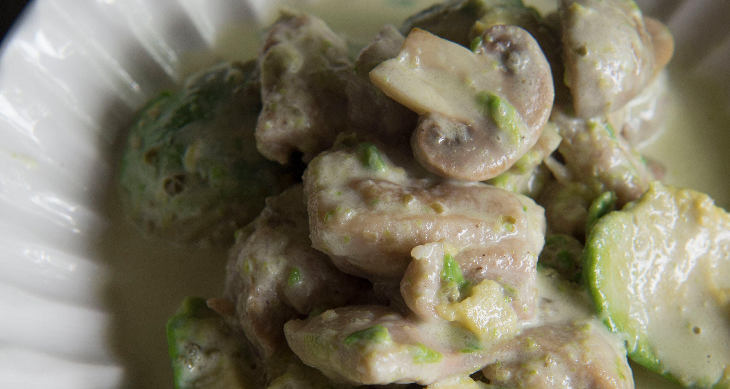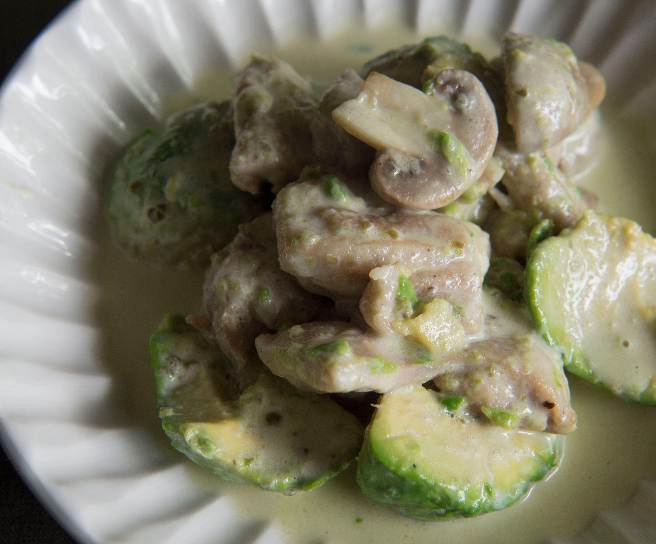 4に柚子胡椒を加えて混ぜ、アボカドを入れてやさしく混ぜ、生クリームを加えてひと煮して器に盛る。