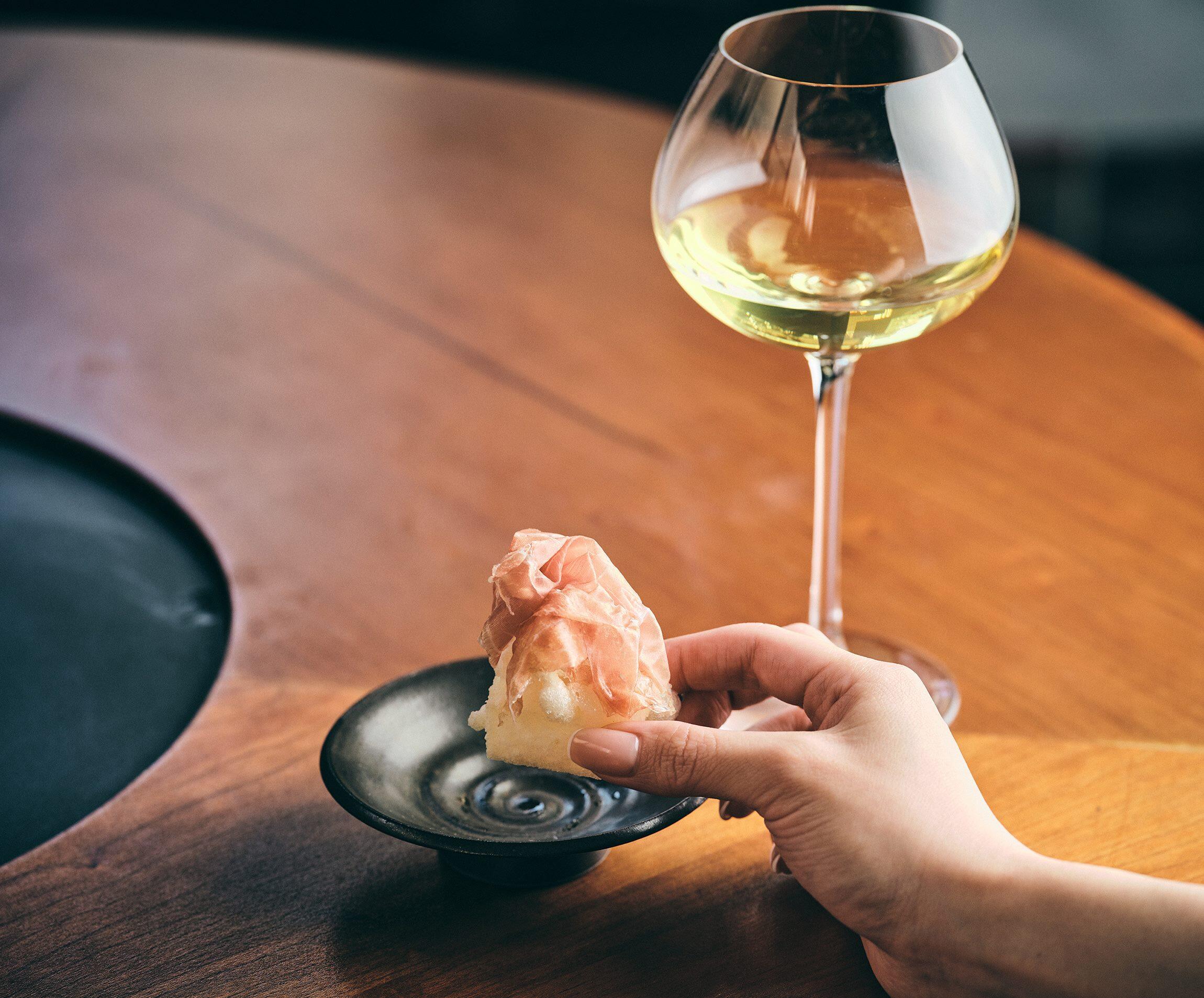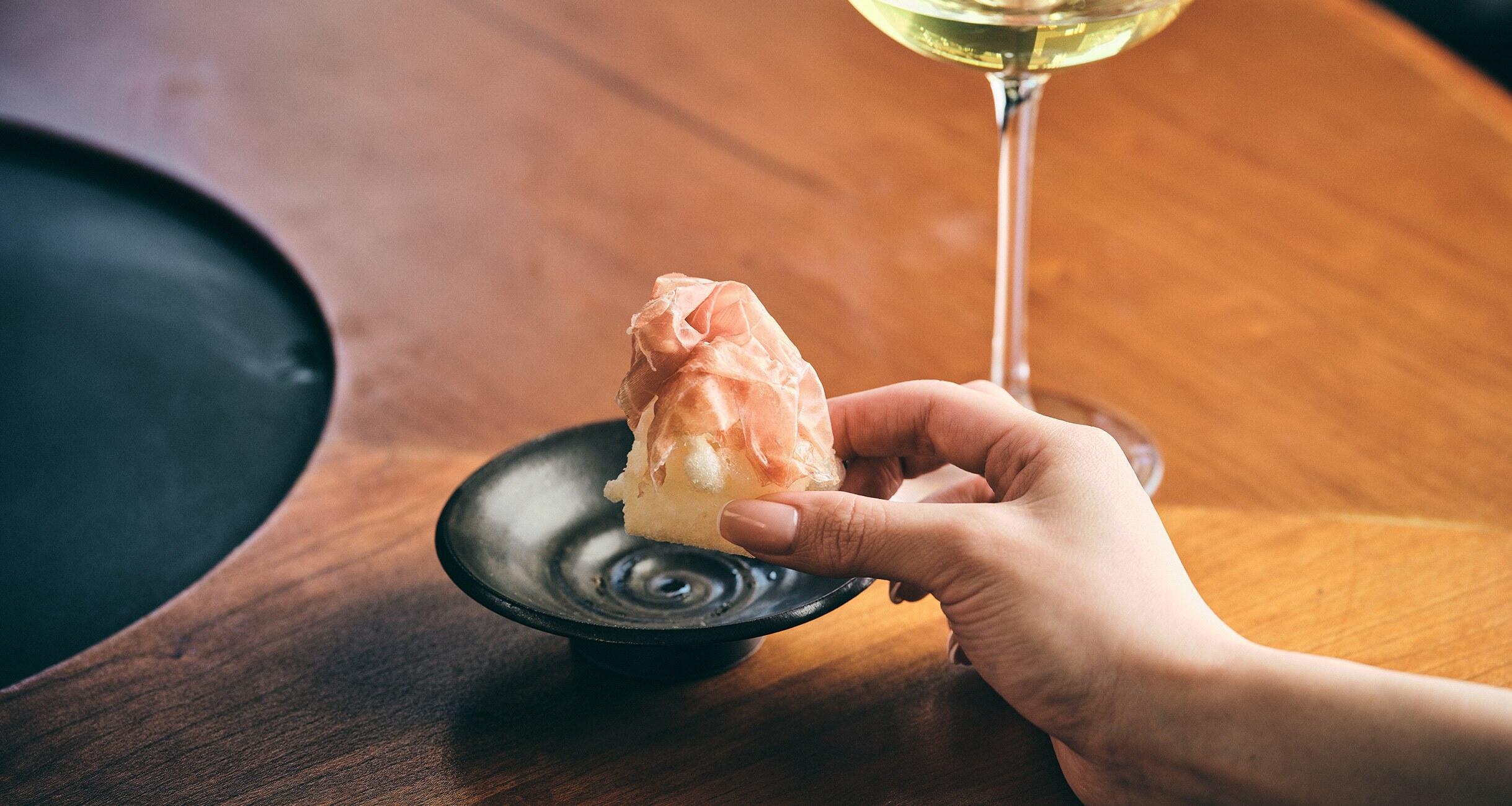 温かい揚げ餅の上で生ハムがとろんと緩んで、サクッとした食感と共に口いっぱいに熟成感ある肉の香りが広がる。その後はお餅のもちもち感を楽しめる。