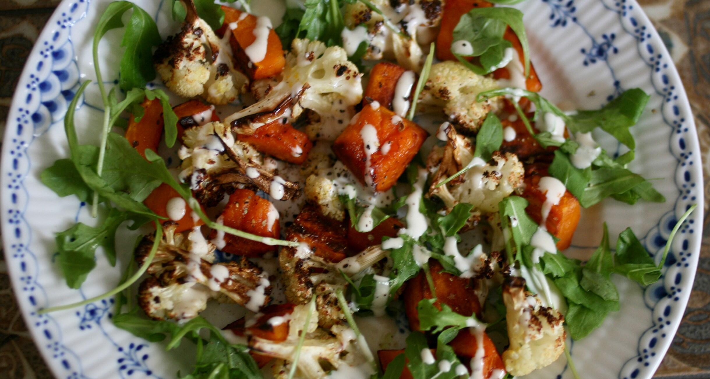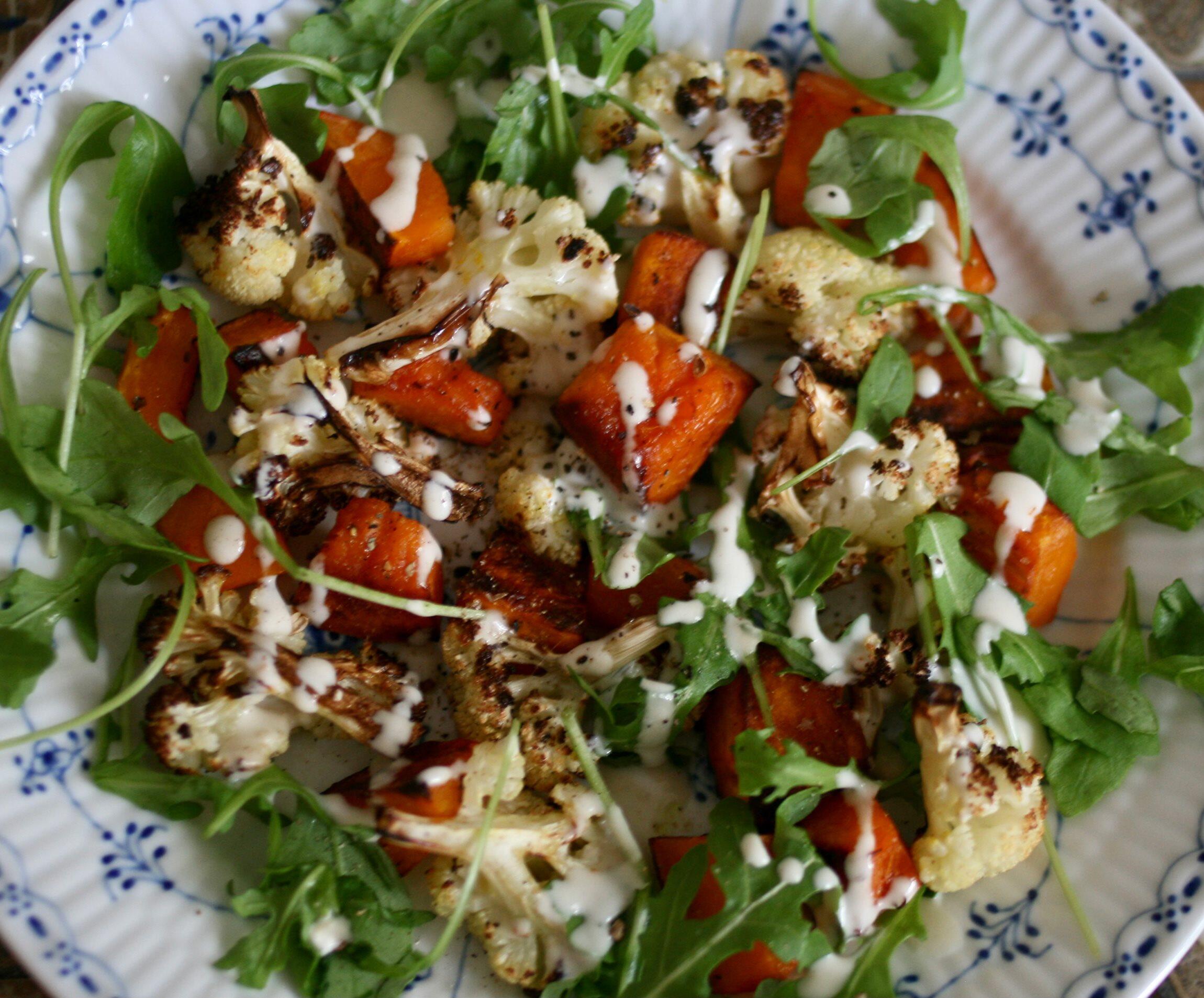 さて、今日はそんなタヒニを使った、最高に美味しい焼き野菜のサラダをご紹介しましょう。「カリフラワーとかぼちゃで作る、野菜のロティ、タヒニソースがけ」。サラダ一食で、昼のカロリーや空腹をおさえ健康を維持したいと考える方々、行動的で美しいマダムたちに、とくに愛されていますよ。
