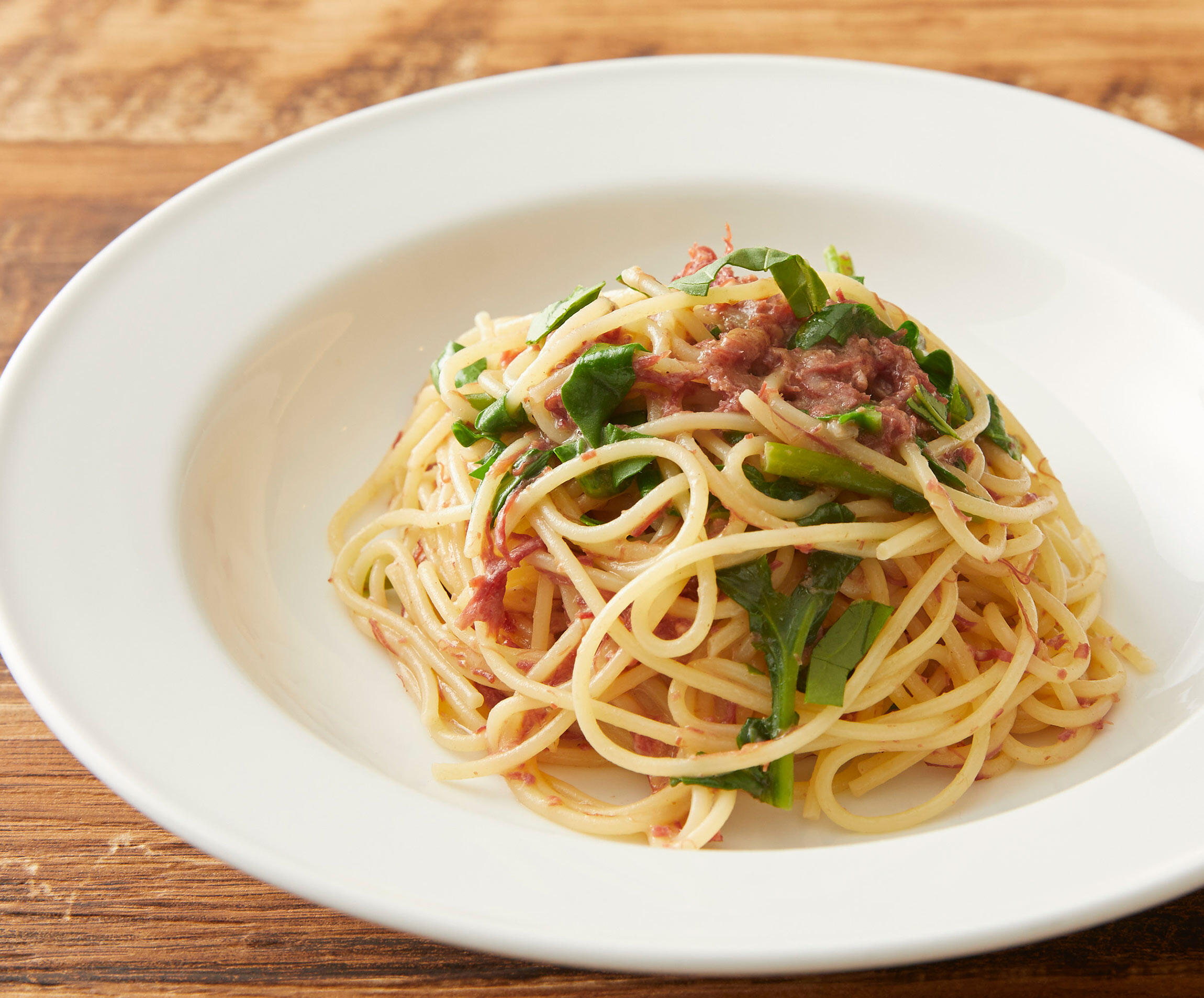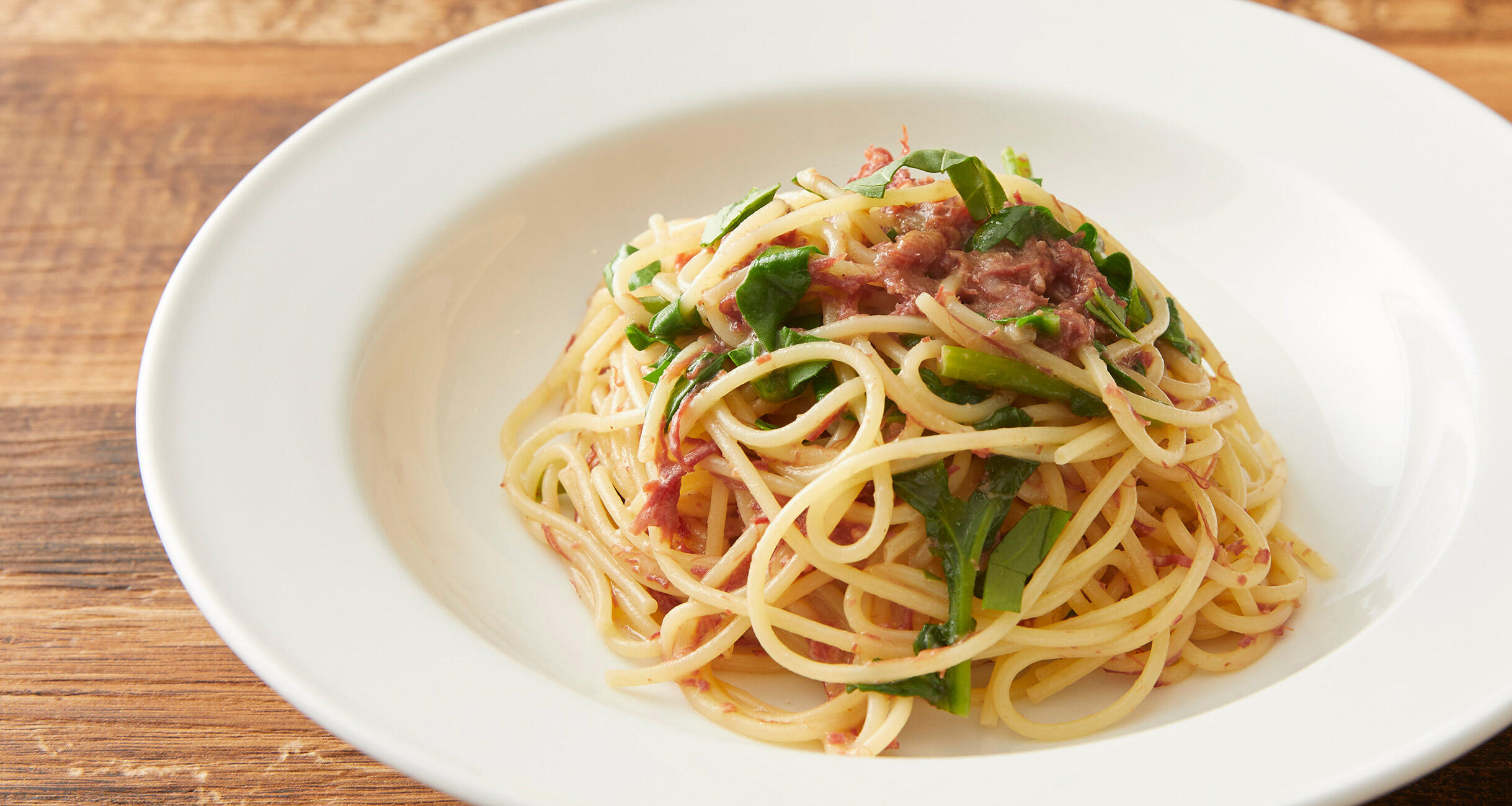 スフィラッチはルッコラと組み合わせるのが一般的なので、今回のパスタもルッコラと一緒に。仕上げの赤ワインビネガーのひと振りで、コンビーフがグンッとフレッシュになるので、お忘れなく。パスタでなく、そのまま食べる時も赤ワインビネガーを振りかけてみてくださいね。コンビーフは繊維質な食感なので、パスタは若干硬めに茹で上げて、それぞれの食感のコントラストを楽しむのも良いですよ。