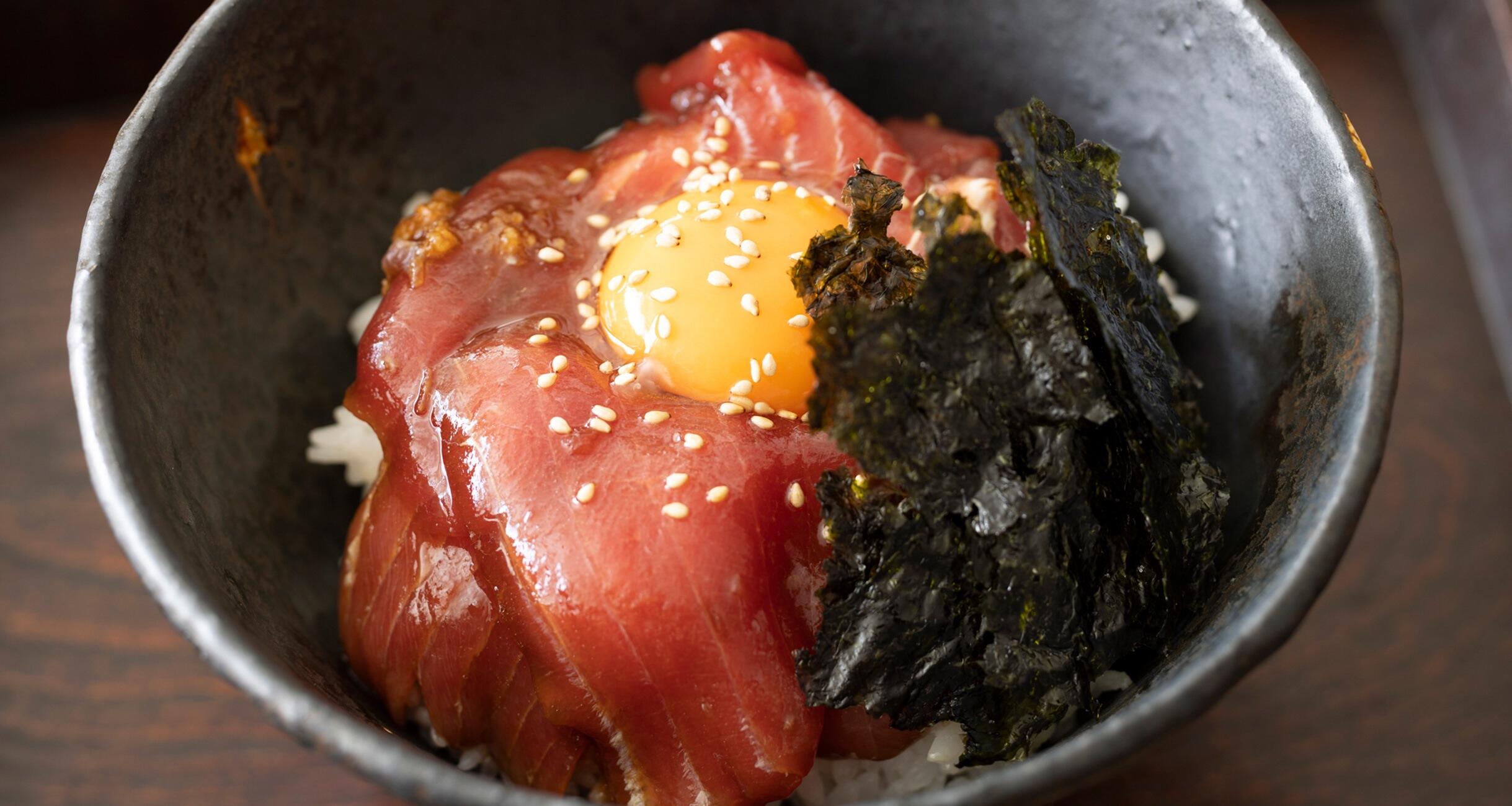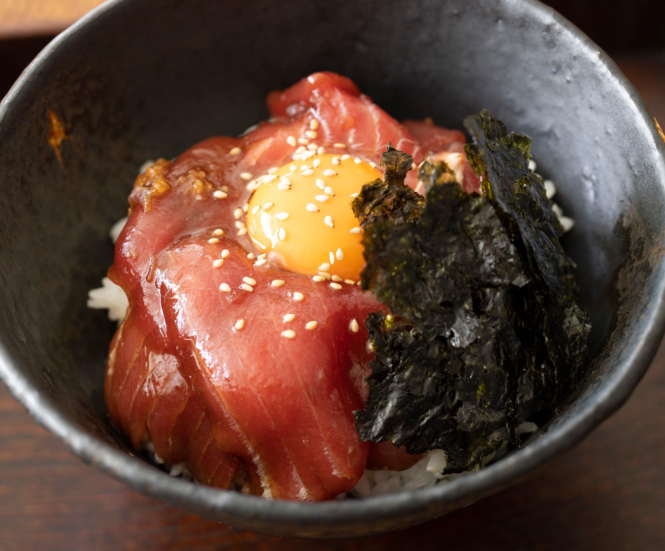 胡麻油とにんにくを効かせたユッケ風まぐろ丼。卵黄のコク、にんにくや胡麻油の香りが食欲をそそる。