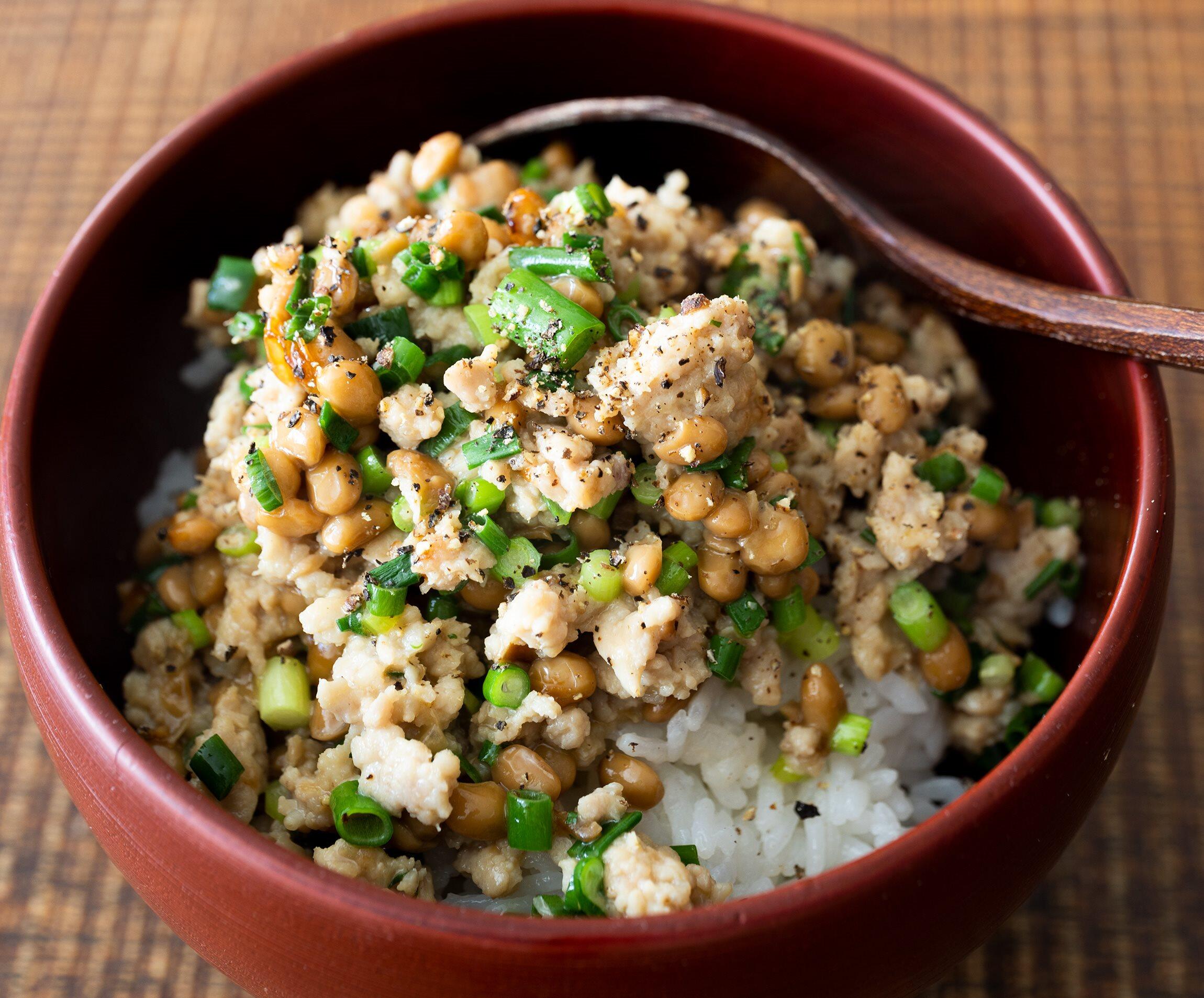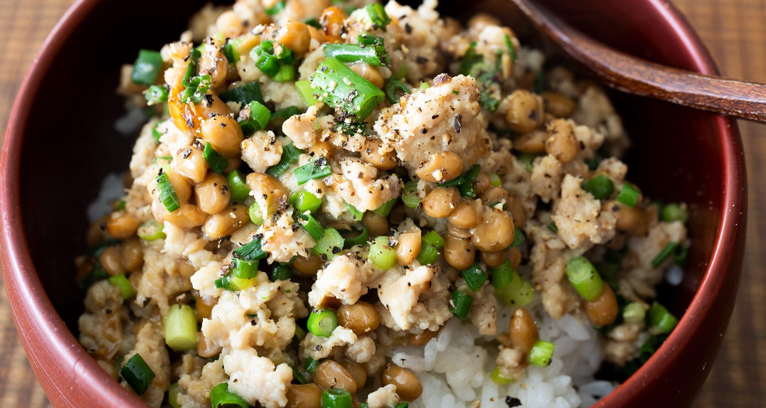 挽き肉の色が変わり始めたら、納豆、付属のタレ、醤油を加えてさらに炒める。