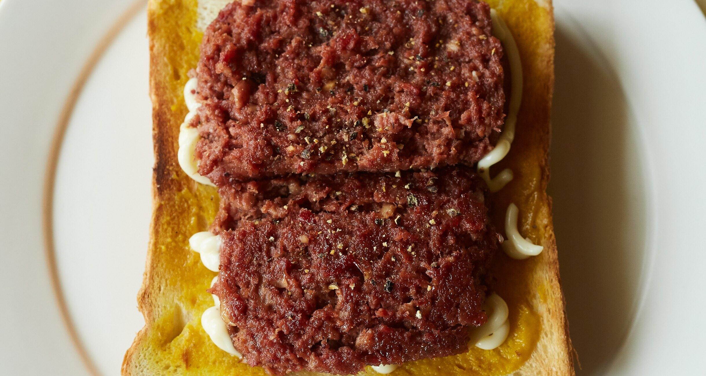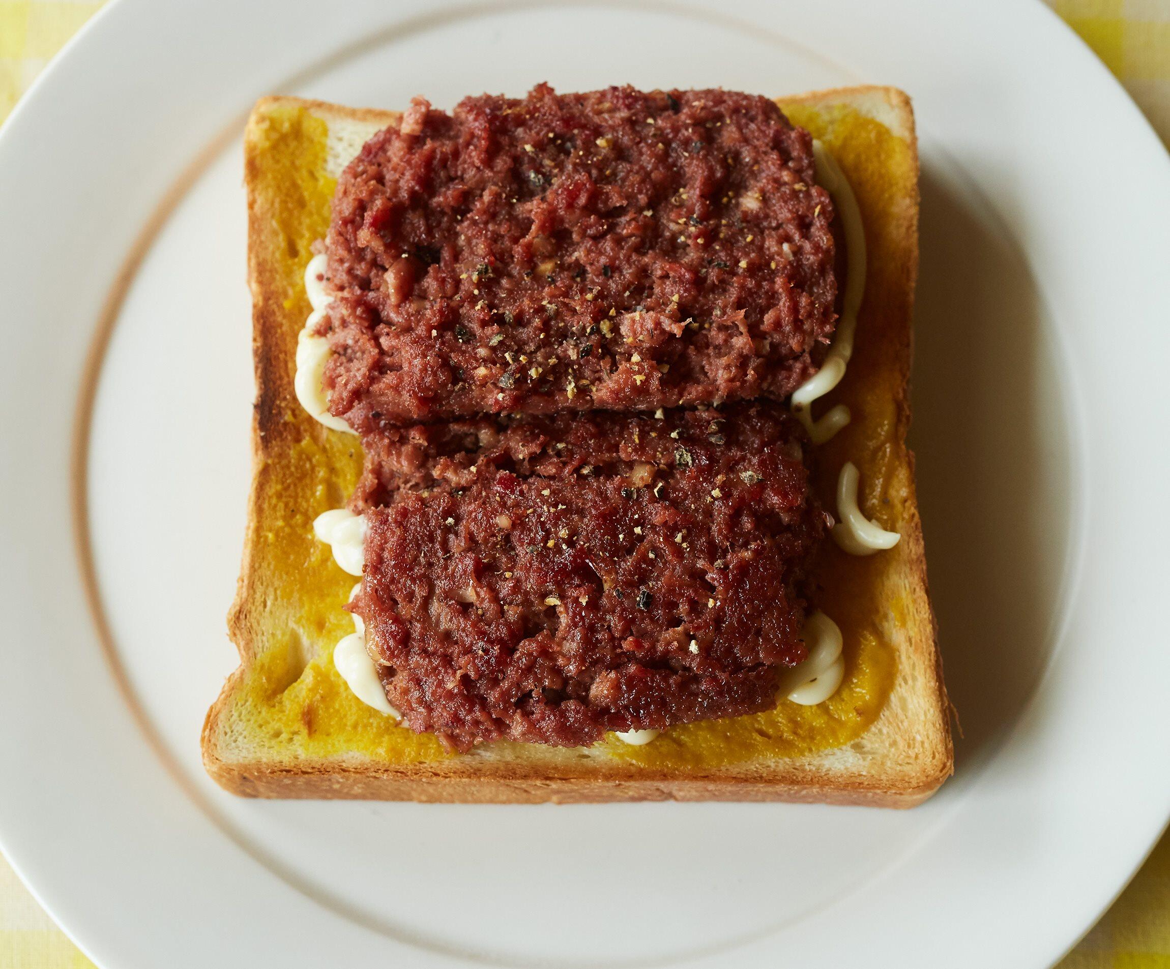 コンビーフは味が濃いから、組み合わせるパンはカリッと焼いたトーストに限る。このバランスがおいしさそのもの。フレンチマスタードの代わりに練りがらしを使っても。