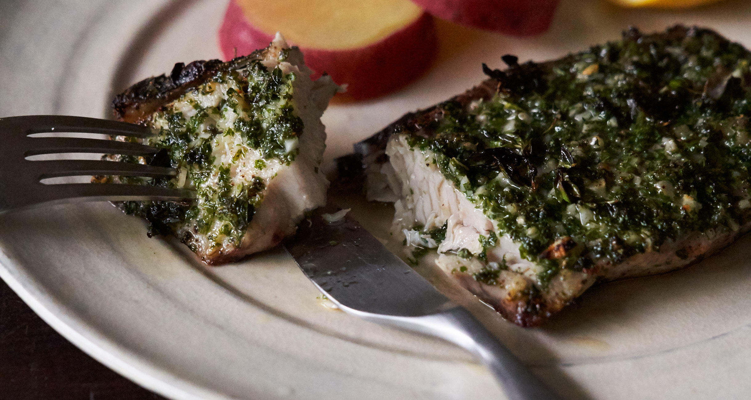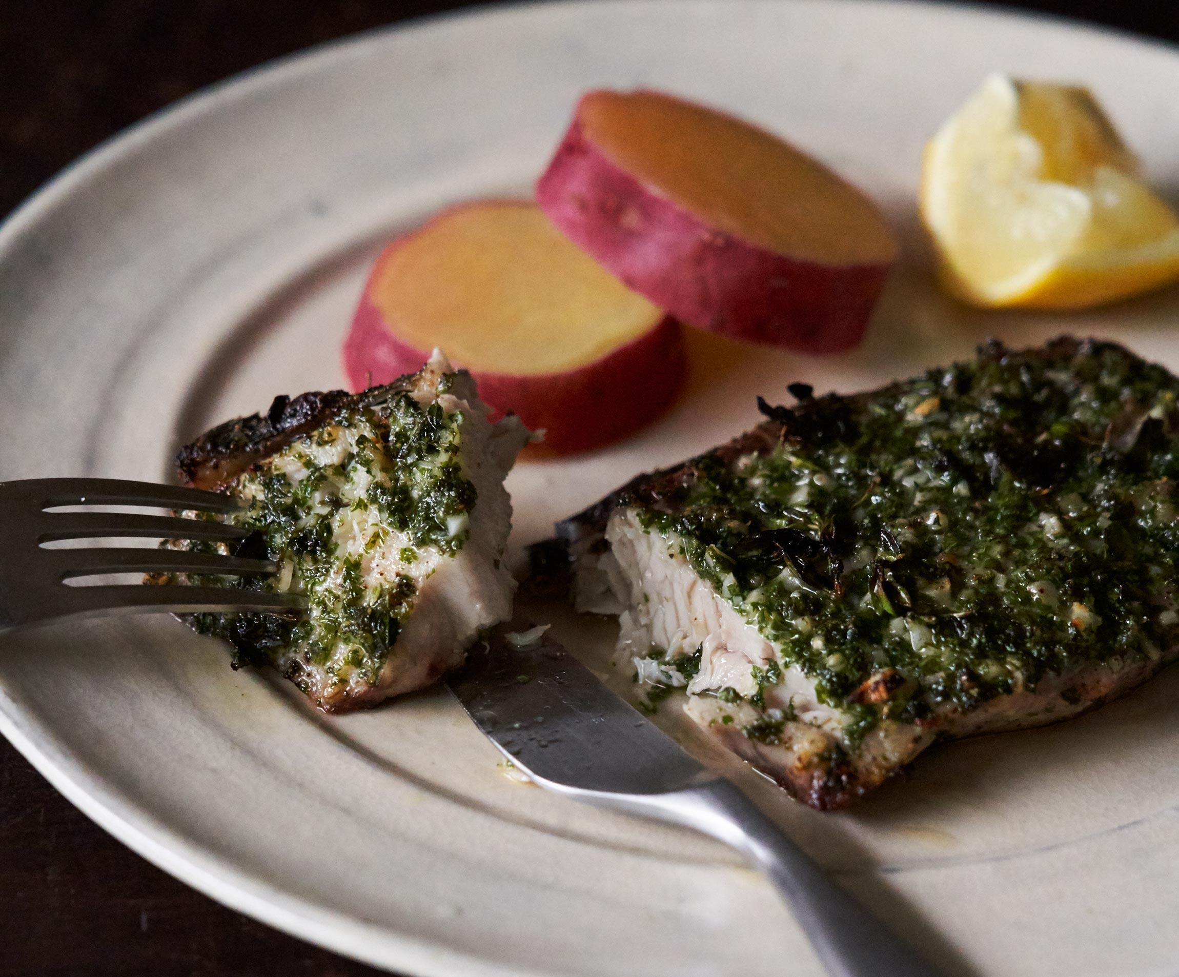 マリネしてあるので、身はしっとり、外は香ばしく仕上がります。にんにく生姜風味のパセリソースがさらに食欲を高め、白ワインを呼ぶ一皿です。塩味をつくる塩、醤油、味噌の3つを軸に、余分な調味料を省いた「これで決まり」の引き算料理を料理研究家の大庭英子さんに教えてもらいました。