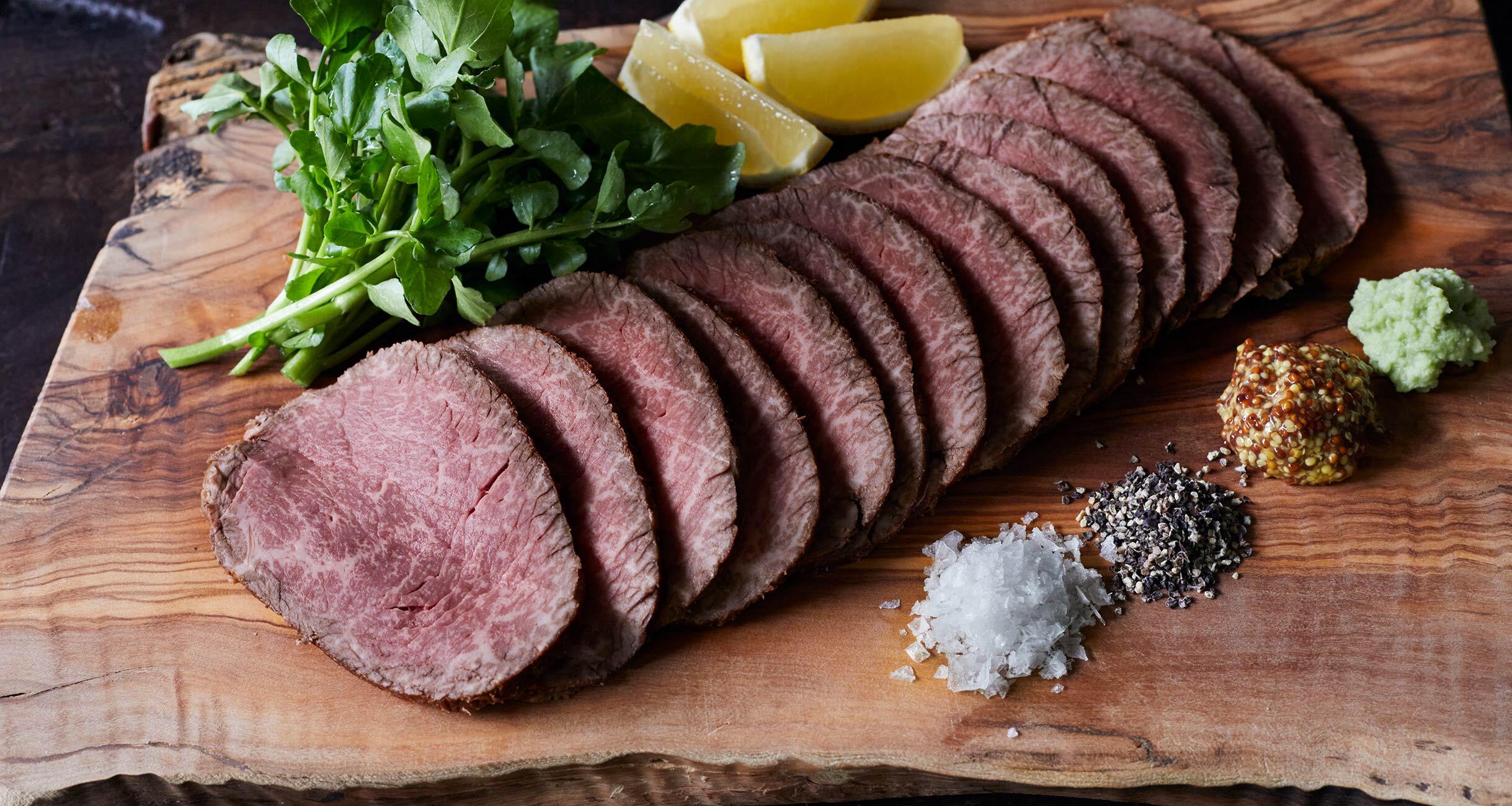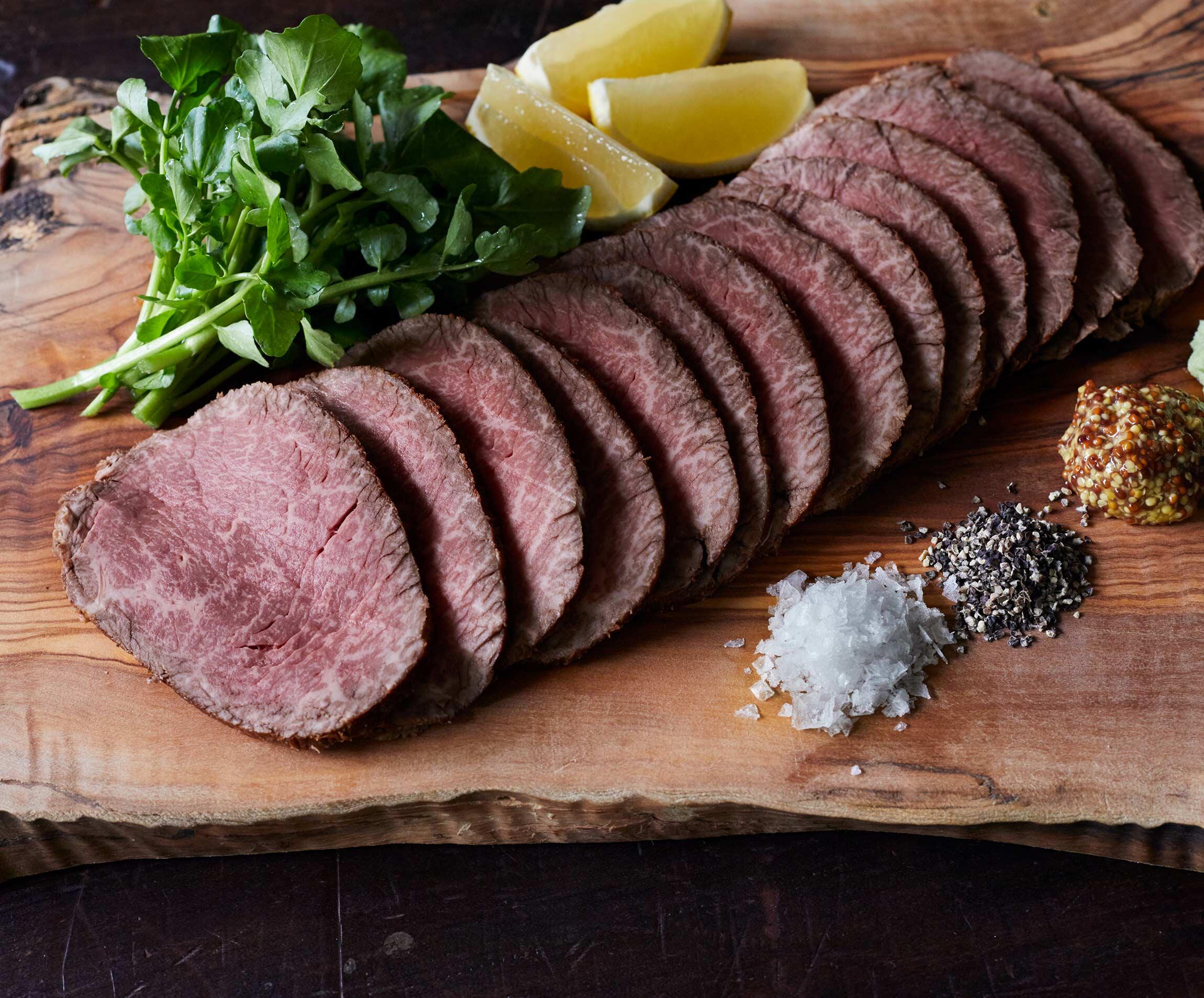 ローストビーフは年末年始にぴったりの文句なしのごちそう。中にほんのり赤く残るのが最高の焼き加減です。切って空気に触れると赤が鮮やかに!