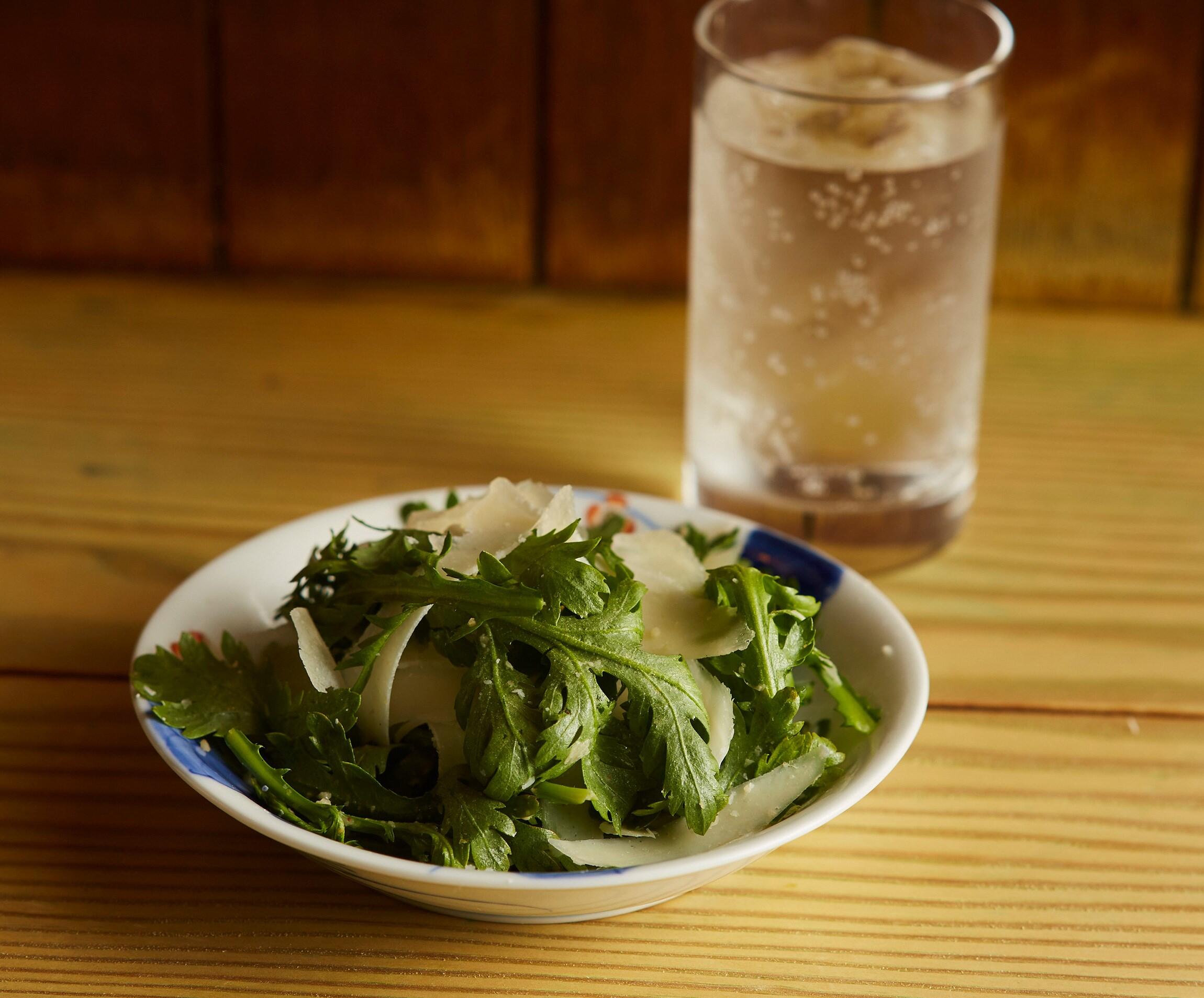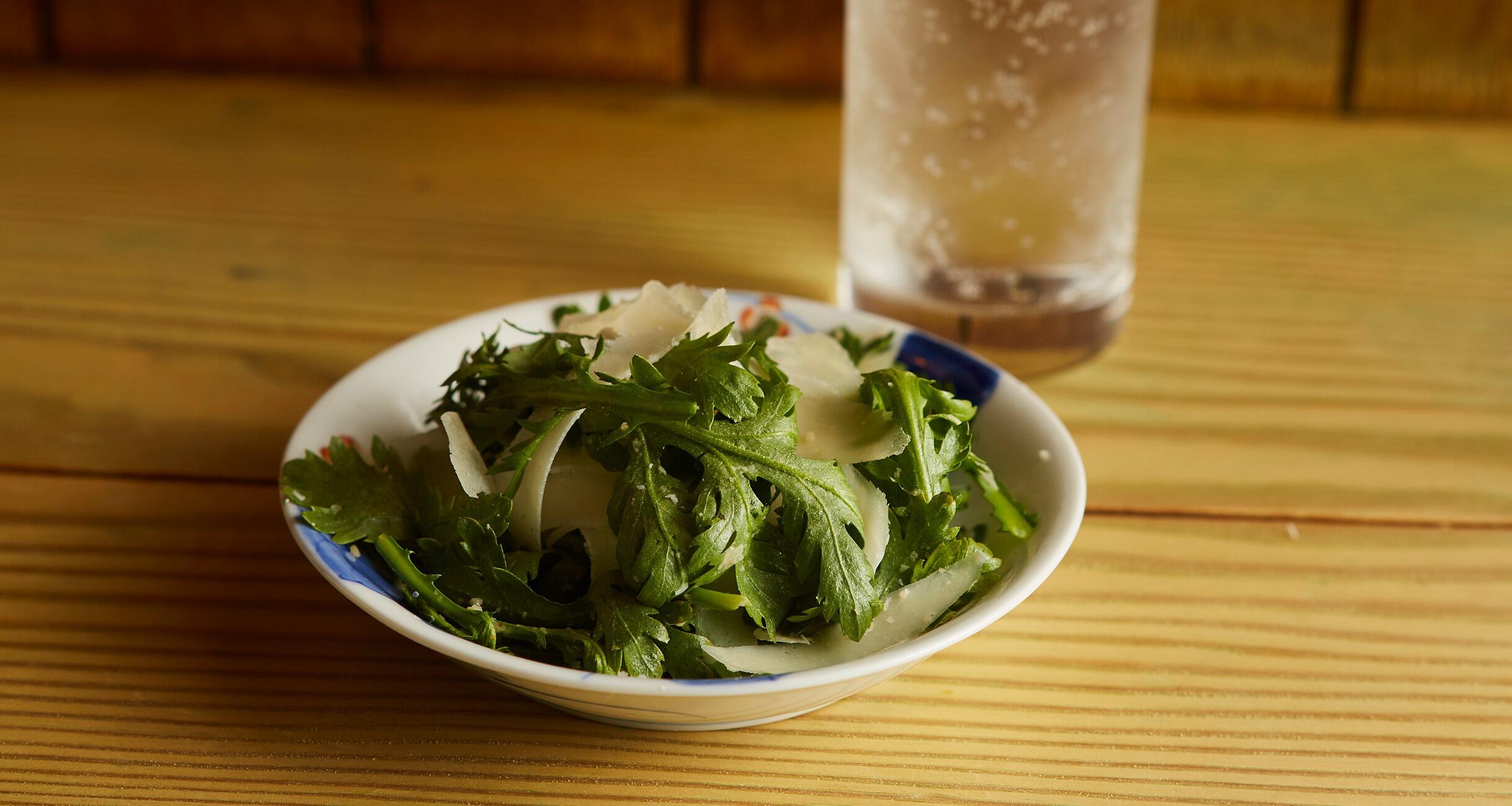ほろ苦い春菊と旨味の強いパルメザンチーズは好相性。スパイスの香りと爽やかな柑橘の酸味が加わって、とっても味わい豊か。