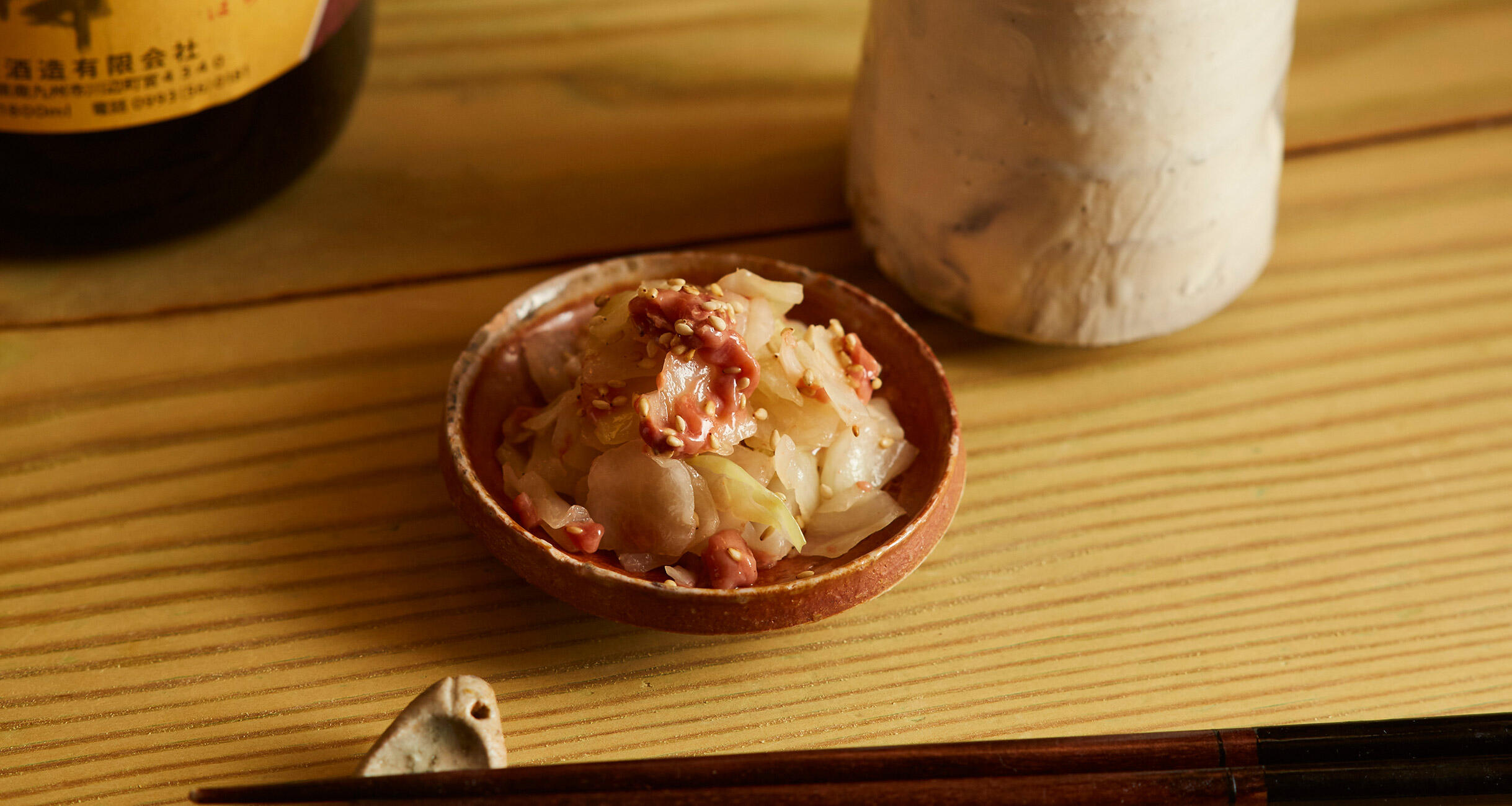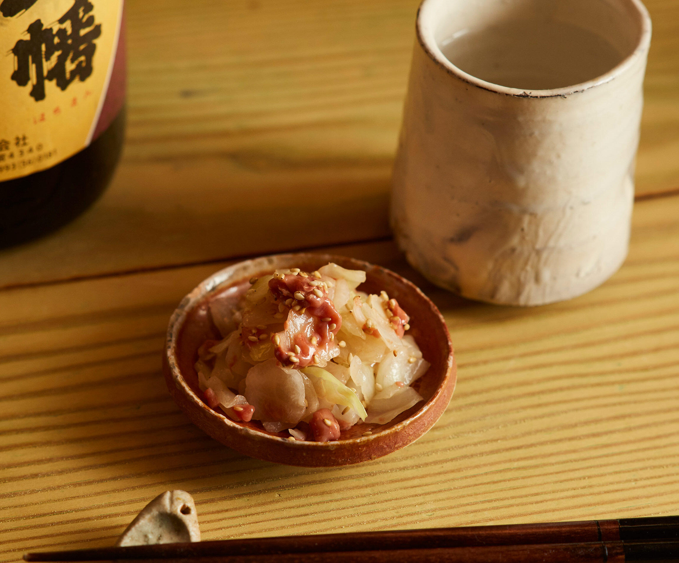 程よい歯ざわりのキャベツと酒盗の存在感、そしてふんわりと胡麻油が香る優しい味わいです。常備しておいて気が向いたら一杯、なんてときにぴったり!365日でも飽きない焼酎に合うおつまみを「赤坂まるしげ」店主に習いました。