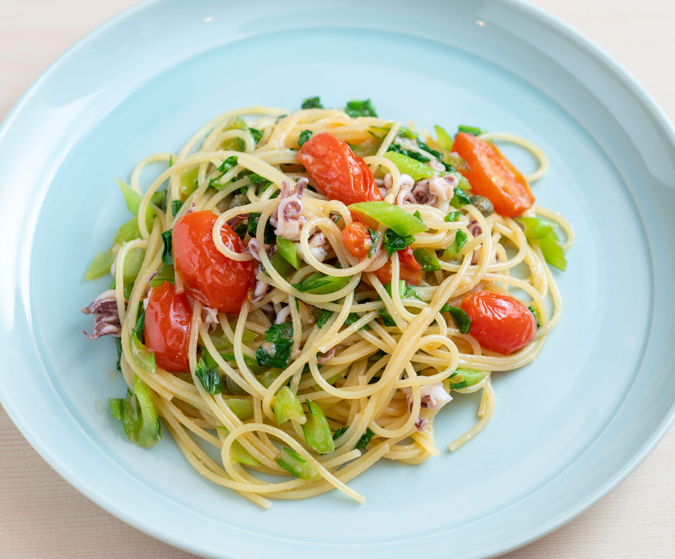 とにかく、イカはとても好きな食材なので、無駄なくいただきたい。買ってきたイカの胴体部分はグリルやフリットに、ワタは塩漬けに(塩漬けイカワタは調味料として使います)。残ったゲソとミミは食感を活かしたパスタにするのがお気に入り。ミミとゲソは胴体部分とは違い、加熱しすぎで硬くなっても気にならないところもパスタ向き。使う野菜は、小松菜ではなく、ルッコラやセロリでもいい。酢漬けのケイパーが無いのなら、梅干しでもいい。大好きなイカを使ったパスタだから、正直何でも好き。