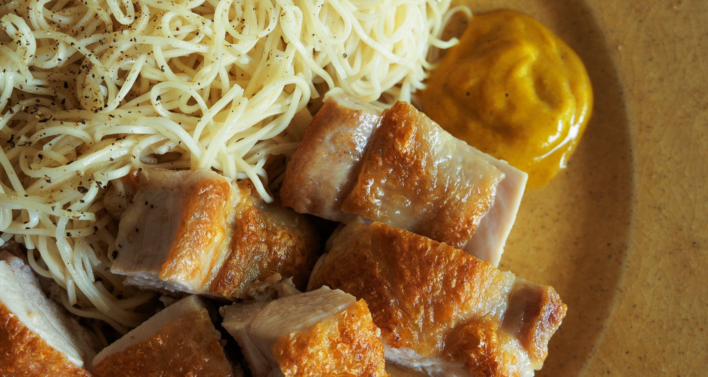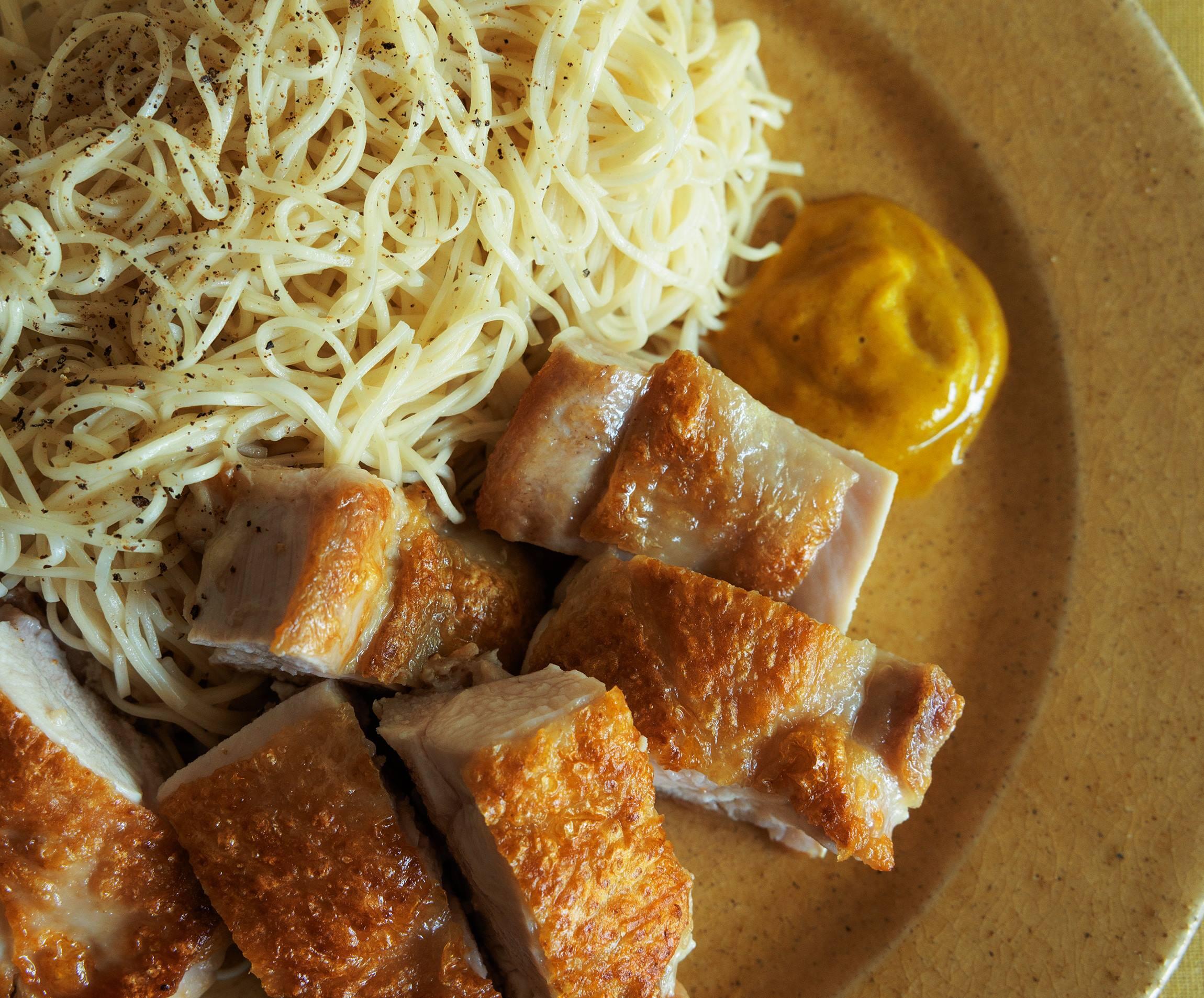 焼きそば、鶏のソテー、どちらも主役。あえてソースはかけず、塩、胡椒、からしでガッツリと。喉ごしがよく、食材との相性も選ばない「香港的」焼きそばを、料理研究家の大庭英子さんに教えてもらいました。