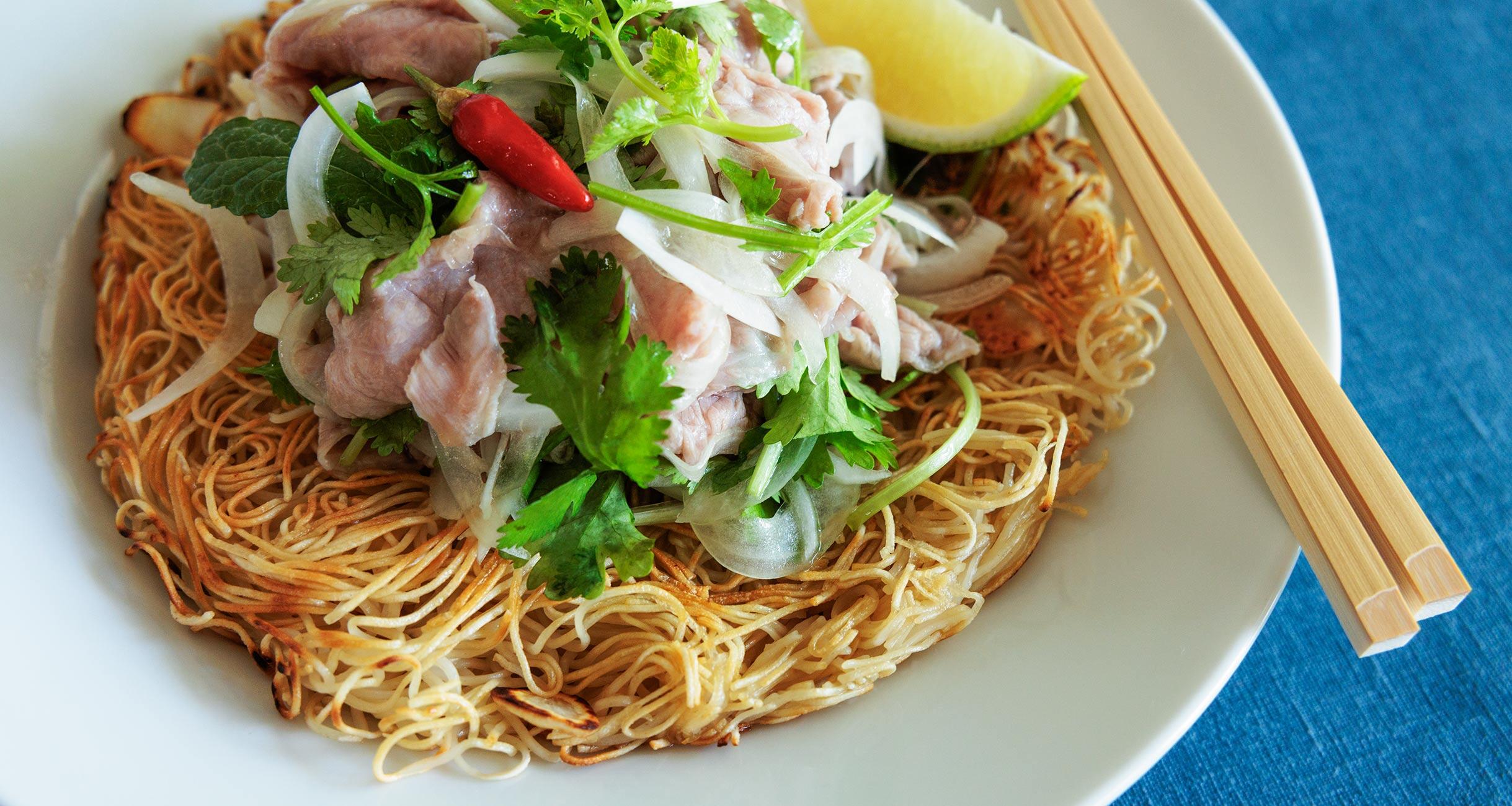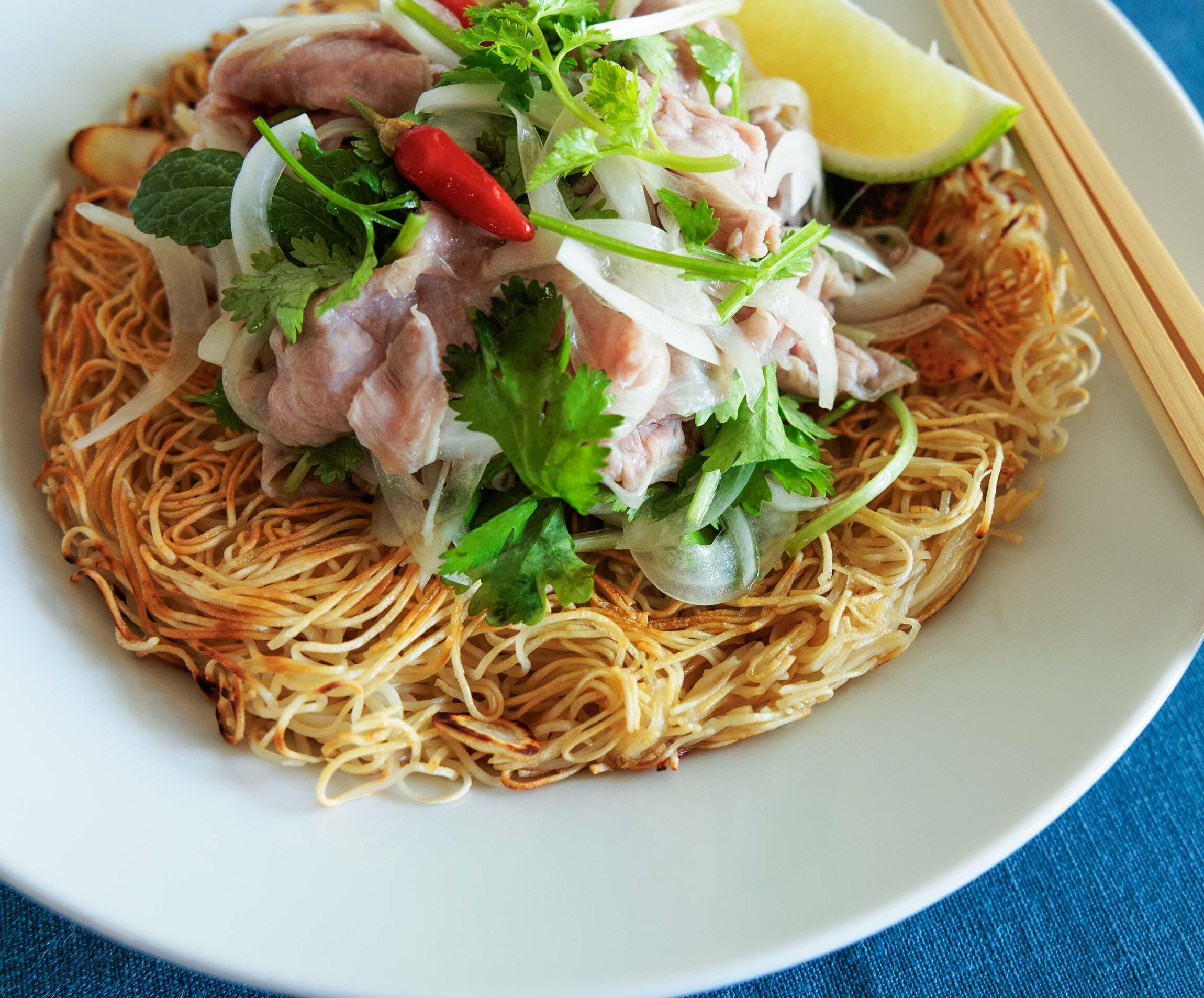 極細で歯切れのいい香港麺は軽い食べ心地なのでサラダとの相性も抜群。ここではナンプラー風味の牛しゃぶサラダをたっぷりのせて、ランチ向きの一皿に。喉ごしがよく、食材との相性も選ばない「香港的」焼きそばを、料理研究家の大庭英子さんに教えてもらいました。