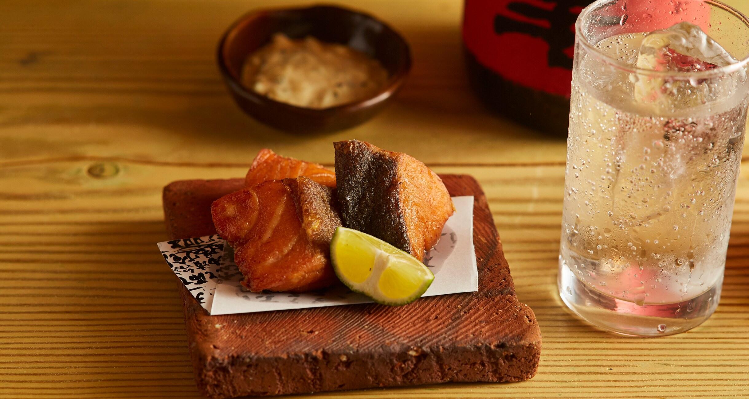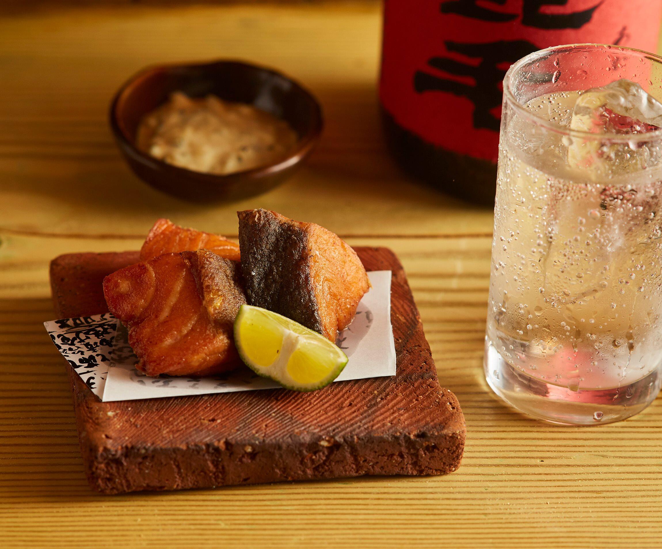 生姜醤油味の鮭は、揚げたとは思えないほどさっぱり。そのままでもおいしいが、漬物入りの風味豊かなタルタルソースと味わえば一層酒が進む。お薦めは口当たりの柔らかい麦焼酎「赤鹿毛」。