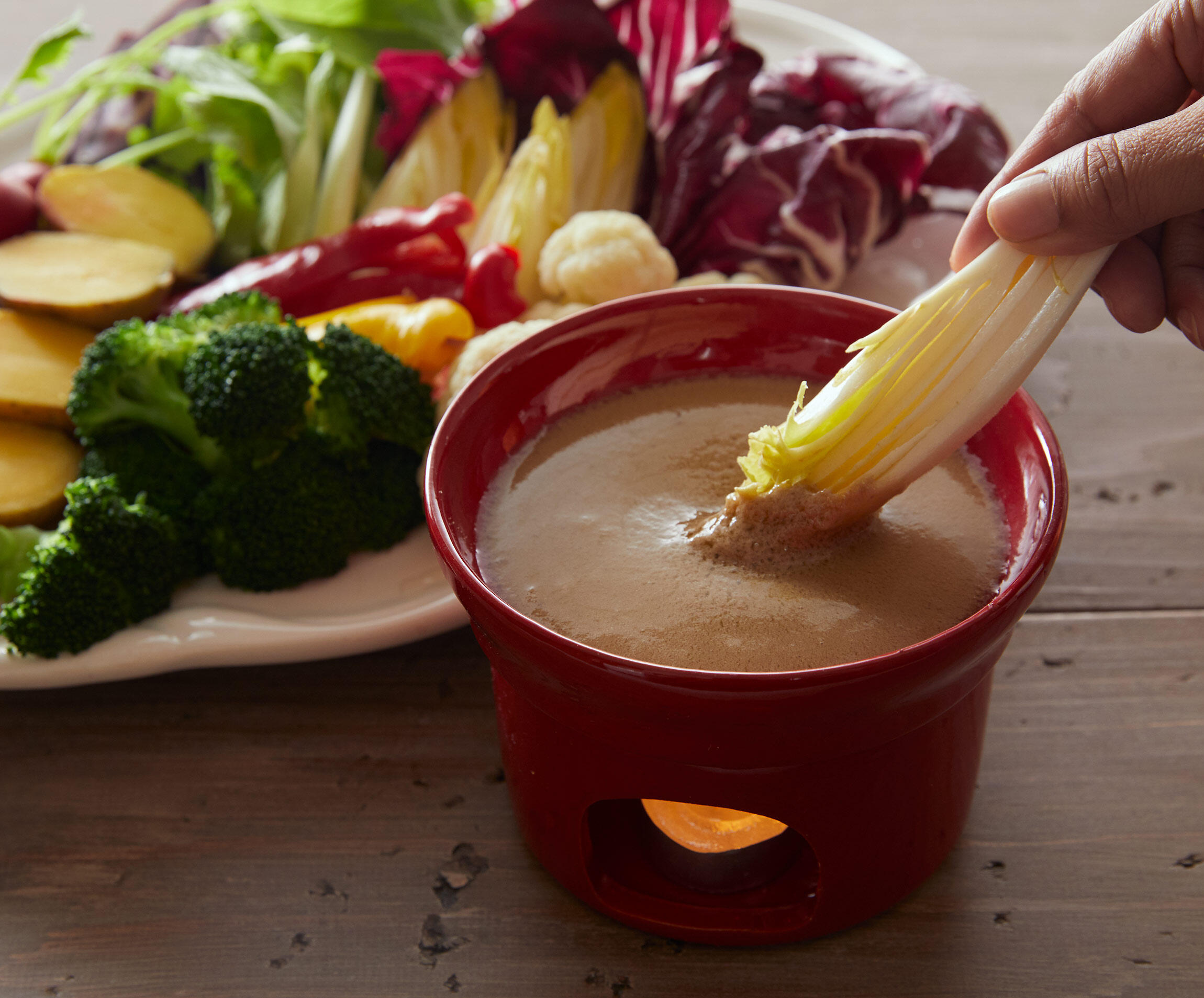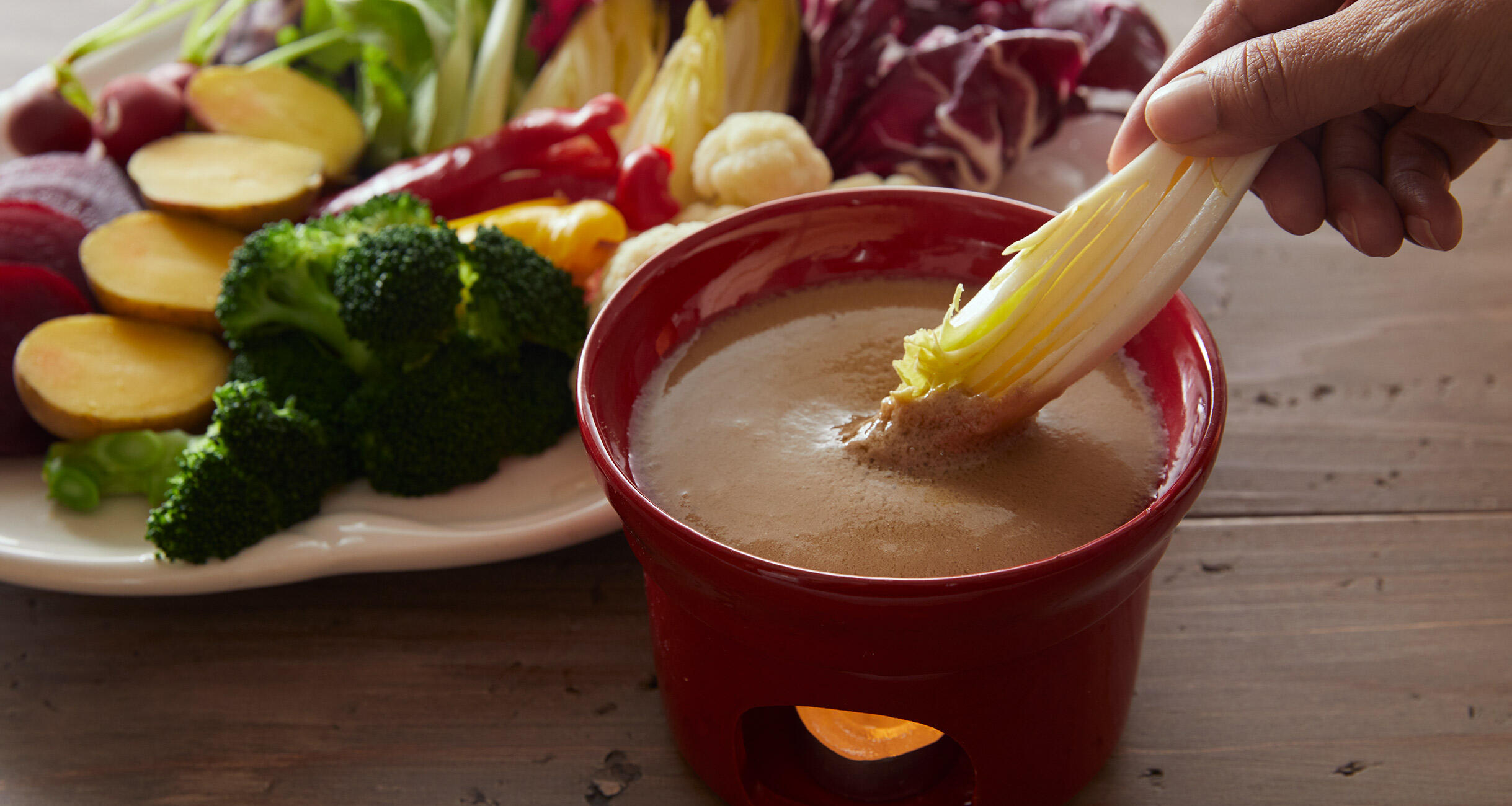 セロリ、パプリカ、にんじんはスティック状に切り、トレビス、チコリなどは食べやすい大きさにちぎる。じゃがいもは皮ごとゆでて食べやすく切る。ビーツはアルミ箔を巻いて160℃に予熱したオーブンで約1時間、竹串がすっと入るまで焼いてから皮をむき、厚さ1cmに切る。カリフラワー、ブロッコリーは小房に分け、塩ゆでする。